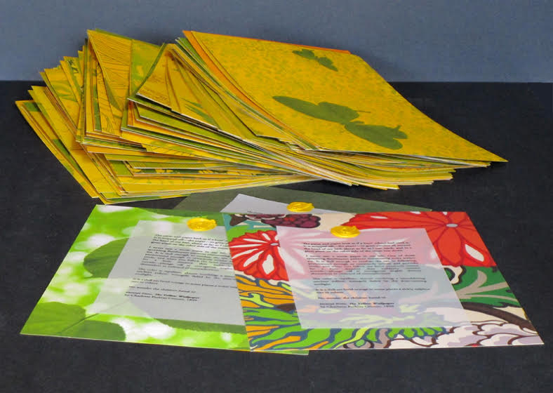 The Yellow Wallpaper captures two other aspects of Bart’s work. The title refers to Charlotte Perkins Gilman’s canonic short-story/novella. Like many artists of the book, Bart often springboards from a literary figure’s work. Here, it is an excerpt from Gilman’s story printed on translucent paper and wax-stamped to one side of a page taken from Charlotte Abrahams’ Wallpaper: A Collection of Modern Prints. The reverse side of the print is painted in cadmium yellow. At the exhibition where the work was displayed, Bart gave it away.