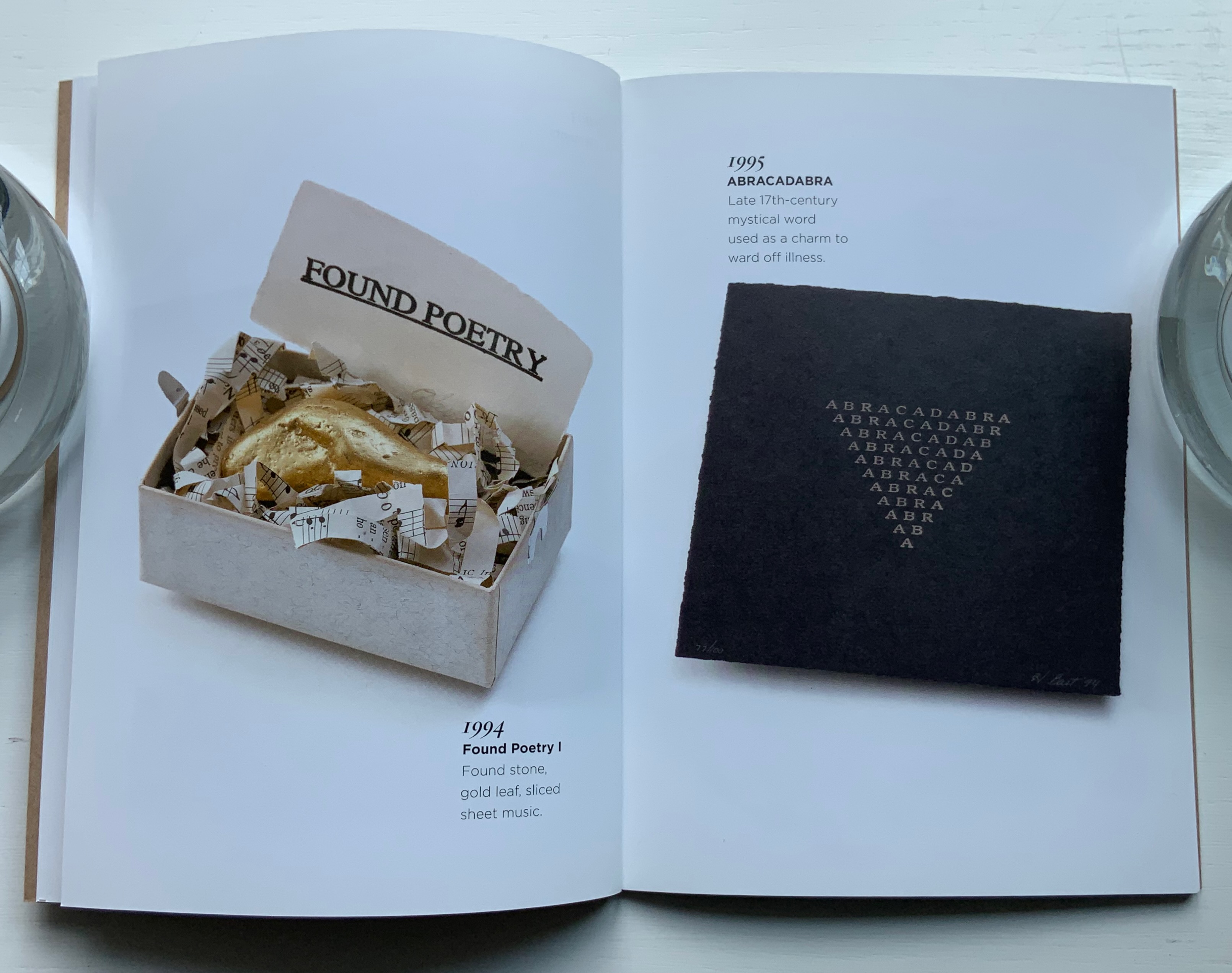 While Abt’s introductory essay rings the historical changes on the roots of book art — once there was Mallarmé’s Un Coup de Dés, but before Mallarmé, there was William Blake — the works included and the catalogue’s design ring some chimes of their own about book art. One way or another, all book art self-consciously draws attention to some particularly bookish element. For the most part, the 49 works listed in the catalogue ring true. The catalogue design itself, however, chimes not only to that notion of self-reflexiveness but also to wider notions about the nature of book art within contemporary art.