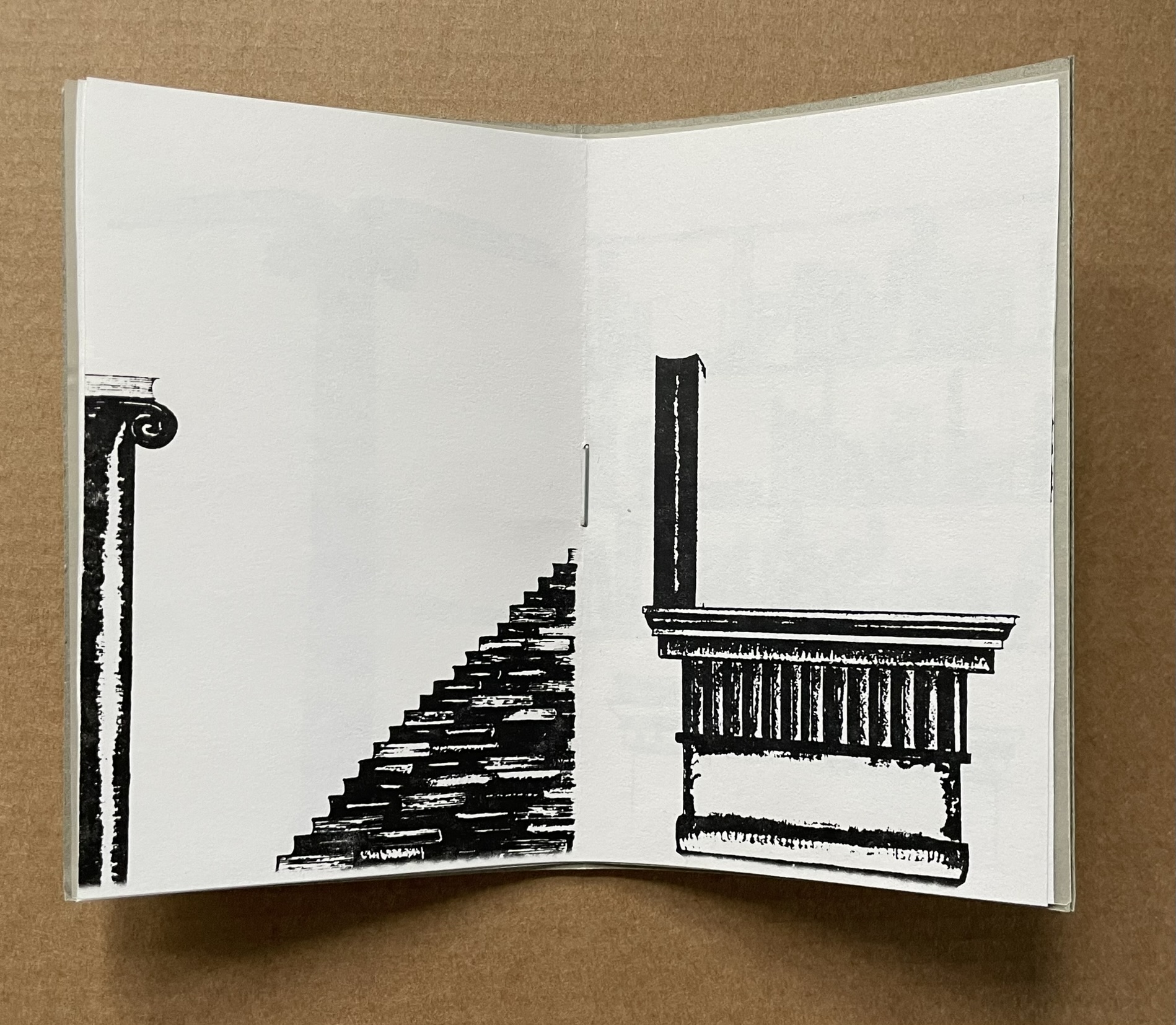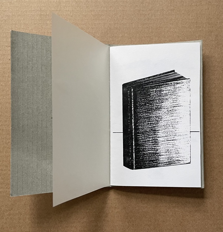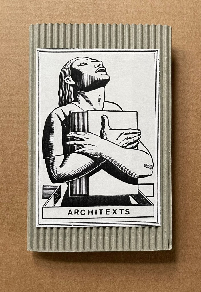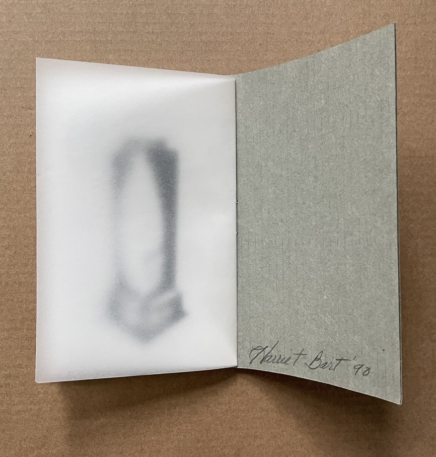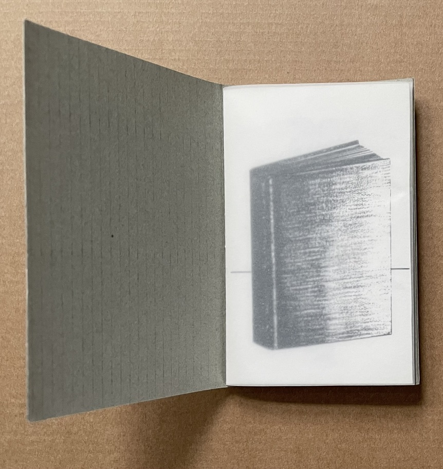 Architext (1990) Harriet Bart Booklet, saddle stitch, single-staple, corrugated cardboard with title pastedown. H112 x W72 mm. [8] pages. Photocopy of larger charcoal drawings. Acquired from the artist, 3 June 2022. Photos: Books On Books Collection.