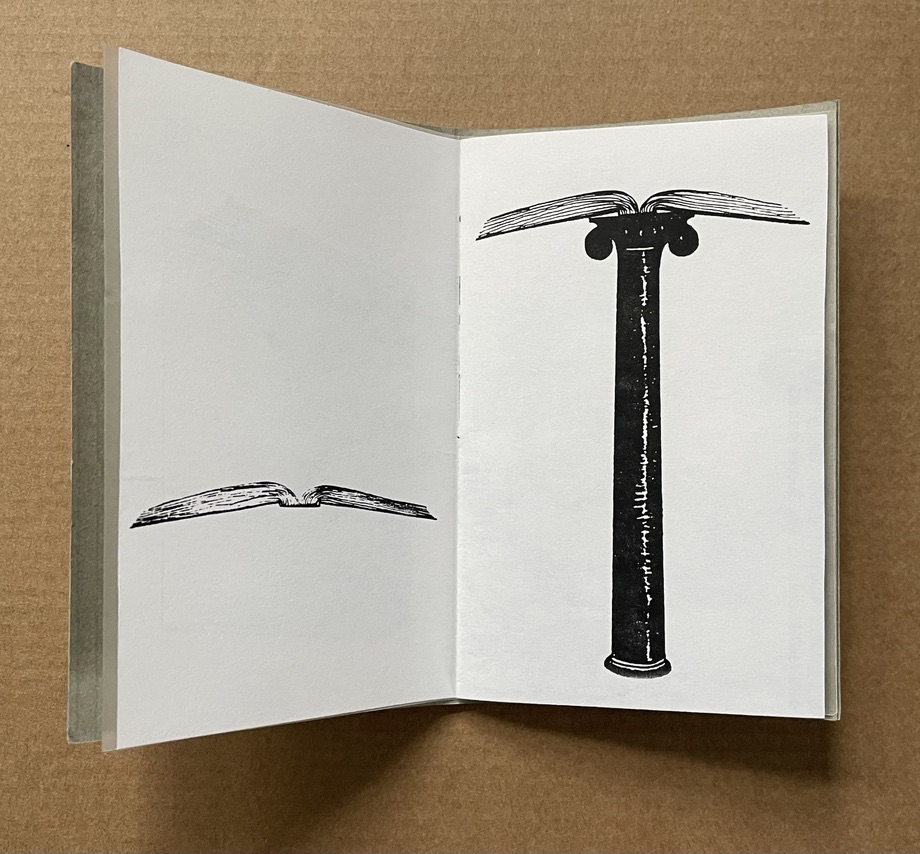 Egyptian Hours falls somewhere between book and portfolio box. Somewhat like photos and captions in a photobook, text and relief images play off one another, but mediated by glyphs in the “table of contents”, the named hours are distant from the images associated with them. If the table of contents were held apart, the distance would shorten, but the images are so evocative, there is more pleasure in guessing the nature of the hour that the image represents: the image of a window lattice through which to watch, an image of a tile fragment or the image of archivally numbered shards.
