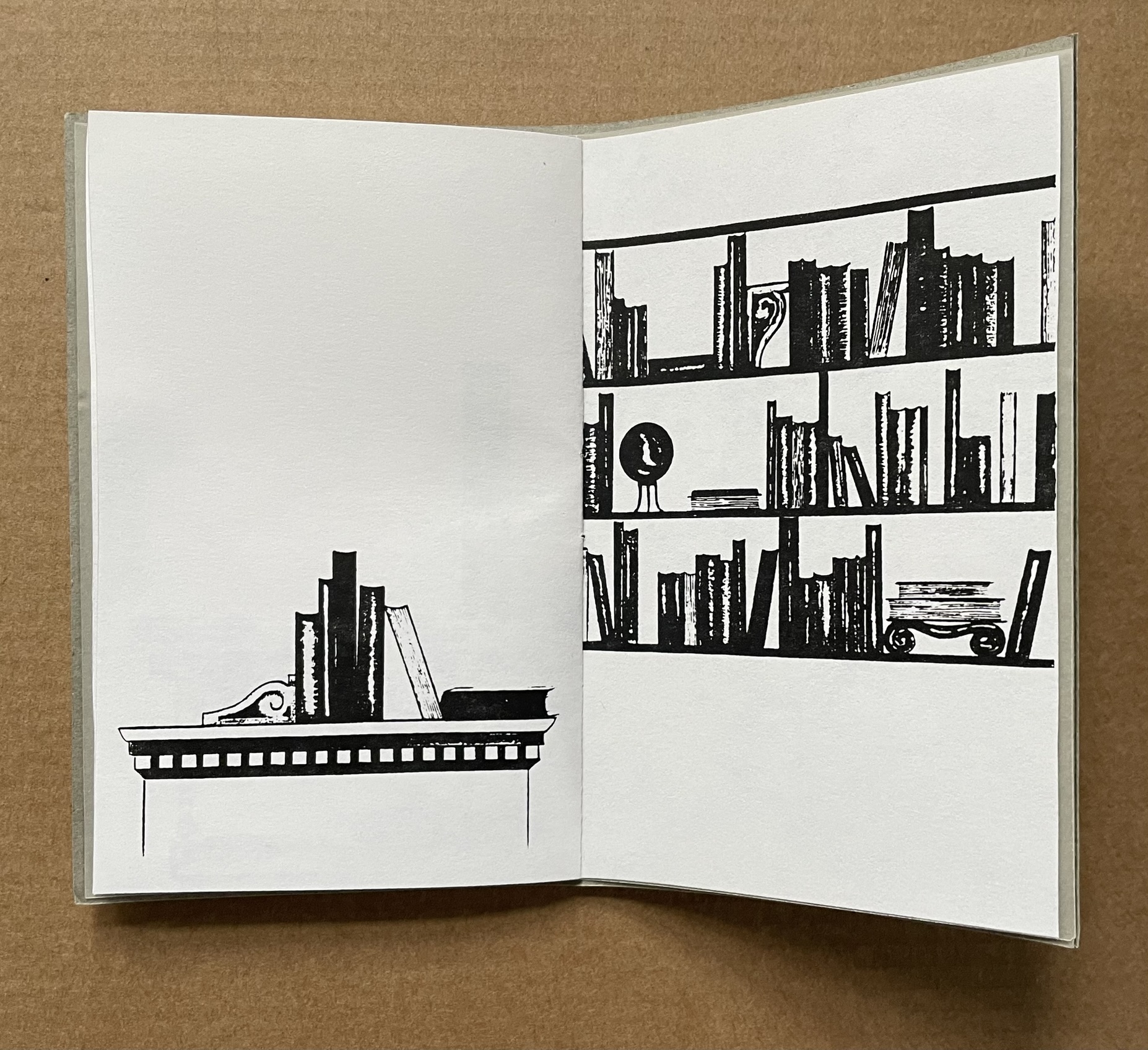 The catalogue also teases with its title and design by suggesting that once books have been placed on display like this, the setting is no longer a library but a “white cube gallery“. As the catalogue progresses, black-and-white photos of items from the exhibition appear on the verso page in frames that appear to be hanging on the trompe l’oeil cube’s rear wall.