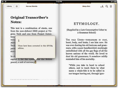 Liz Castro’s blog “Pigs, Gourds, and Wikis” performs a stellar service to the evolution of the book by focusing the spotlight on how EPUB 3 supports footnotes in ebooks (with a snippet from Dave Cramer‘s EPUB 3 version of Moby Dick) and providing many other insights into the making of books.