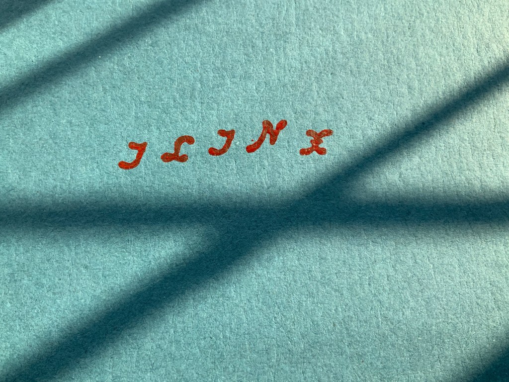 But enough of Mallarmé for a moment: go with the flow and read/view Stochastic Poetics without precisely tracking down its allusions. Clusters of letters not quite forming words, phrases or sentences suggest abstract doodling. The shapes of the clusters and lines create a sense of mental motion, or “AACTIION”. Eyes twist and turn as hands rotate the book to untangle words, phrases and sentences. In disentangling the portmanteau words and phrases such as “skeptical delightenment”, the mind finds itself playing out the reading — being skeptical, delighting, experiencing enlightenment. This is the artist-printer interrogating “the conceptual or material form of the book as part of [her] intention, thematic interests, or production activities” (The Century of Artists’ Books, p.3). This is the author-artist-printer twisting and turning the visual and verbal strands of book-DNA. This is a true specimen of the artist’s book.