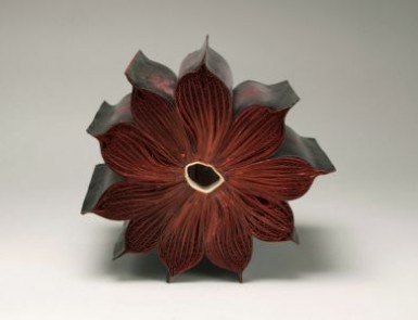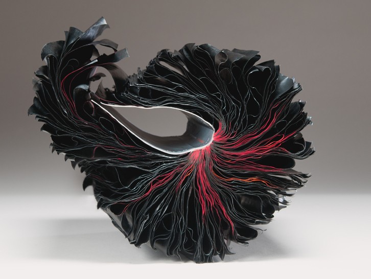 To return then to Lee. Her works (The First Cut, Silenda and previous ones similar to them) also have set a bar for this variety of book art. They invite a closer and comparative look. Within her own body of work, her series invite this. Silenda is part of the Inked series, whose output compares and contrasts productively with that of the series Ex Libris. The process Lee used for the latter series whereby “books and periodicals were fired in controlled kiln environments with no clay or slip addition” resulted in “fragile, bloom-like forms or skeletal remains, while others were coral-like, calcified forms with covers that were shell-like in feel with text, cover titles, and book cover colors present in their new, warped state”.
