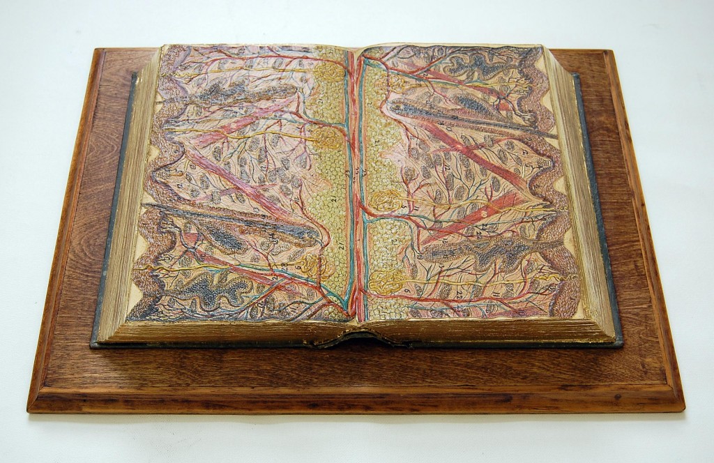 “Liber Dermis (Skin Book),” Paul Forte, 2008 Medical illustrations (human skin cross section) on sealed medical book, mounted on wood, 17 1/2 x 12 1/2 x 3/4 inches