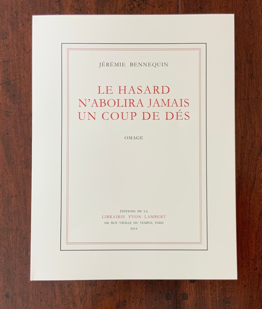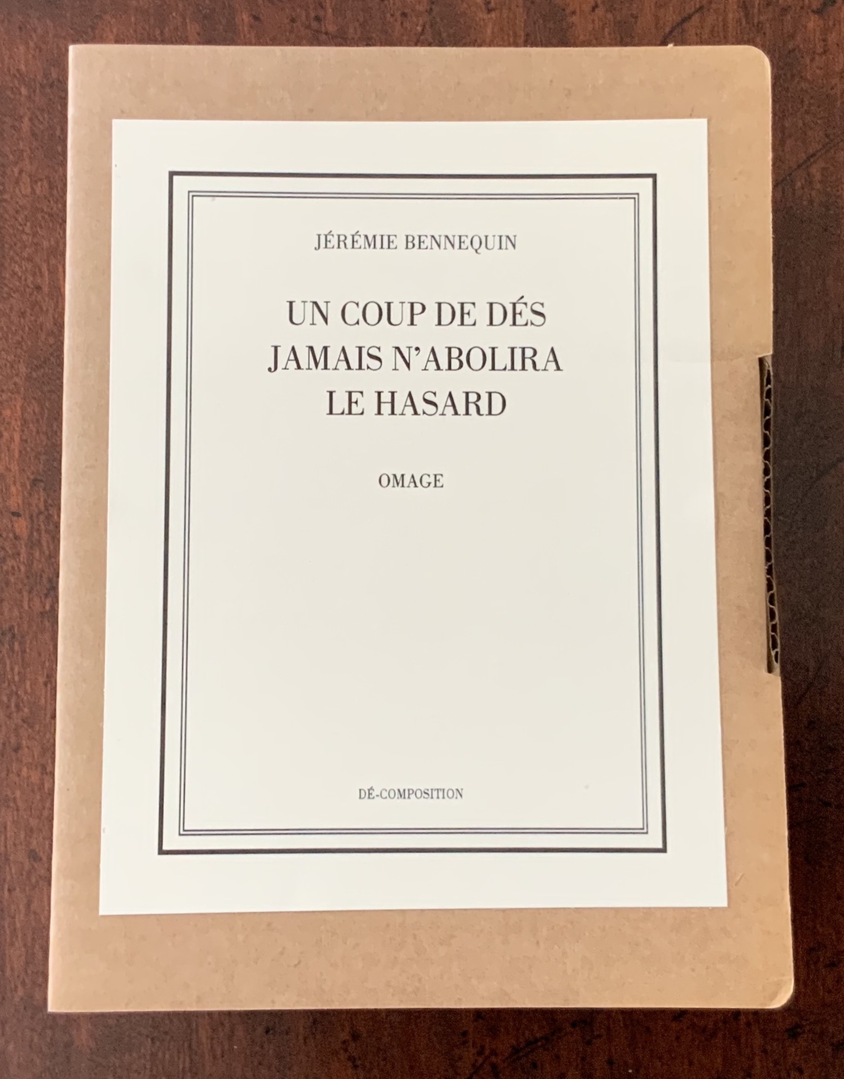 Booklet 1.0, which reproduces Mallarmé’s complete poem in its 1897 format, also contains a preface to Bennequin’s multi-volume boxed work. Arguing in the preface that Un Coup de Dés does not abolish chance but rather enhances, elevates, ennobles it, Bennequin poses the questions that initiate his homage. The first is: