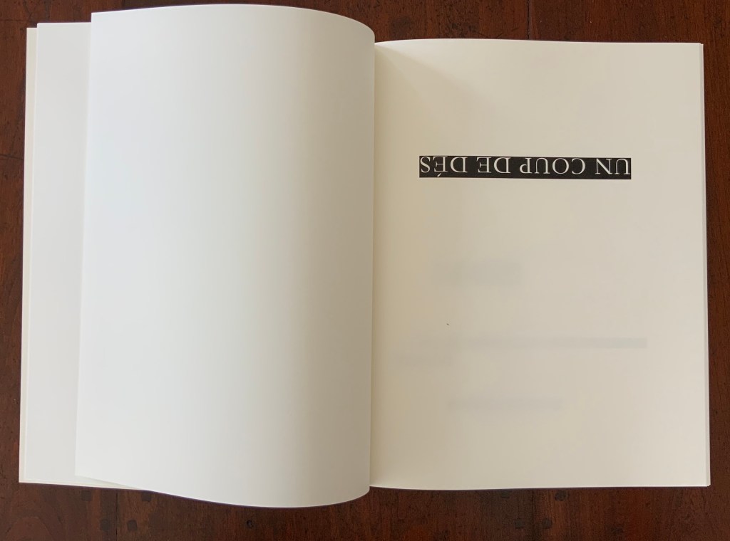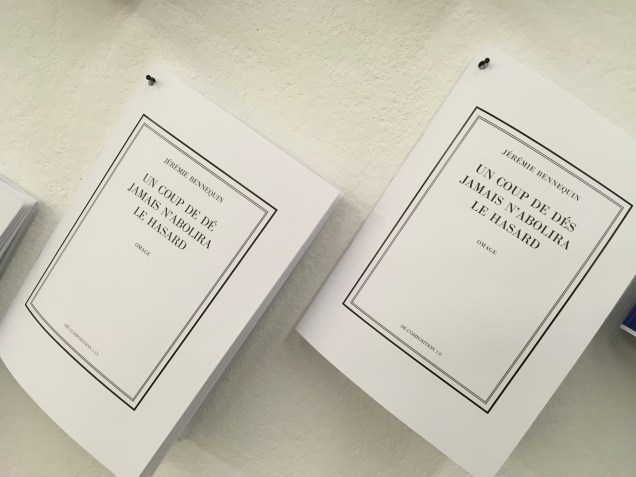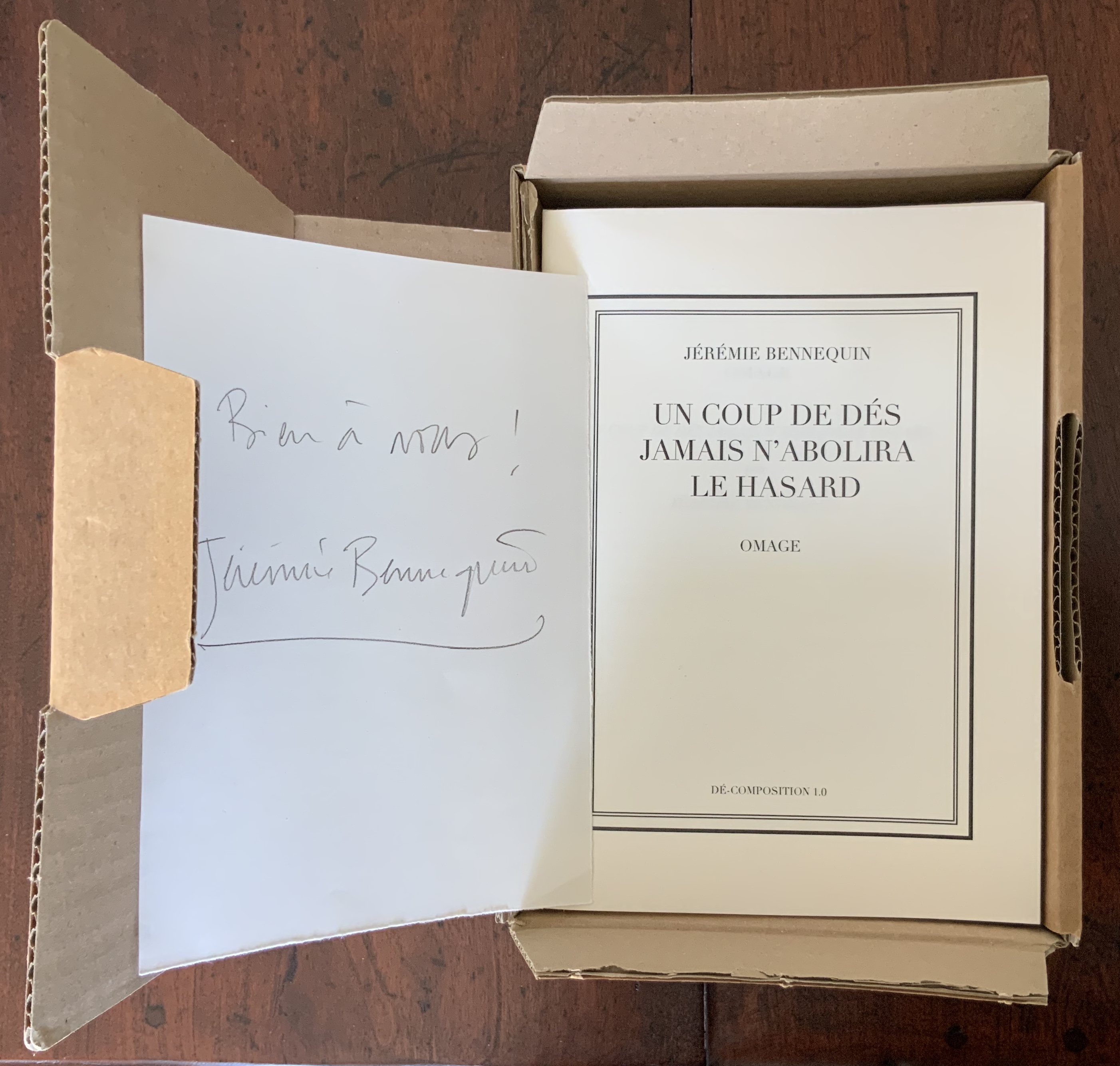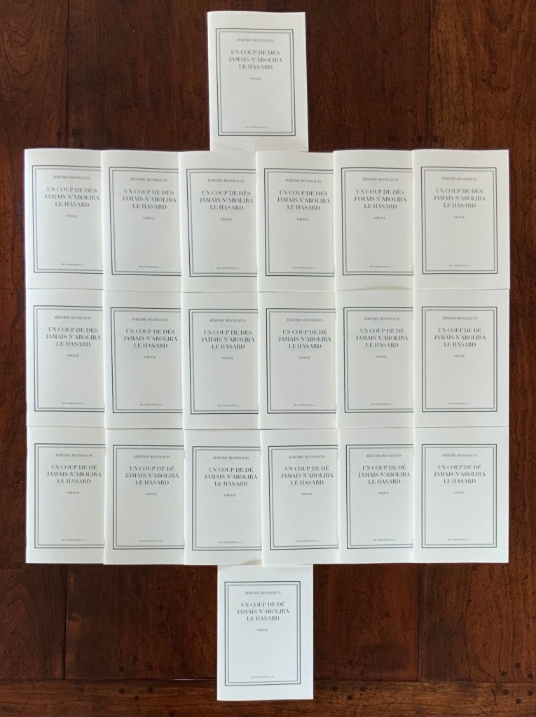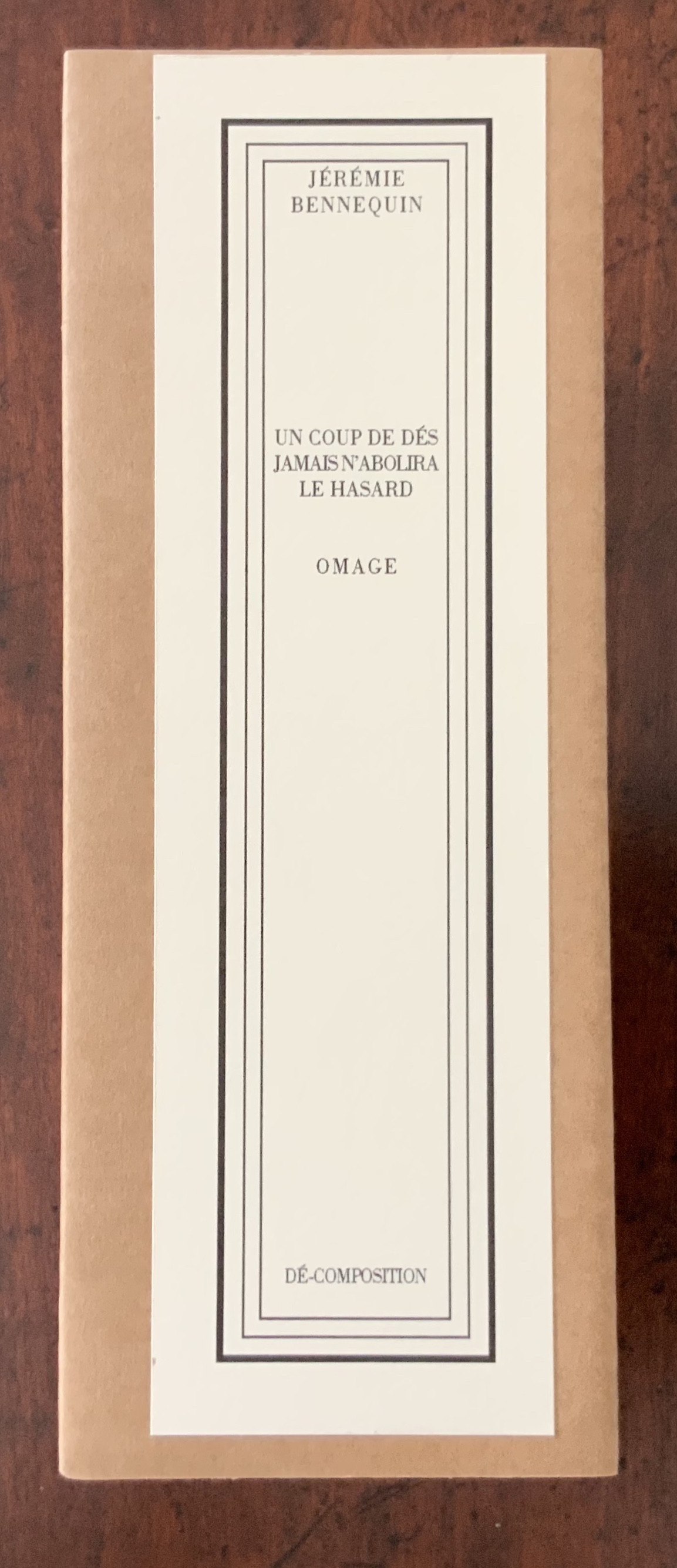 Away from the exhibition and onto Bennequin’s and Lefebvre’s websites, the intrigue only grew with the knowledge that nineteen of those twenty booklets are the results of algorithmically dice-driven live performances of erasing the text from Mallarmé’s poem. With several works of homage to Un Coup de Dés in the Books On Books Collection, Bennequin’s omage composed with a single dé seemed an essential addition.