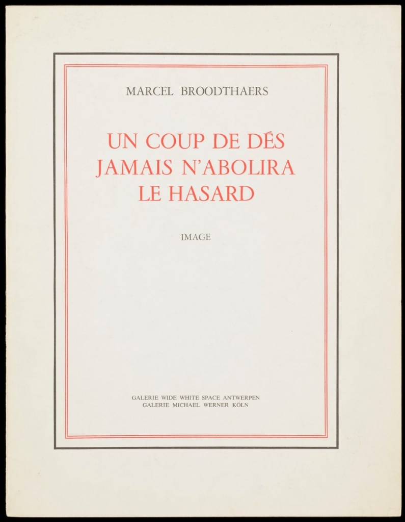 Le Hasardn’abolira jamais un Coup de Dés replicates in size, colour and appearance the 1914 edition Un Coup de Dés jamais n’abolira le Hasard. The main textual difference — the inversion of the title — announces the work as an homage to Mallarmé. But a smaller textual difference — the replacement of Poème with Omage — subtly announces another homage: to Broodthaers’ 1969 homage to Mallarmé. Broodthaers had replaced the word Poème on the 1914 edition’s cover with the word Image.