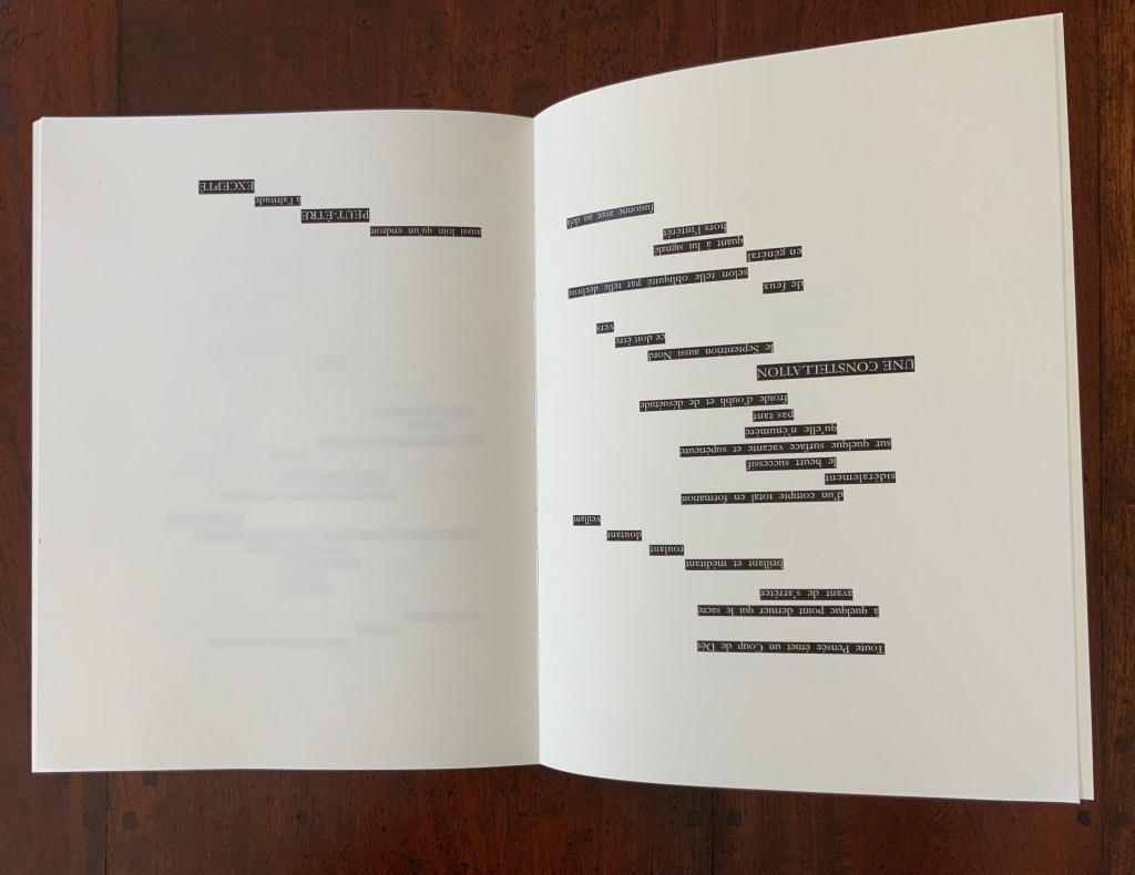 Since the 1960s when Ernest Fraenkel, Mario Diacono and Marcel Broodthaers blotted out the text of Mallarmé’s poem Un Coup de Dés Jamais N’Abolira le Hasard (1897) to create their works of homage, numerous others have expanded on the technique: substituting images of sonograms (Sammy Engramer, 2009) or algorithmically generated abstractions (Eric Zboya, 2018, and Benjamin Lord, 2019), or excising the text (Michalis Pichler, 2008, and Cerith Wyn Evans, 2008) or algorithmically erasing it (Jérémie Bennequin, 2009) — just to name a few.