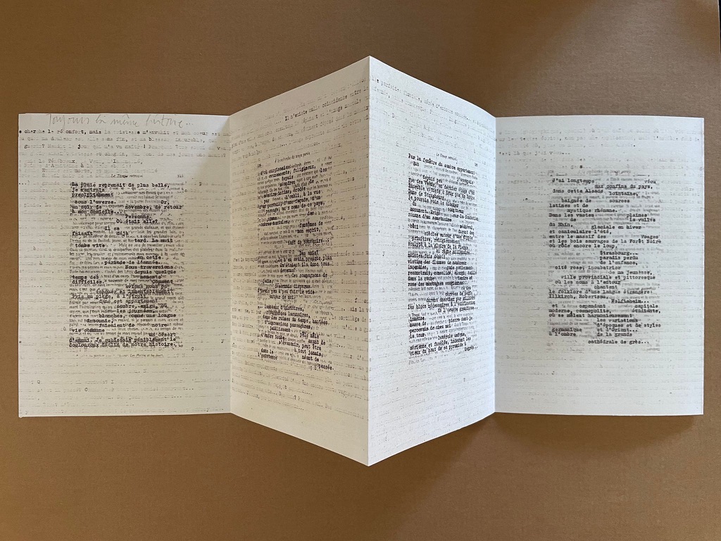 Even though it comes after Mallarmé’s completed poem and after the Gallimard book edition, Après presents as an unfinished work, a book not yet trimmed and bound, which reflects not only Mallarmé’s unfinished realization of the poem as a book but also his unfinished life’s pursuit: le Livre, the thing in which everything in the world would end up — the thing that, by virtue of a spacious mobility of typographic layout and the interplay of its elements, would be “the total expansion of the letter”. Lorand’s attention and manual precision in excising the blackened blocks where the text would otherwise appear evoke Mallarmé’s attention to the minute details of typeface, size and font shown in his handwritten mark-up of the proofs for the book edition he was planning before he died.