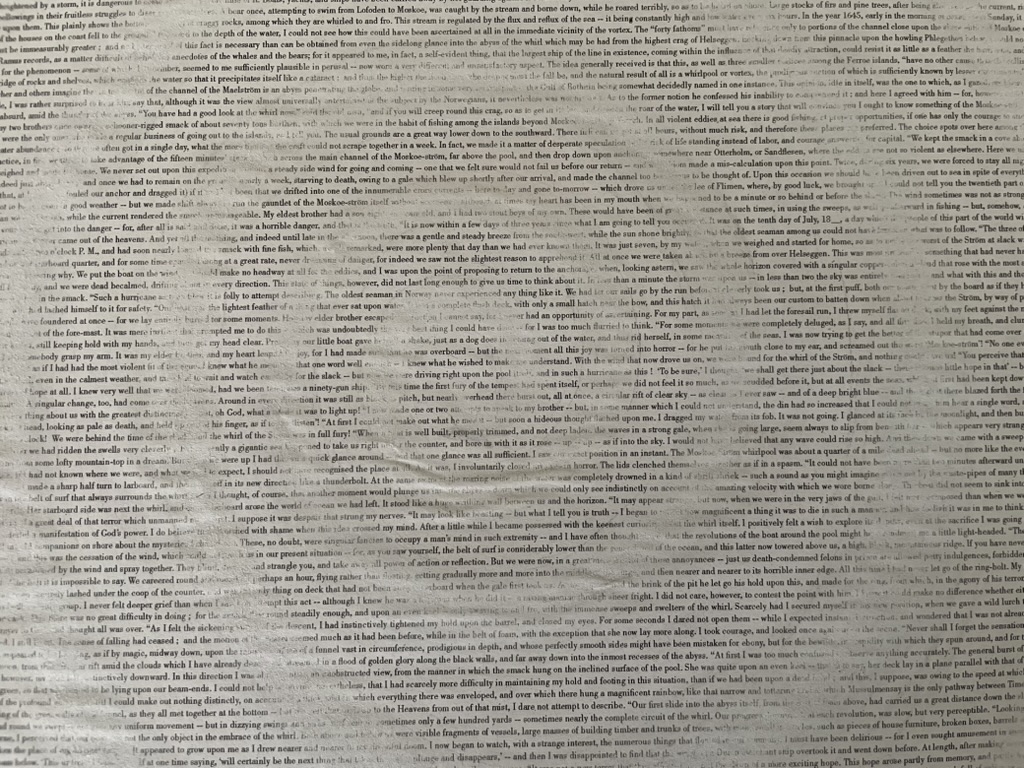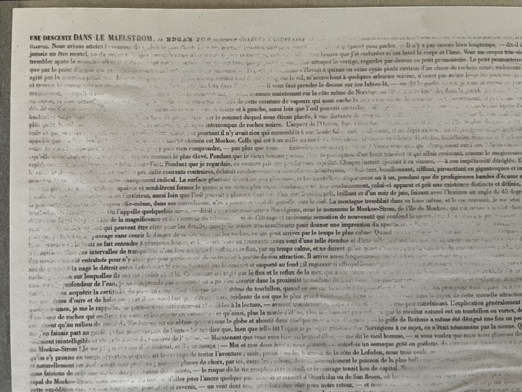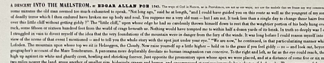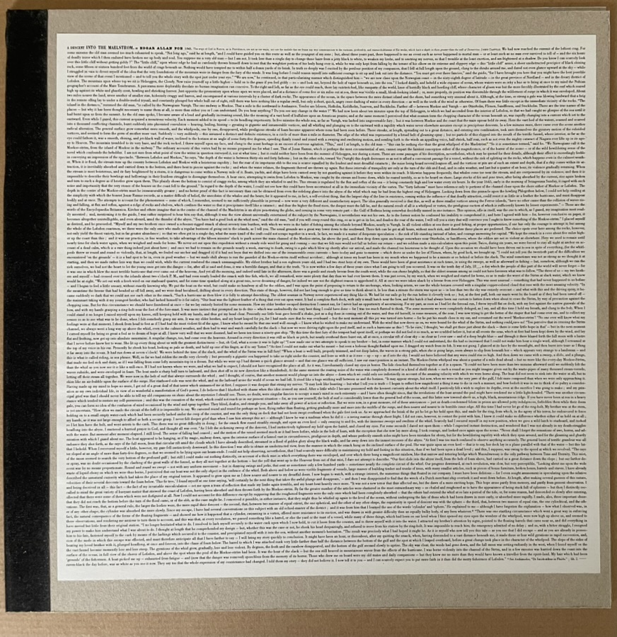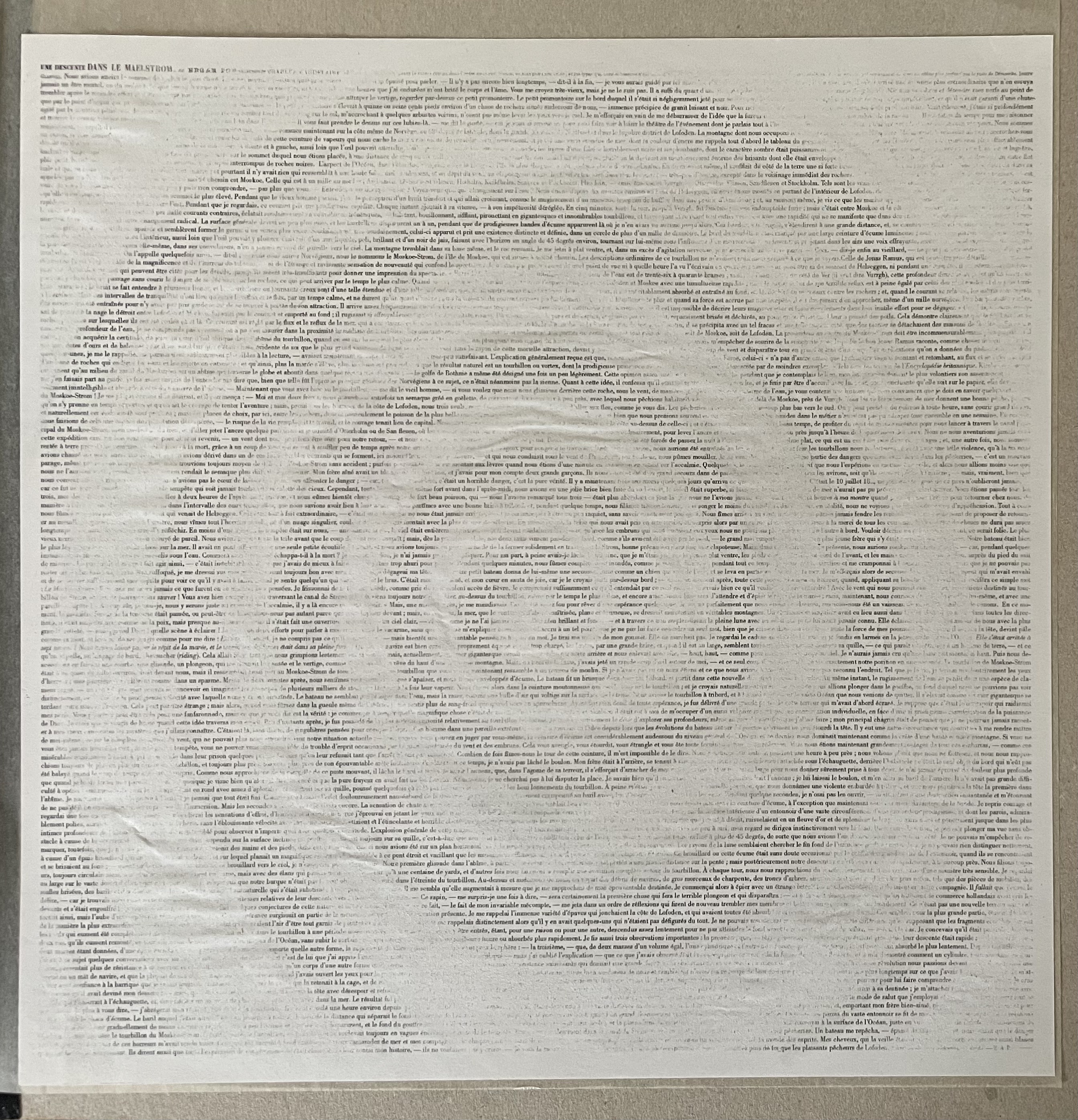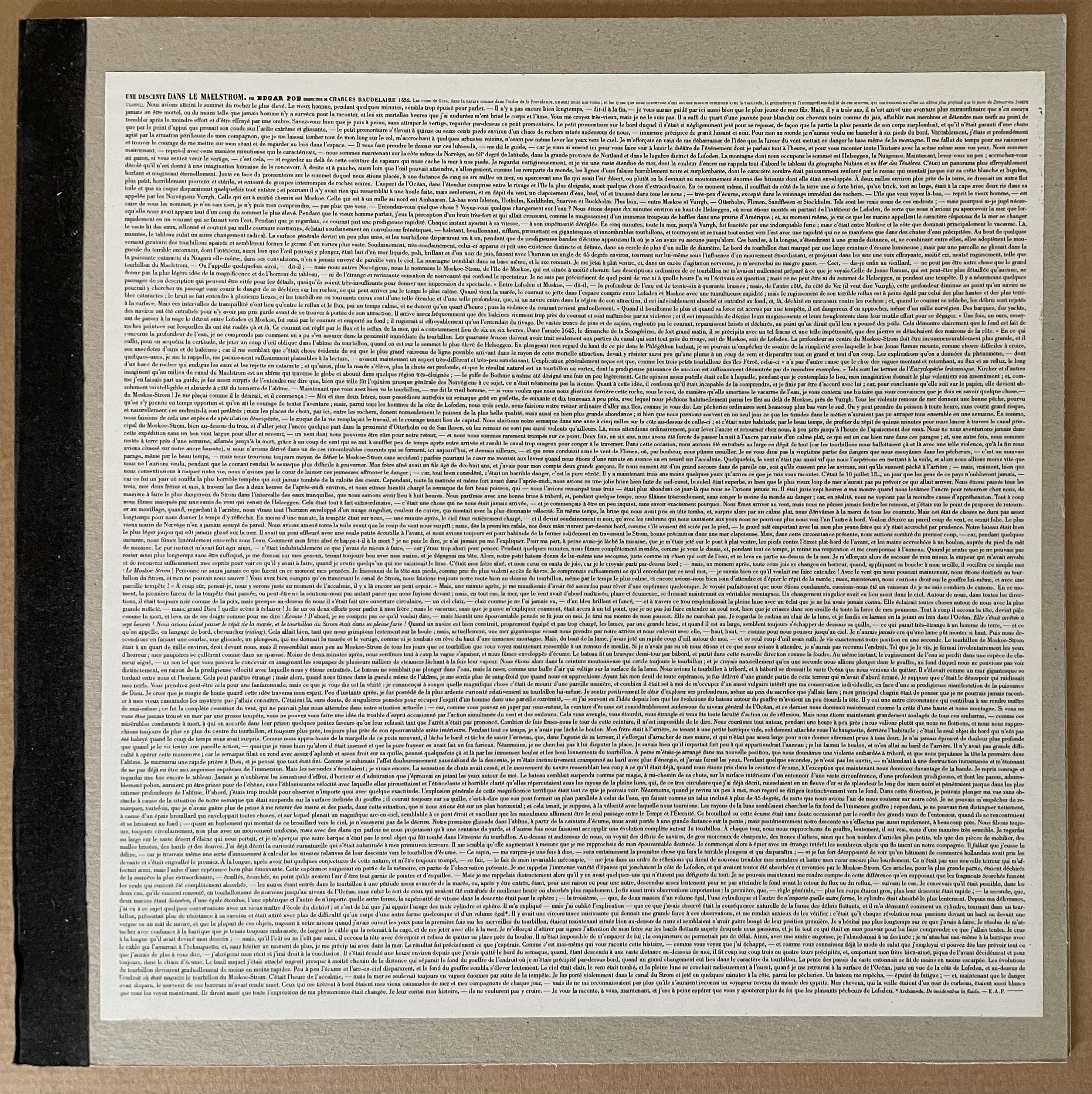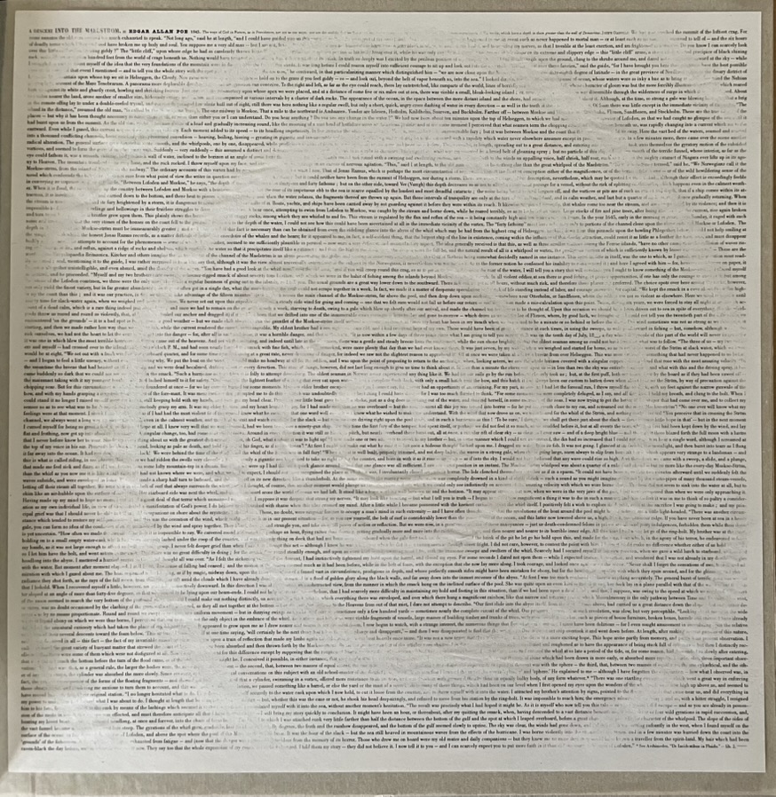 As early as 1988, the idea of reprinting an entire literary work onto a single sheet and silhouetting some relevant art found its way into commercial posters with the One Page Book Company, then Spineless Classics and, later, Litographs. No surprise then that the innovative journal Inscription chose to include an oversized poster version of Bennequin’s fine print in its inaugural 2020 issue. Bennequin’s treatment of Edgar Allan Poe’s short story “A Descent into the Maelstrom” is an oblique homage to Mallarmé, who would have found Poe’s vertiginous tale of an abyss resonant with the images that appear in Un Coup de Dés.
