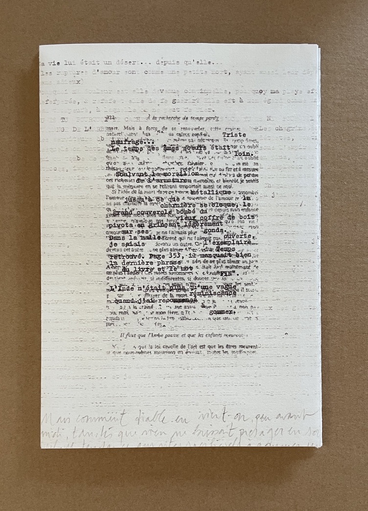 Others like Marcel Broodthaers’ page-by-page redactions of Mallarmé’s Un Coup de Dés by ink in one case and excision in another or Michalis Pichler’s similar reformatting and excision of the same poem in clear acrylic or Jérémie Bennequin’s page-by-page erasures of Proust’s Remembrance of Things Past give us artists’ books that make the altered books illegible but still accessible page by page.