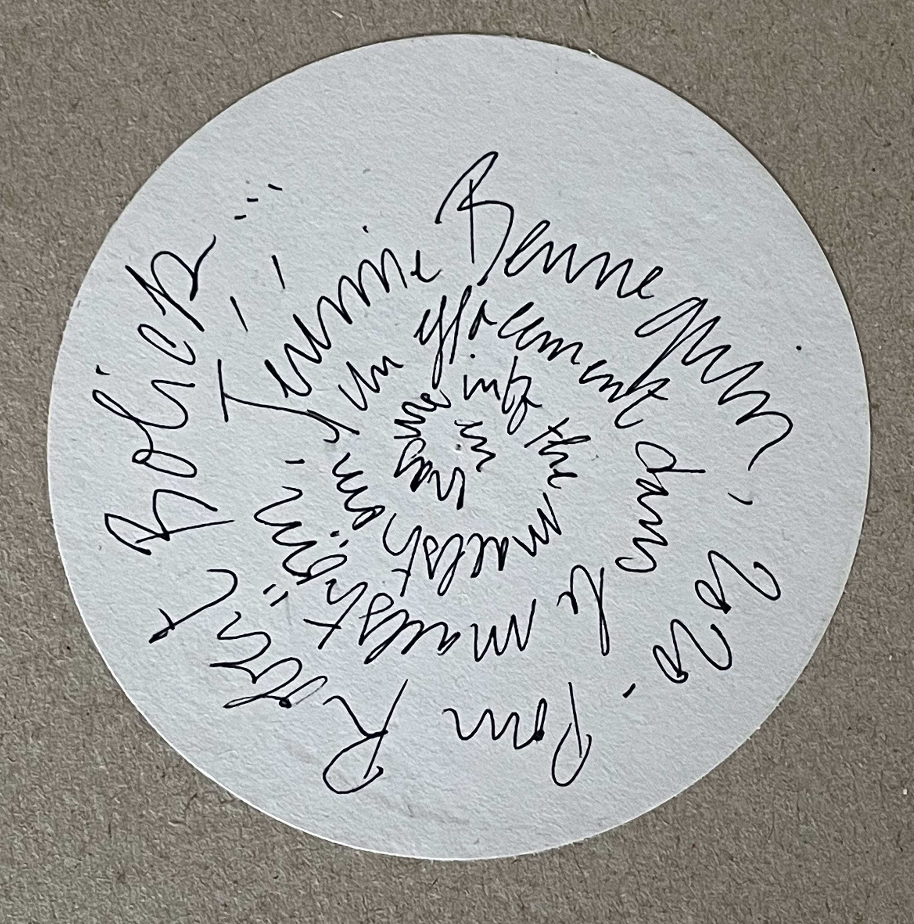 To answer those awkward questions asked in the exhibition hall: First, the removal of “h” and “m” from hommage to create omage is a visual clue to the work’s destructive/creative process — the dice-driven algorithm’s targeting and erasure of phonemes. Second, the isolation of “dé” in the hyphenation of décomposition puns self-reflexively — as book art so often does — on the singular of dés, underscoring the means of Bennequin’s paradoxical decomposition/composition. No matter how this work is displayed or examined, it puts before us a visual constellation of fragments of sound. But, having completed the performances leading to this particular self-reflexive constellation, Bennequin produced another self-reflexive work, an homage within an homage.