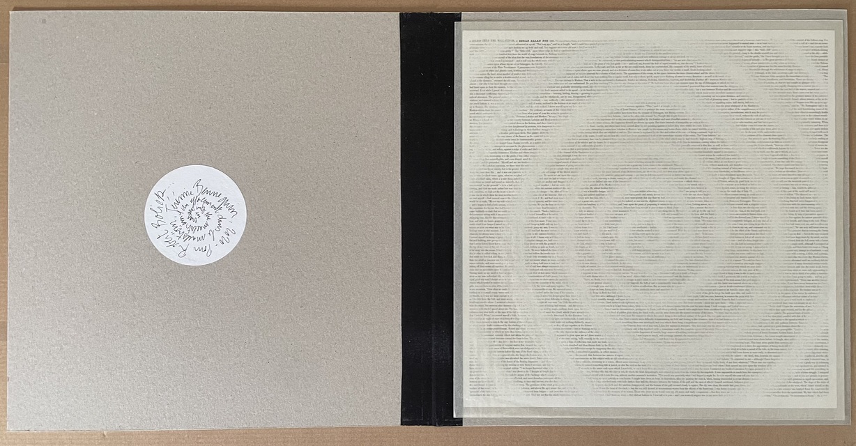 Descent 2021 Jérémie Bennequin (text by Edgar Allan Poe) Cardboard portfolio with pastedown prints on both covers, enclosing a double-sided print with spiraling erasure. Portfolio: 330 x 330 mm. Prints: H300 x W295 mm. Acquired from Jérémie Bennequin, 1 May 2021. Photos: Books On Books Collection.