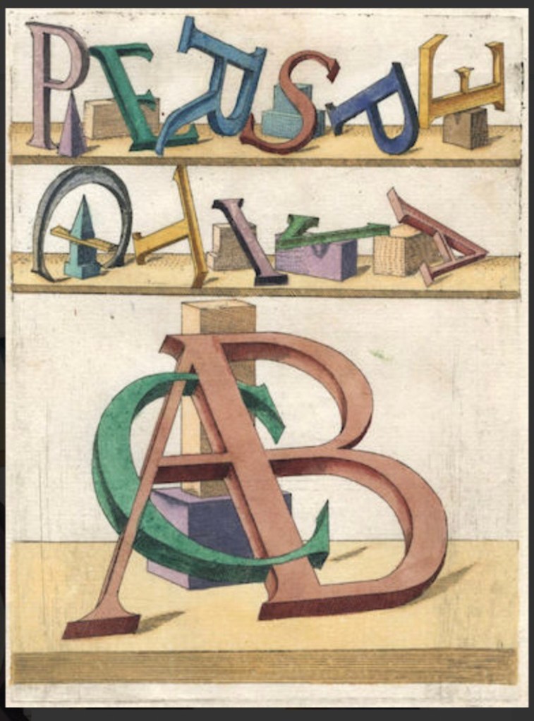 Lencker and Zündt’s achievements with perspective, letters and geometric shapes stand on the shoulders of Leonardo da Vinci (ca. 1490) and Albrecht Dürer (1525), just as theirs stand on those of the rediscoverers of linear perspective: Filippo Brunelleschi (1415), Leon Battista Alberti (1435) and Piero della Francesco (ca.1460). Lencker’s originality lay in designing his letters as solids leaning against geometrical solids and resting on a horizontal shelf. The shelf’s thick, grainy fore edge and the thin parallel line above it, suggesting the shelf’s intersection with a blank wall, set up a field of depth in which the geometrical models’ mass and shape set off the three-dimensionality of the foreshortened letters balanced on and against them. Some letters’ feet and edges seem to enter the viewer’s space, an effect enhanced by a hand-colored version of the original. Sadly the facsimile contains no examples of the hand-colored images.