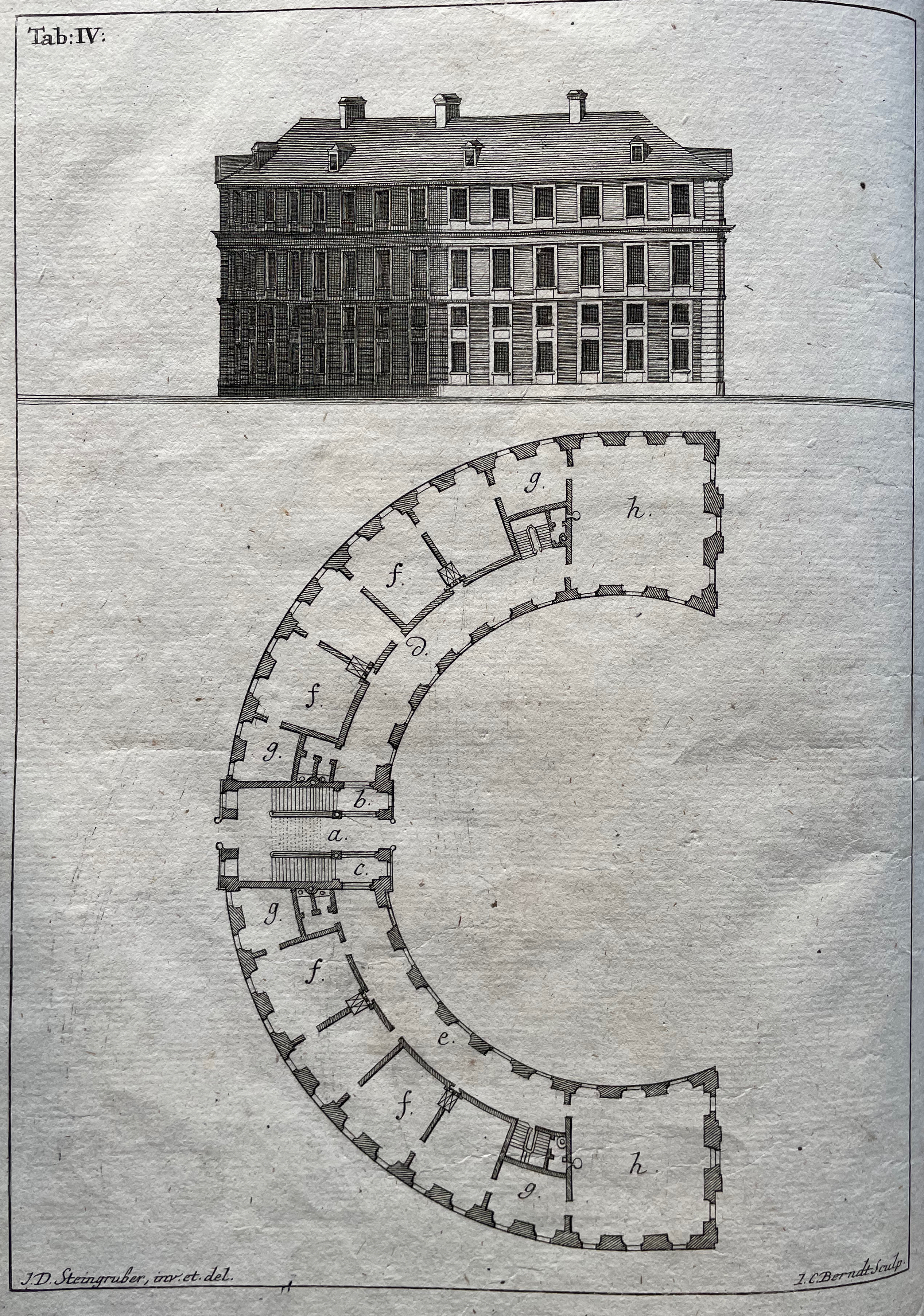 Steingruber seemed unaware of other building designs from alphabetical foundations. This facsimile’s editor gently and genially fills in the missing context. John Thorpe (1565–1655?), an English architect, drew up a property based on his initials. Thomas Gobert (1625-90), a French architect, produced Traitté d’Architecture dedié à Louis XIV, a manuscript whose building plans spelled out “LOVIS LE GRAND”. Anton Glonner (1723–1801) designed a Jesuit church and college around the monogram “IHS”.