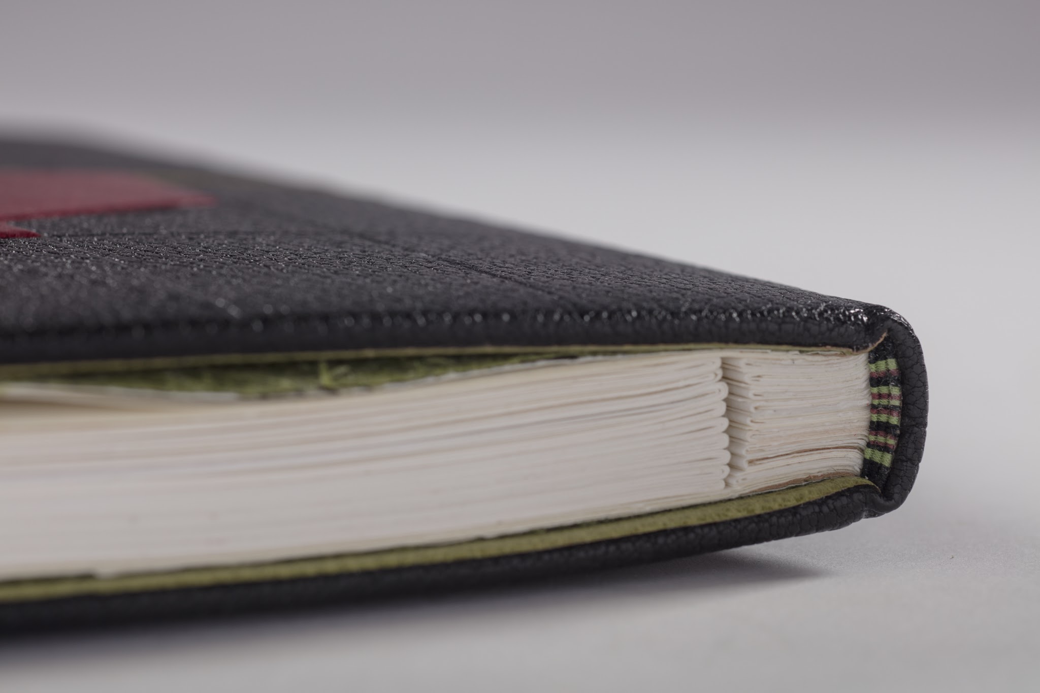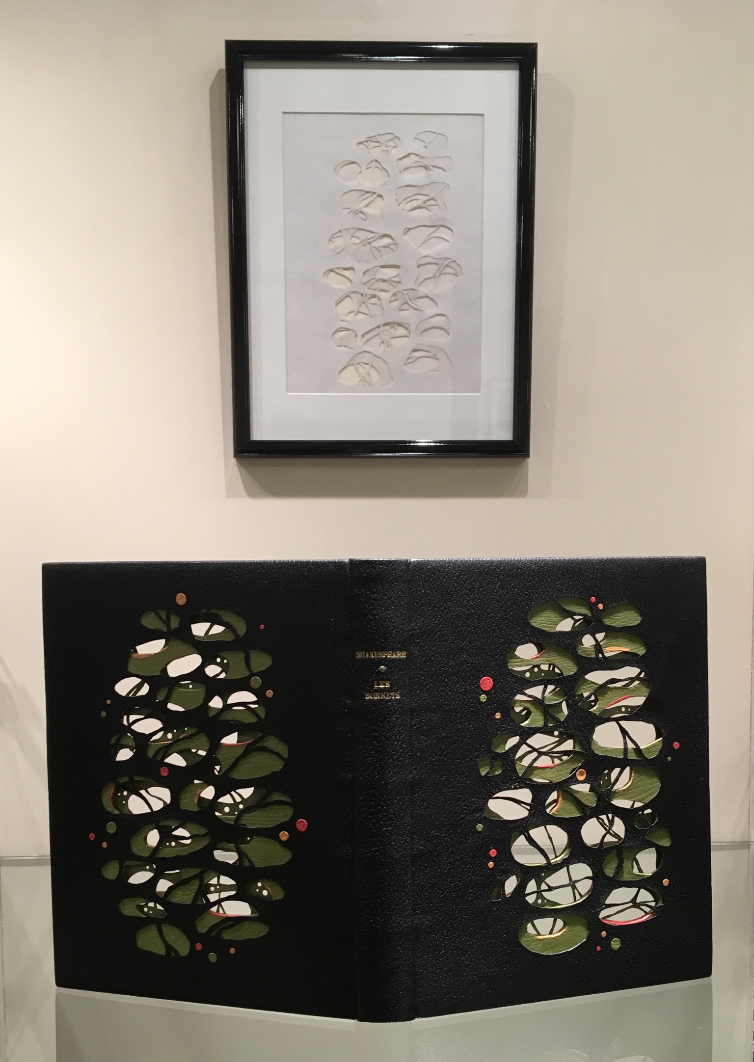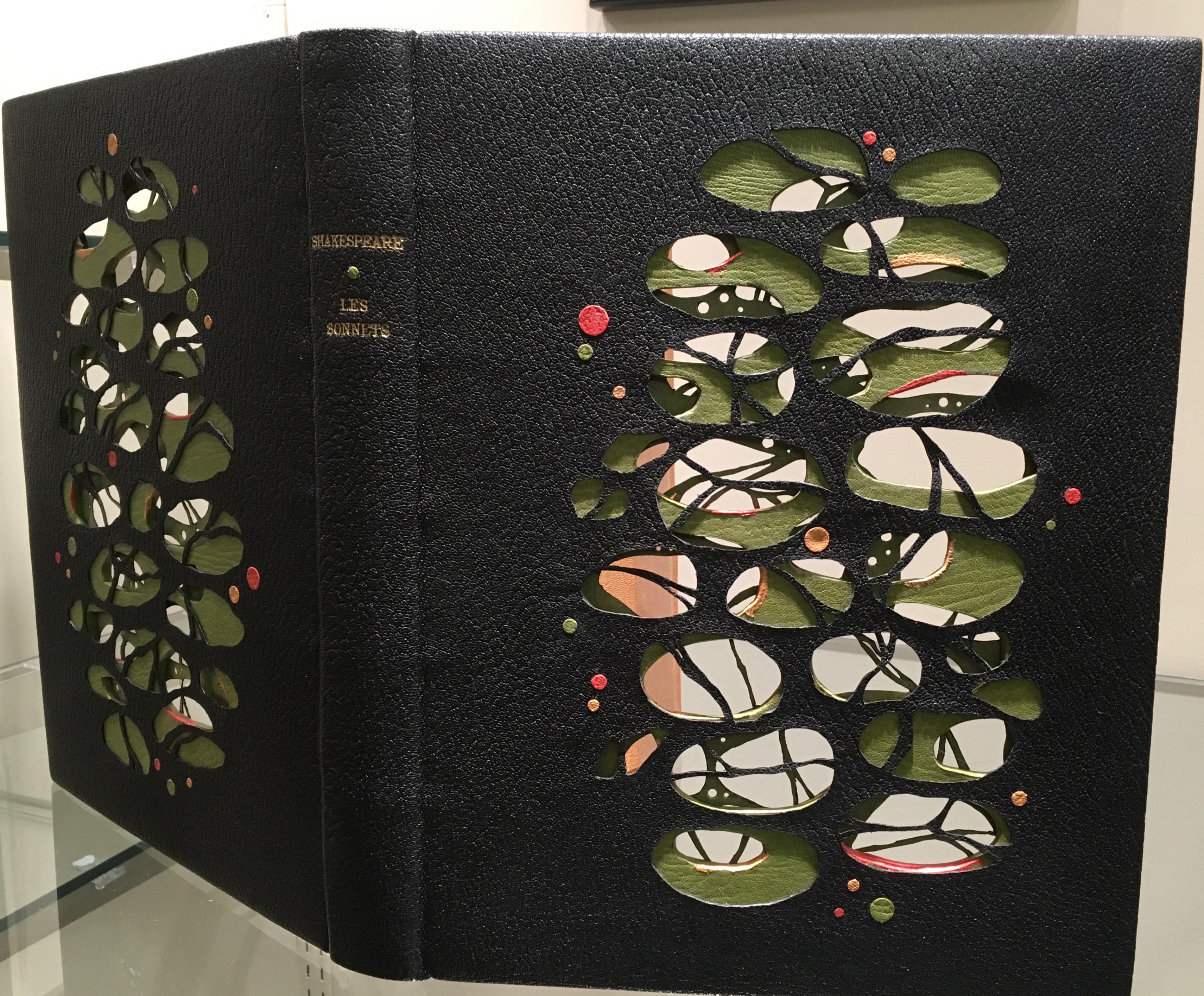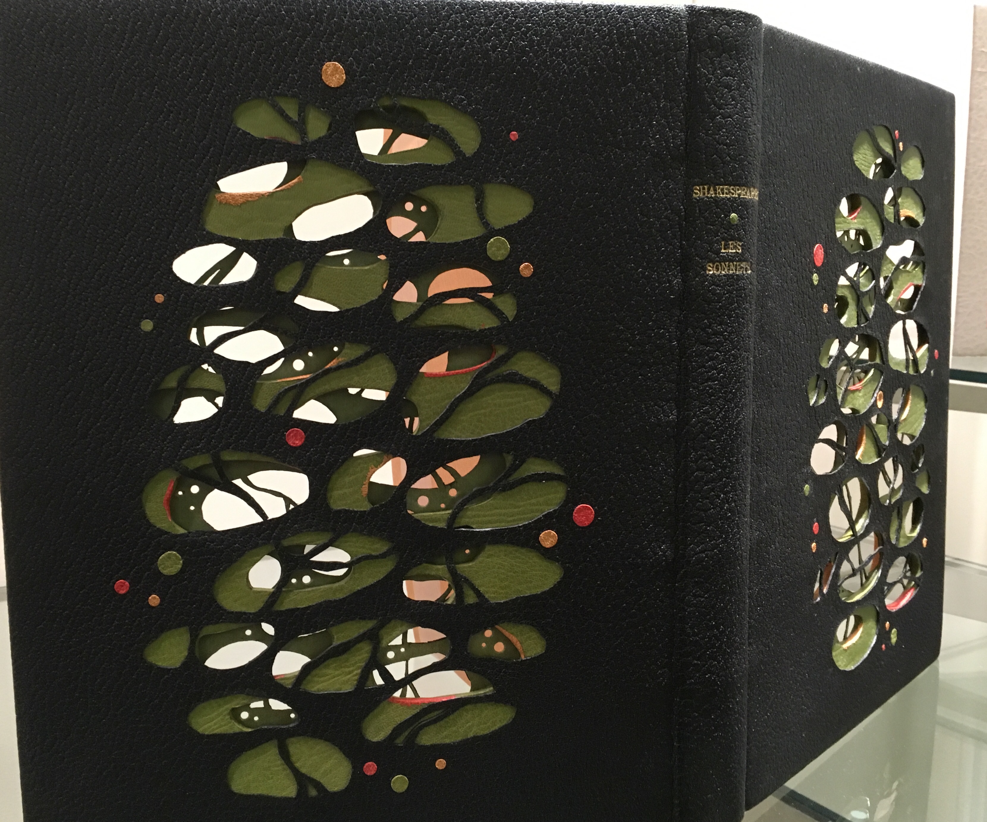 Shakespeare: Les Sonnets (2012) is another case in point of craftsmanship. Creation of this work began with a drawing (shown below) and then a maquette to enable Lallier to visualize the sculptural and aesthetic implications of multiple layers’ surfaces and edges being seen from all angles. The boards were cut out and lined with a green goat skin. The covering leather was also cut out and lined with green Japanese paper before covering. The doublures (linings of the book cover) received the same treatment before being applied to the inner boards.