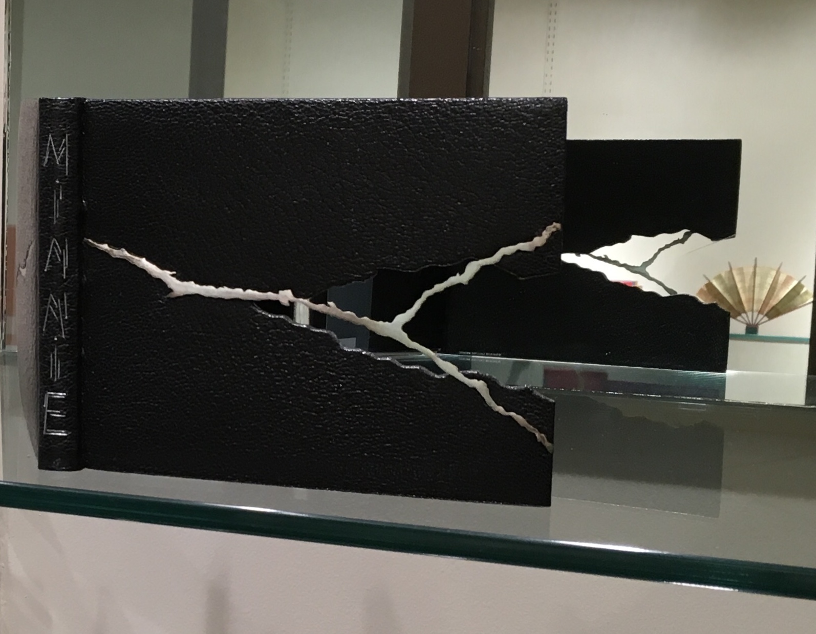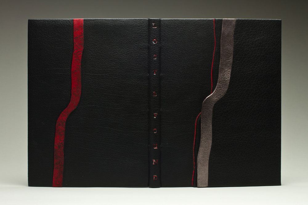 Lallier’s roots are in the tradition of fine French binding, which goes back to the practice of book buyers’ purchasing unbound books and taking them to their favorite specialist binder for customized binding, most often in leather. Lallier has written here about the technique in detail. While it is true to call Lallier a bookbinder, it misses what the displayed works say she is: a sculptor and artist of the book. For anyone lucky enough to visit Guilford College Art Gallery, the comments and photos below offer a handful of pointers to details and background supporting that statement. The exhibition catalogue including an insightful essay by Karen Hanmer as well as multiple views of the works displayed and several outside the exhibition will clinch the argument.