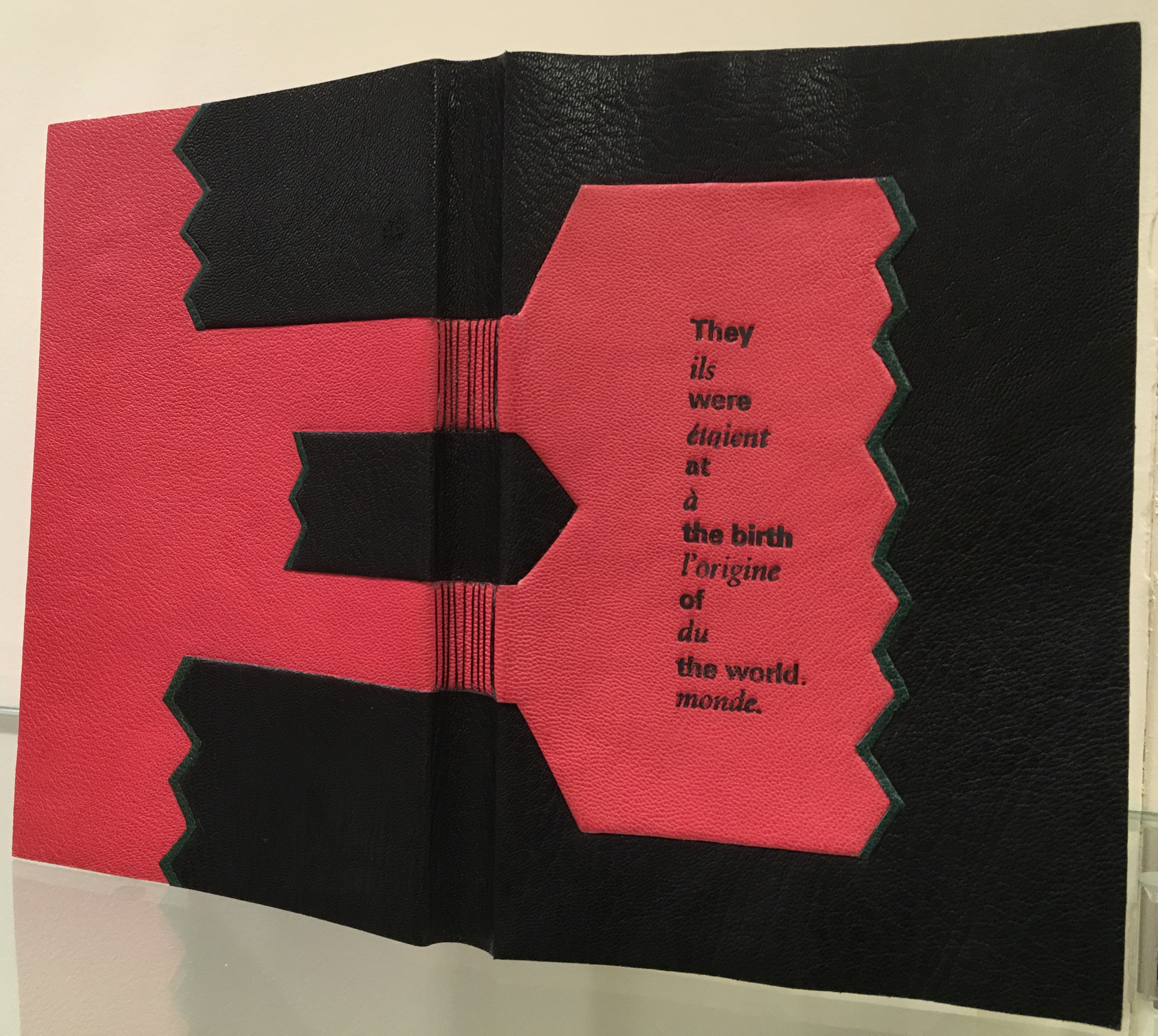 Look for this style of binding called montage sur onglets or stub binding that allows pages to lay flat or even be easily detached. Look for Le Chevalier Troyen (2014) and Inside the Book (2016), displayed side by side in the exhibition and showing this form of binding.Le Livre des Origines / The Book of Origins by André Ricard, 2005 In the exhibition, be sure to look closely at the spine’s deliberately exposed cross-structure binding in full goatskin leather.