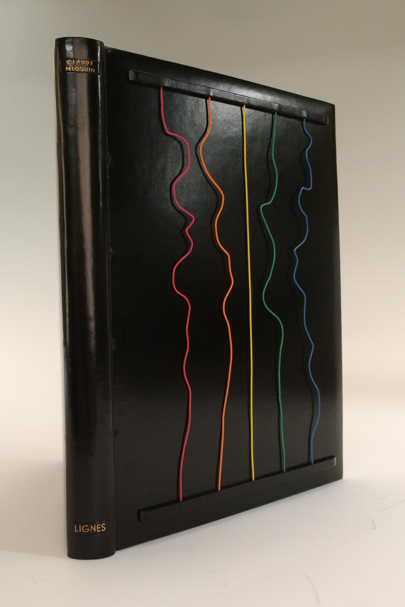 L’Eloge de la Folie (1974) Rarely does Lallier use on the cover an image from within the book at hand. Here is one of the exceptions. The cavorting monks from Erasmus’ satire come from Albert Dubout’s 1951 illustration of the classic. Lallier, however, couldn’t resist using her own hair to form their tonsures.Portes Sud (1979) Note in the reflection the light coming through the agate embedded in the cover.Histoire de Minnie (1982) In the exhibition, be sure to look at the back cover where Lallier has used the silver piece, embedded in the front cover, to stamp the back cover.Lignes (1986) This is Lallier’s only collaboration from scratch. For a Montréal exhibition whose organizers set the theme of “lignes” or lines, she conceived the cover design. Sharing only blank pages and not the design, she then asked Claude Péloquin to provide text and illustrations on the theme. The “telephone wires” attached to the front cover are loose and manipulable by the reader — a tongue-in-cheek form of interactivity with lines of communication in the pre-Web age. The Song of Songs, which is Solomon’s (2002) Visiting a Parisian builders’ store with a friend selecting decor items, Lallier was entranced by sheets of pewter and its varying thicknesses. She bought some. The inspired result above sits alongside another in the exhibition — The Enchiridion of Epictetus (2003); be sure to look at the reflection of The Enchiridion to spot the use of pewter in the interior.