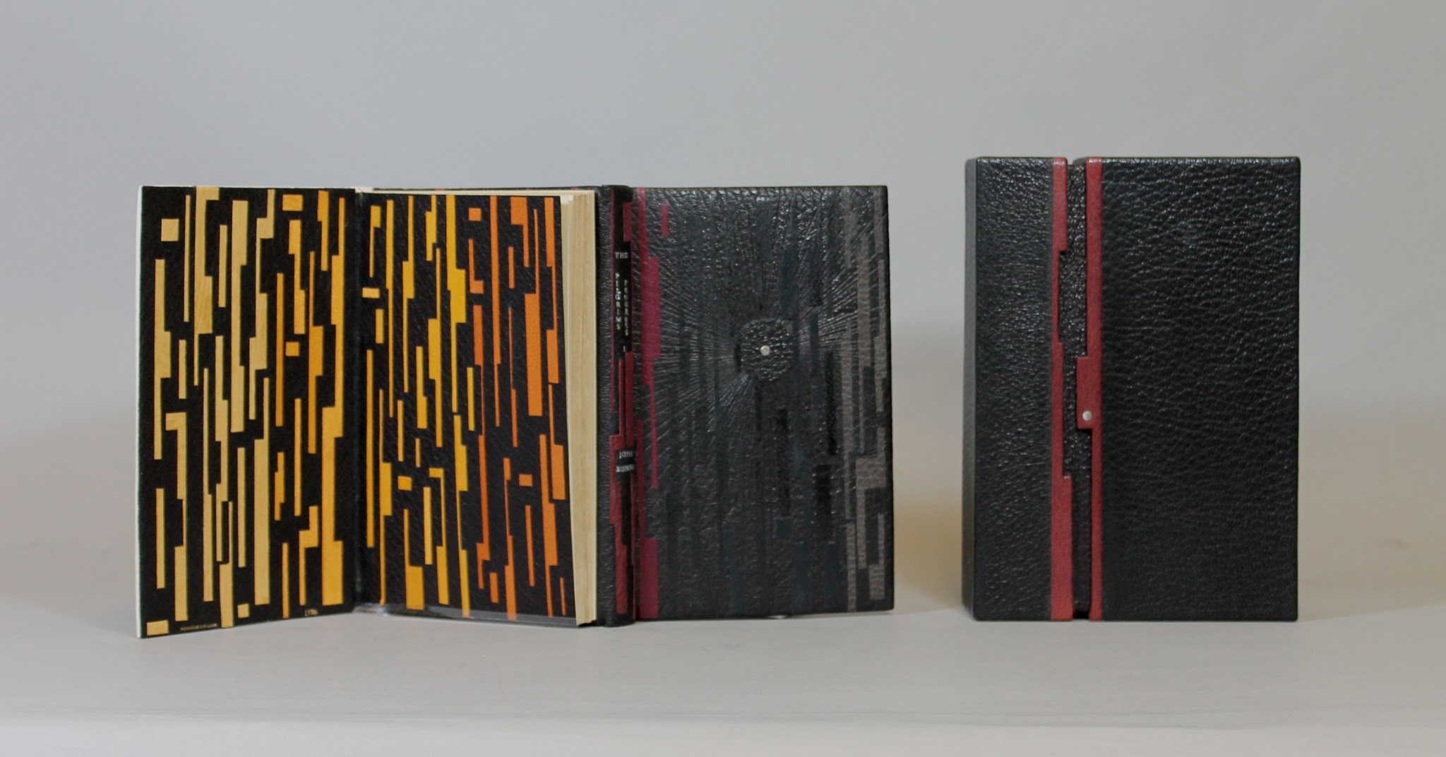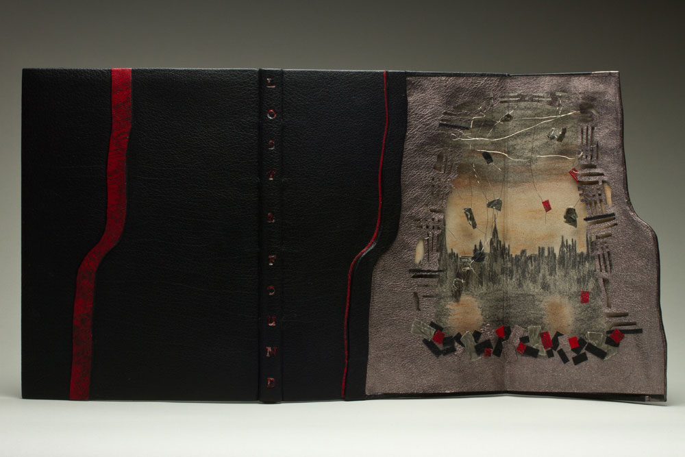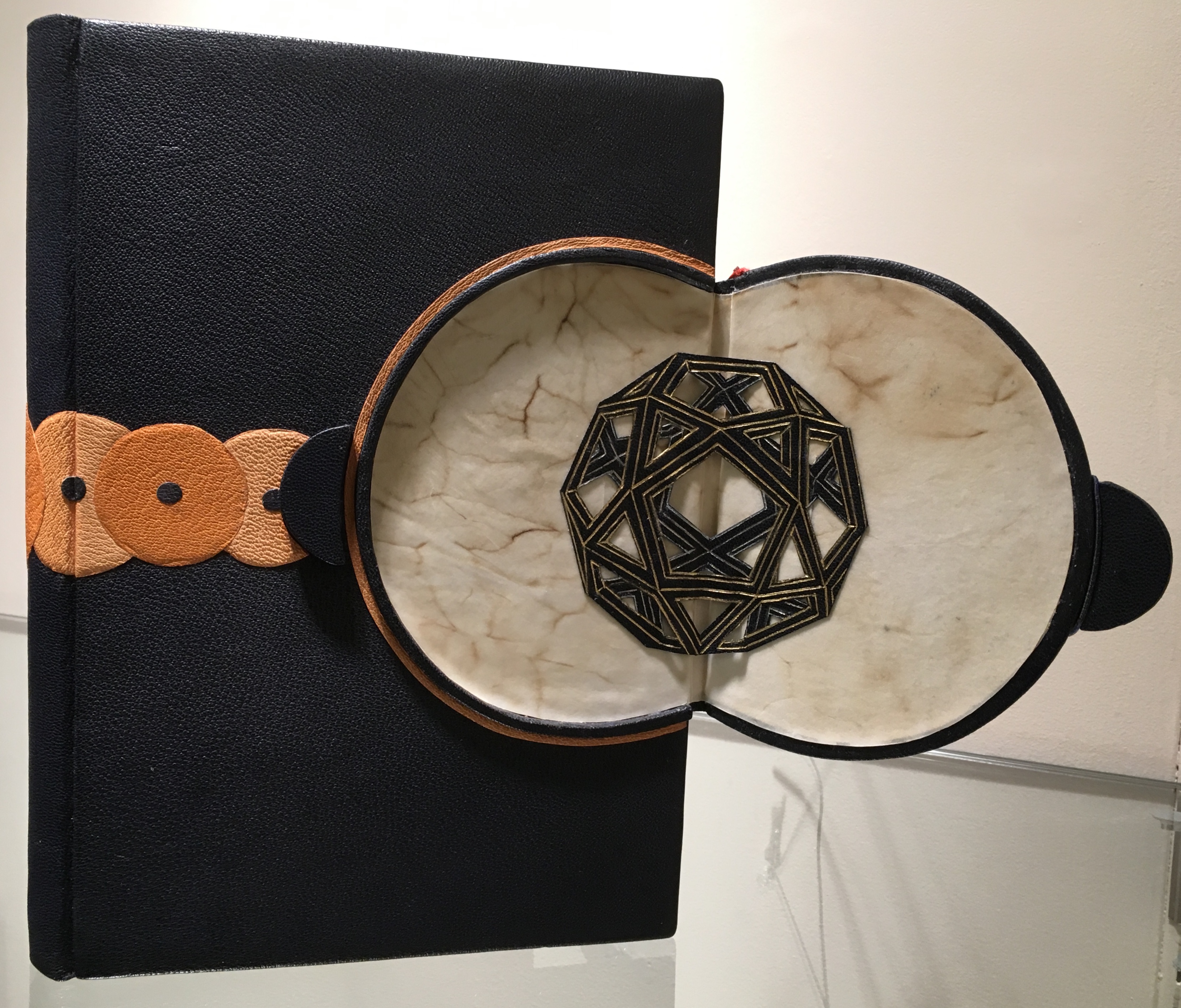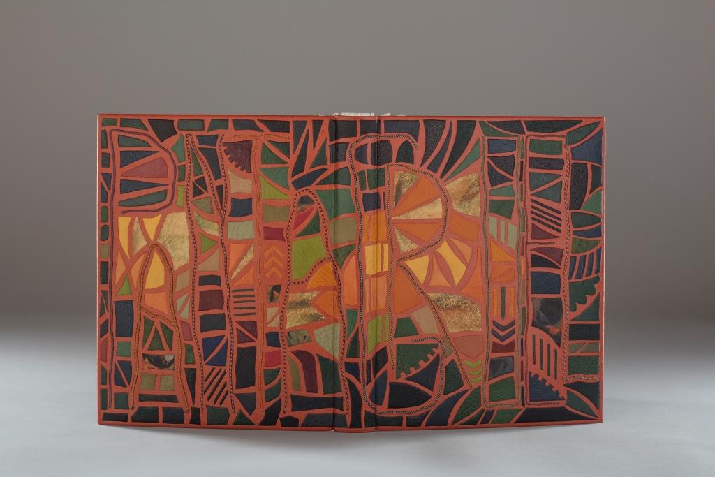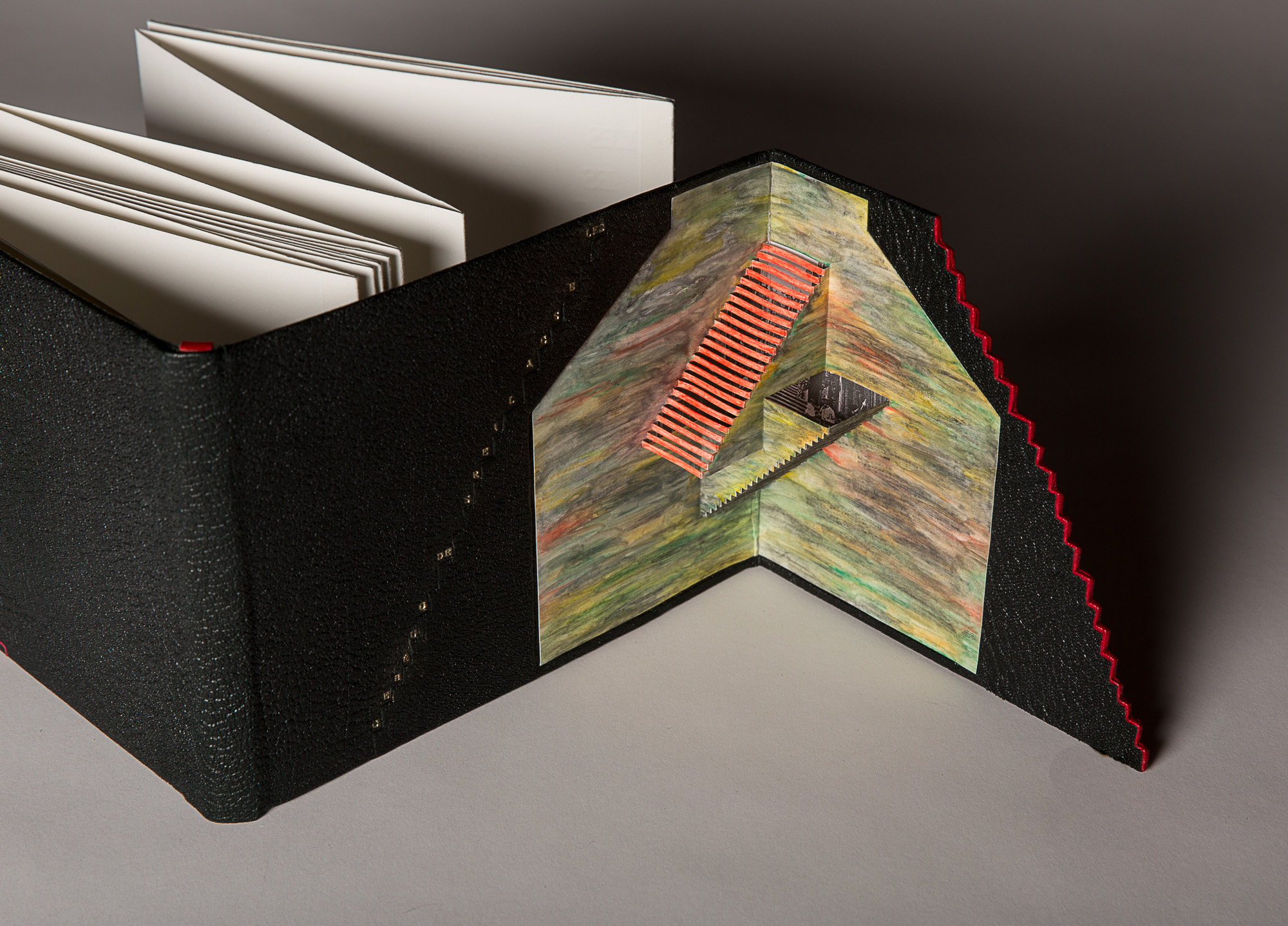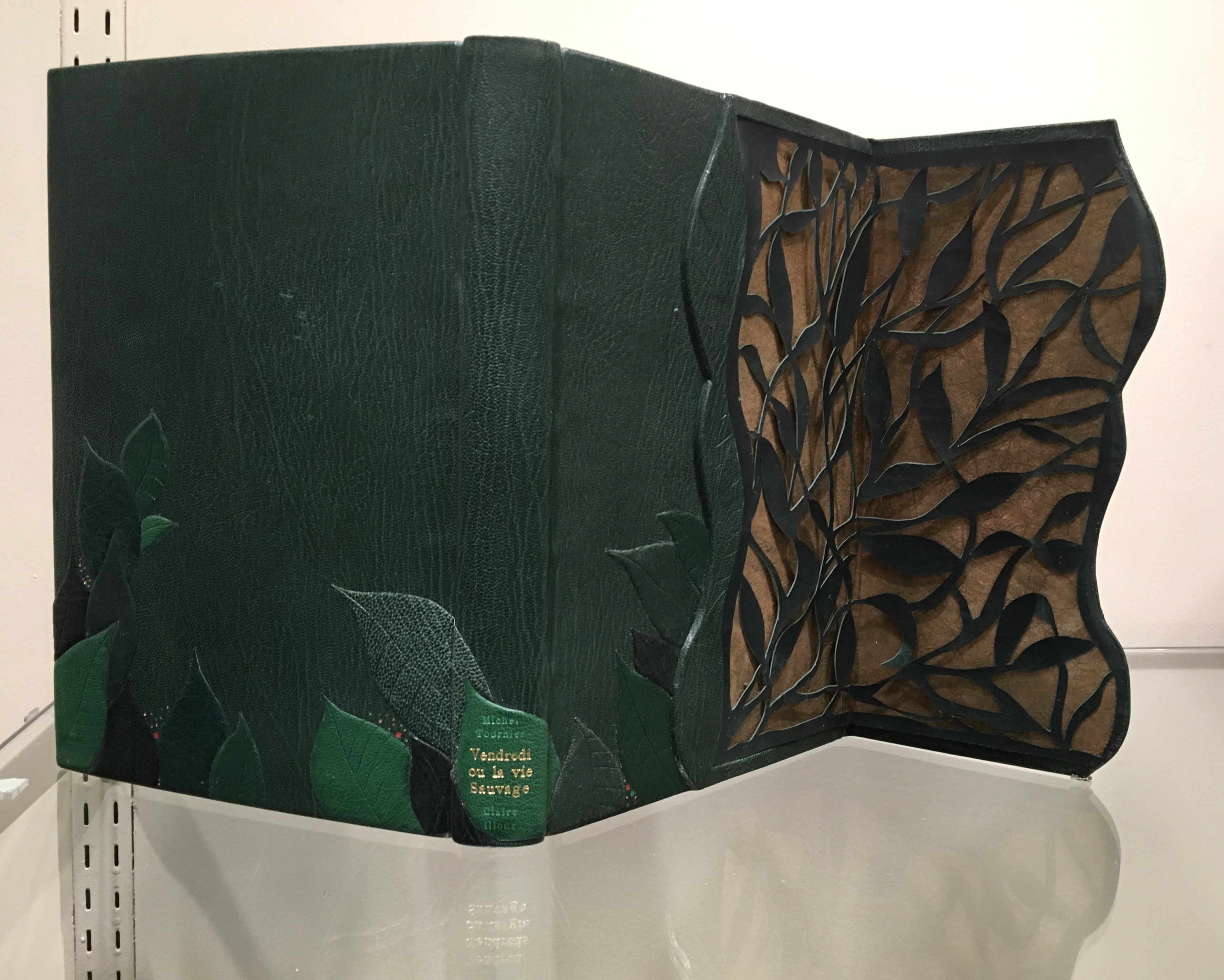 Excerpts from the Humorous Writings of Leonardo da Vinci (1996) The open panel reveals a geodesic dome in leather with gold and palladium tooling. With the panel closed, the front cover’s design echoes a Da Vinci machine.Lost and Found (2014)The illustrations inside the book come from previously lost engravings by Rachel Reckitt, some showing the blitz of London from which Lallier has drawn the inspiration for her hidden panel.Vendredi ou la Vie Sauvage (2015) Opening on layers on layers of carved foliage, the panel evokes the island on which Friday finds himself castaway in Michel Tournier’s version of Defoe’s Robinson Crusoe. In the exhibition, stand on tiptoe or someone’s shoulders to see the top edge’s coloring. Extraordinarily it resembles flower petals submerged in water. Les Escaliers de Québec (2013) Bound in black Morocco leather in the “drop spine” technique, this work unites the stair-stepping accordion form of the text with a gold-tooled title climbing the steps of the front cover panel, which opens on a hand-colored pop-up set of Escher-like stairs.