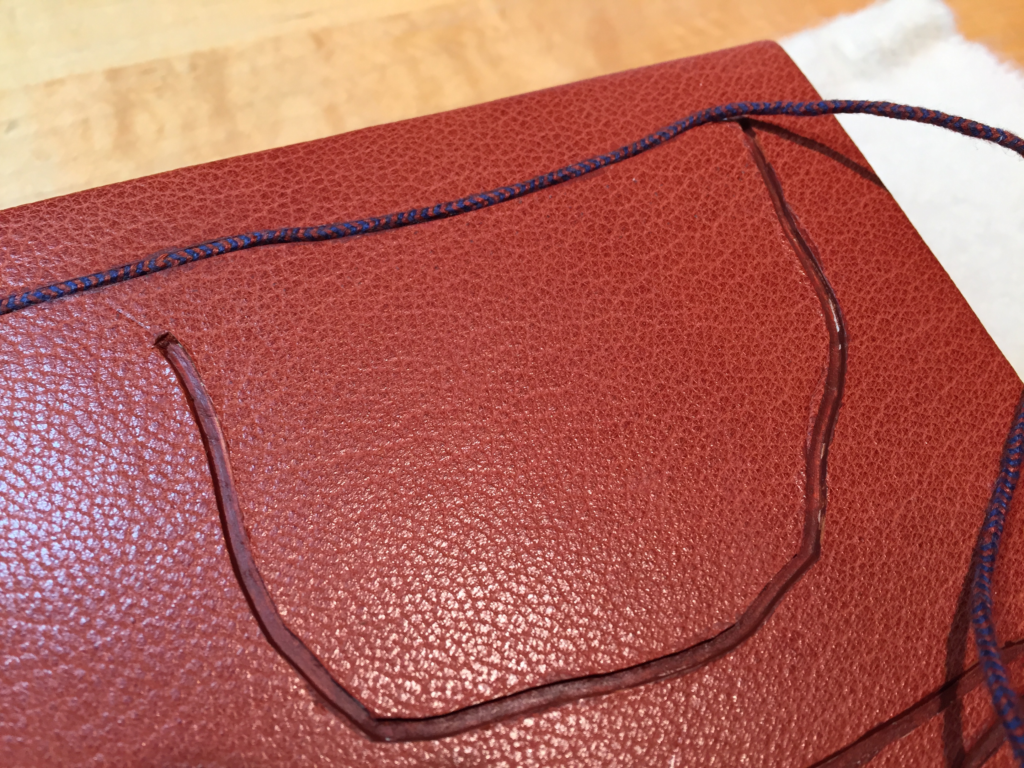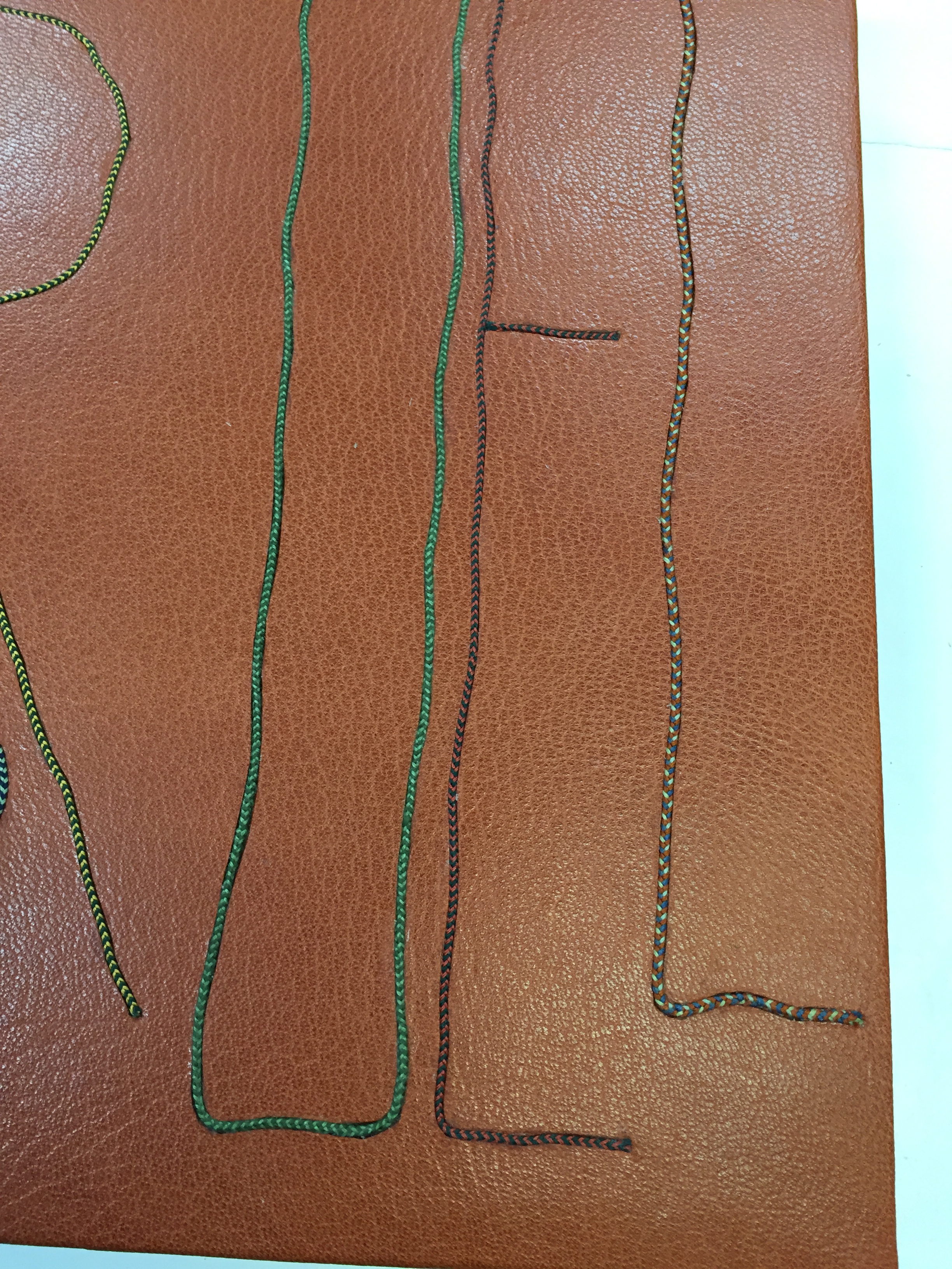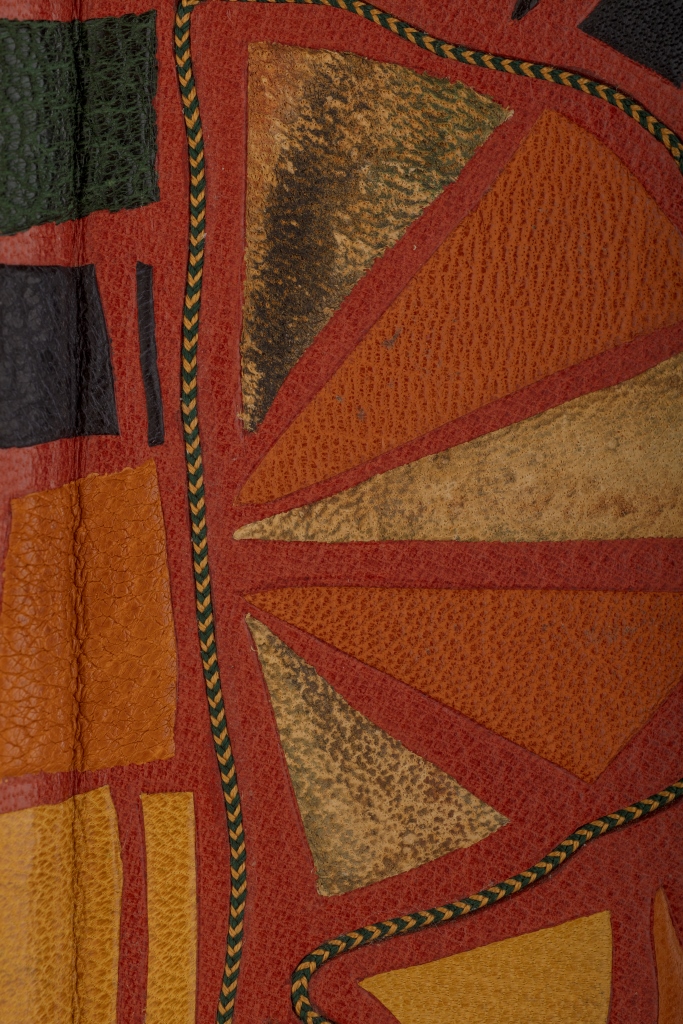 Which brings us to another characteristic of Lallier’s art to seek out: the painstaking handwork. For this, Pantagruel (2016) is worth a long look. Lallier once observed a student engaged in kumihimo braiding (the Japanese technique of using a disk to gather multiple threads of different colors into a single strand) and asked to be taught. Inspired by André Derain’s illustrations of Rabelais’ riotous satire, she set out to use braids for the title’s letters, filled and surrounded with the colors from the illustrations. Some of the leather inlays are handpainted; all — even the smallest — are handcut, beveled, tucked in the covering leather and tooled. The series of process photos below — all courtesy of the artist — provide a look behind the scenes.