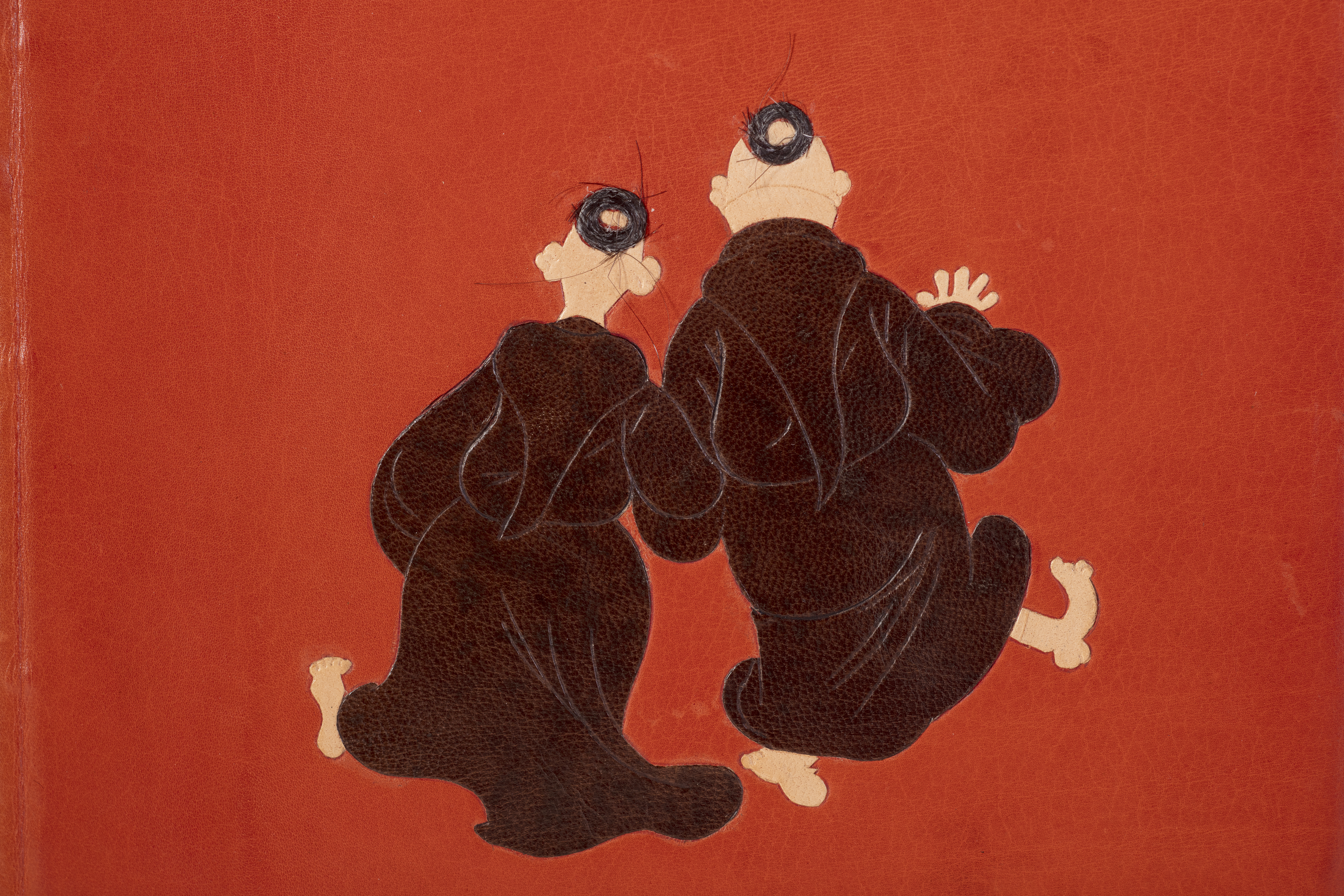 There is a sense of movement in this three-dimensional, sculptural treatment of the cover, which brings us to a final pointer for visitors. Lallier’s signature and most original technique — the front cover panel that swings open along the fore-edge to reveal a hidden design.