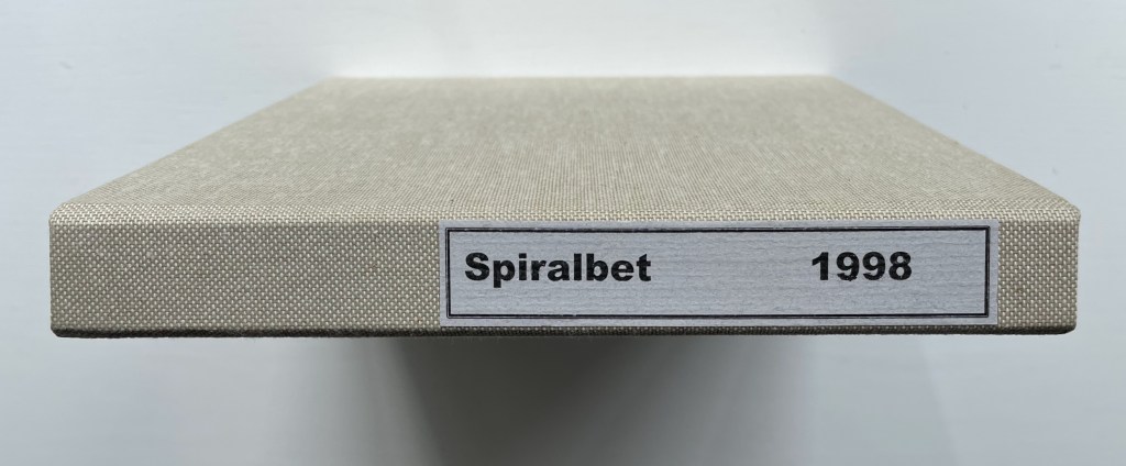 I print them with crop marks, cut the larger thing out and into quarters, and then cut around the individual letters (used to use a Havels #11, now I use a Swann Morton #10A scalpel blade, and a 6” ruler with sandpaper on the back so it does not slip for the straight bits, freehand for the curves). Years go by when I don’t need to make another, so I have a non-printing comment reminding me of the grain direction. If the letters were long grain, the structure would be limp and unsatisfying. … Assembly with 1/4″ 3M 415 tape. PVA would make it wrinkly. Mohawk Superfine Cover, I think 80#. Whatever printer I have at the time, now an Epson SureColor P5000. (Correspondence with Books On Books. 19 October 2021)