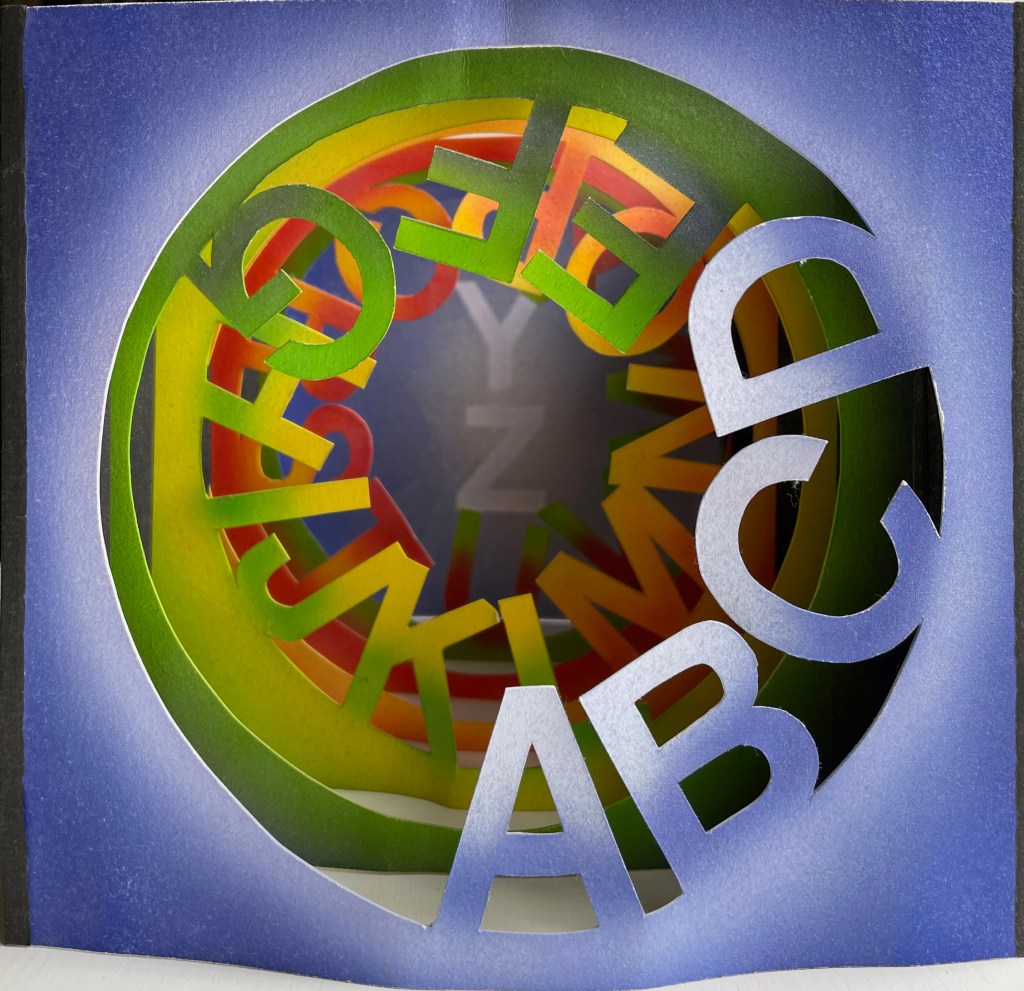 The Spectrum A-Z is a satisfying addition to the Books On Books Collection for several reasons. Accordion book, flip-book and pop-up book treatments of the alphabet abound, but this may be the only tunnel book treatment. If not, surely the blending of the the alphabet with tunnel book structure and the color spectrum secures its uniqueness. Also, the springiness achieved in this tunnel book makes it alive and special.