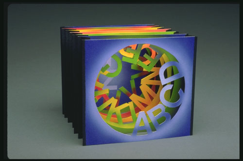 The Spectrum A-Z was made in response to a call from the Chicago Hand Bookbinders, which thrived from 1978/9 through 2009. The Biographical/Historical Note for the CHB archives mentions that, “Among its notable projects was a series of fifteen collaborative artist’s alphabet books in varying formats, created between 1987 and 2004”. Of course, from time to time, other “organizations of the book” have issued calls for artist alphabet books. But with the infinite gradations in Roy G. Biv‘s spectrum and the customizability within Creative Suite, surely now another call is bound to result in a rainbow of followers of Hanmer’s innovation.