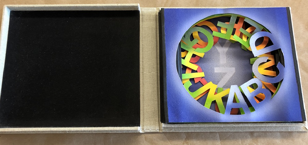 This work was first spotted in the online catalogue for Abecedarium: An Exhibition of Alphabet Books (1998) from the Guild of Bookworkers. Being a small thumbnail on the second screen or page and accessed only by clicking on the artist’s name, its discovery was serendipitous. Its still being available was pure luck.