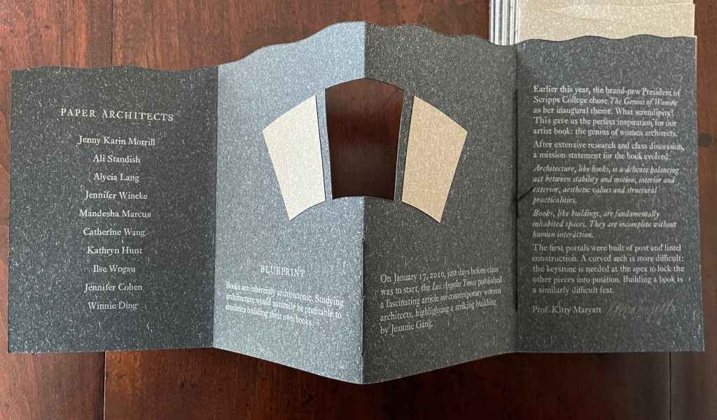 Arch (2010), created by ten students at Scripps College under the direction of Kitty Maryatt, reminds us that the creation of a book — even a work of book art — is a collaborative effort. All the students involved in the design, planning and production were women, a happenstance serendipitously blessed ahead of time by a Los Angeles Times article celebrating women architects. Drawing on that article and Maya Lin’s Boundaries (2000) as well as other research, the students agreed on a mission statement for the work: “Architecture, like books, is a deliberate balancing act between stability and motion, interior and exterior, aesthetic values and practicalities. Books, like buildings, are fundamentally inhabited spaces. They are incomplete without human interaction.”