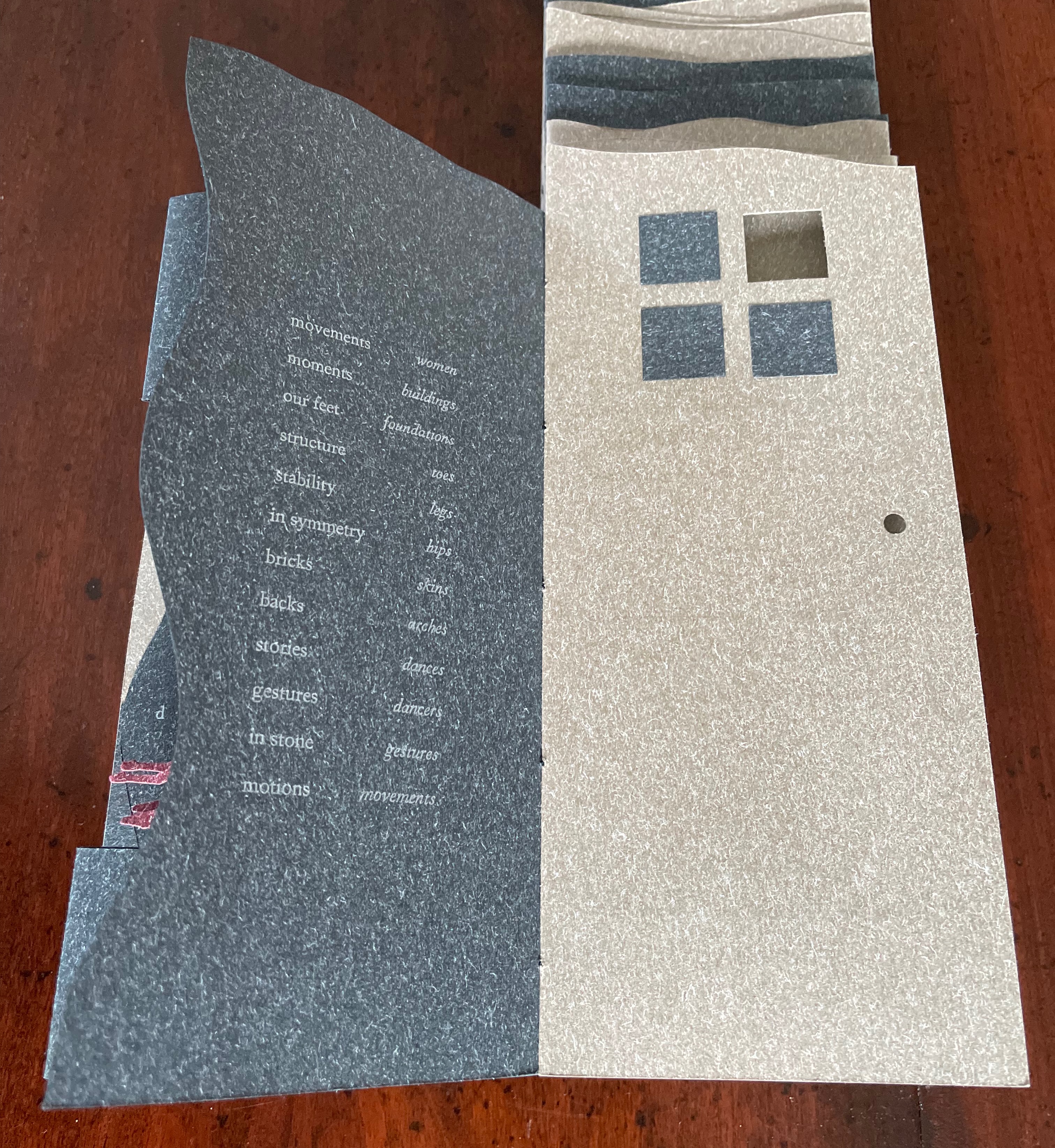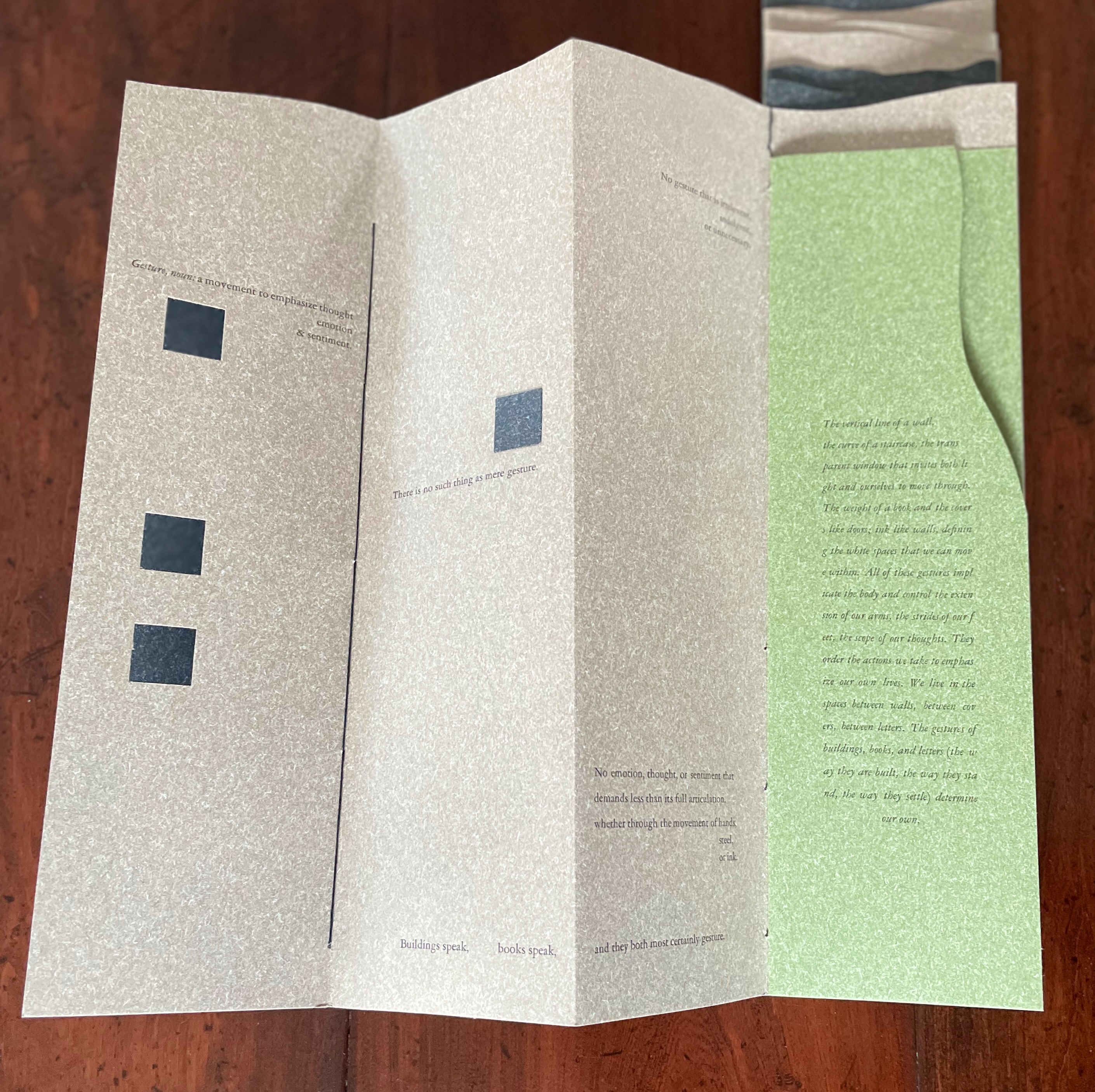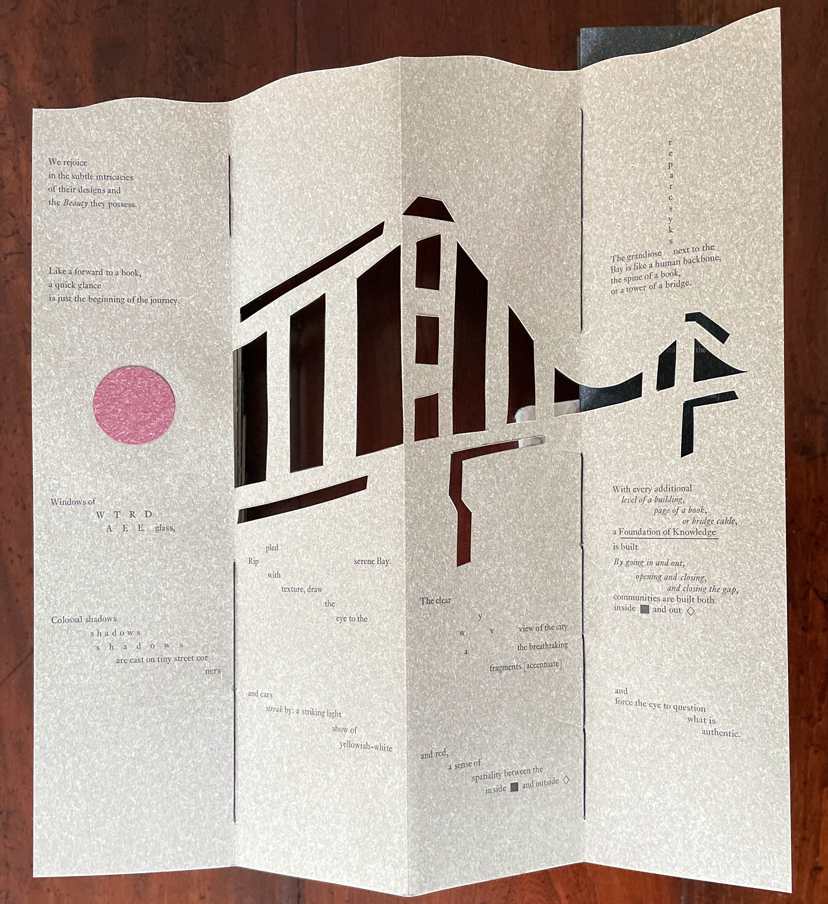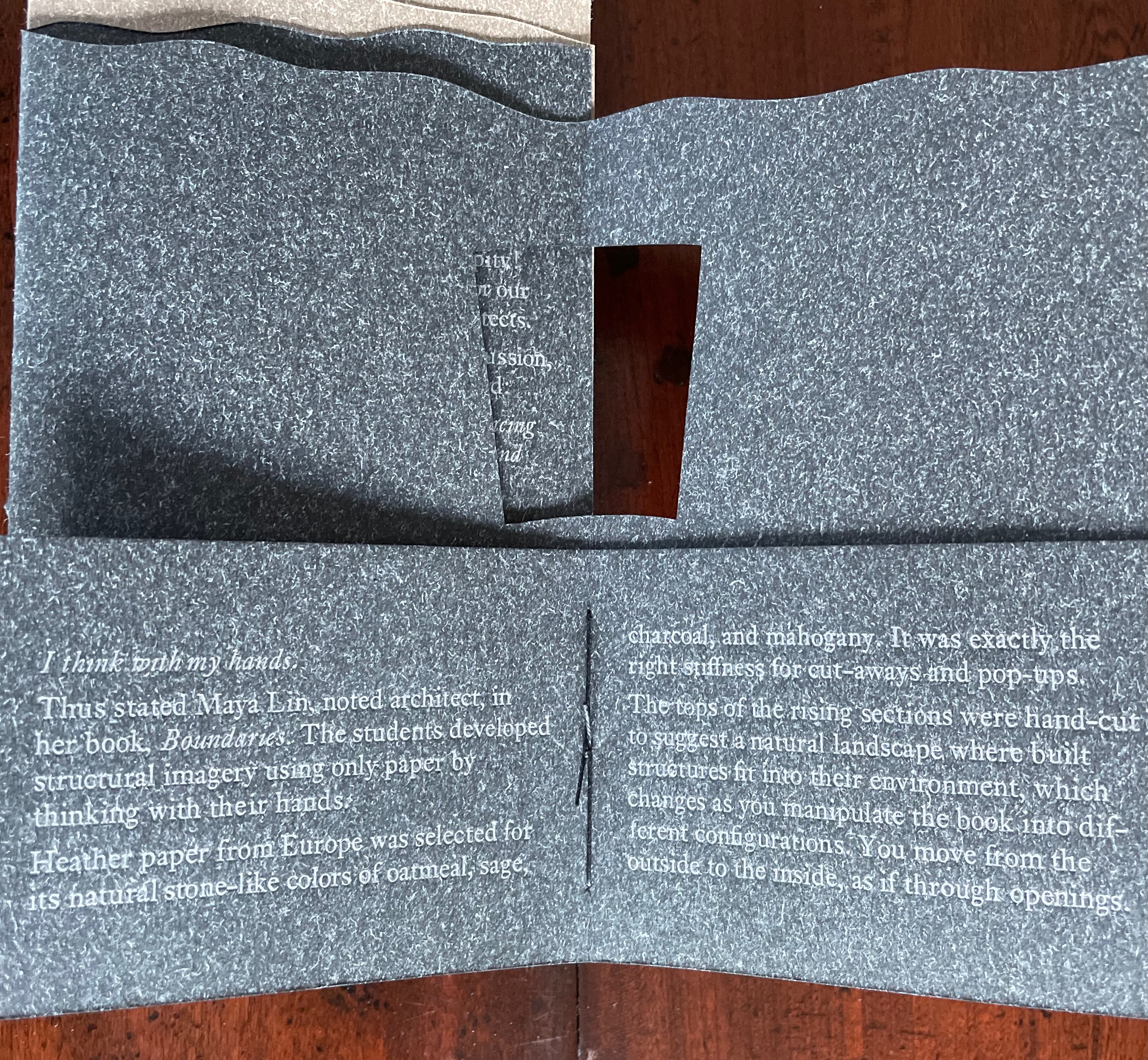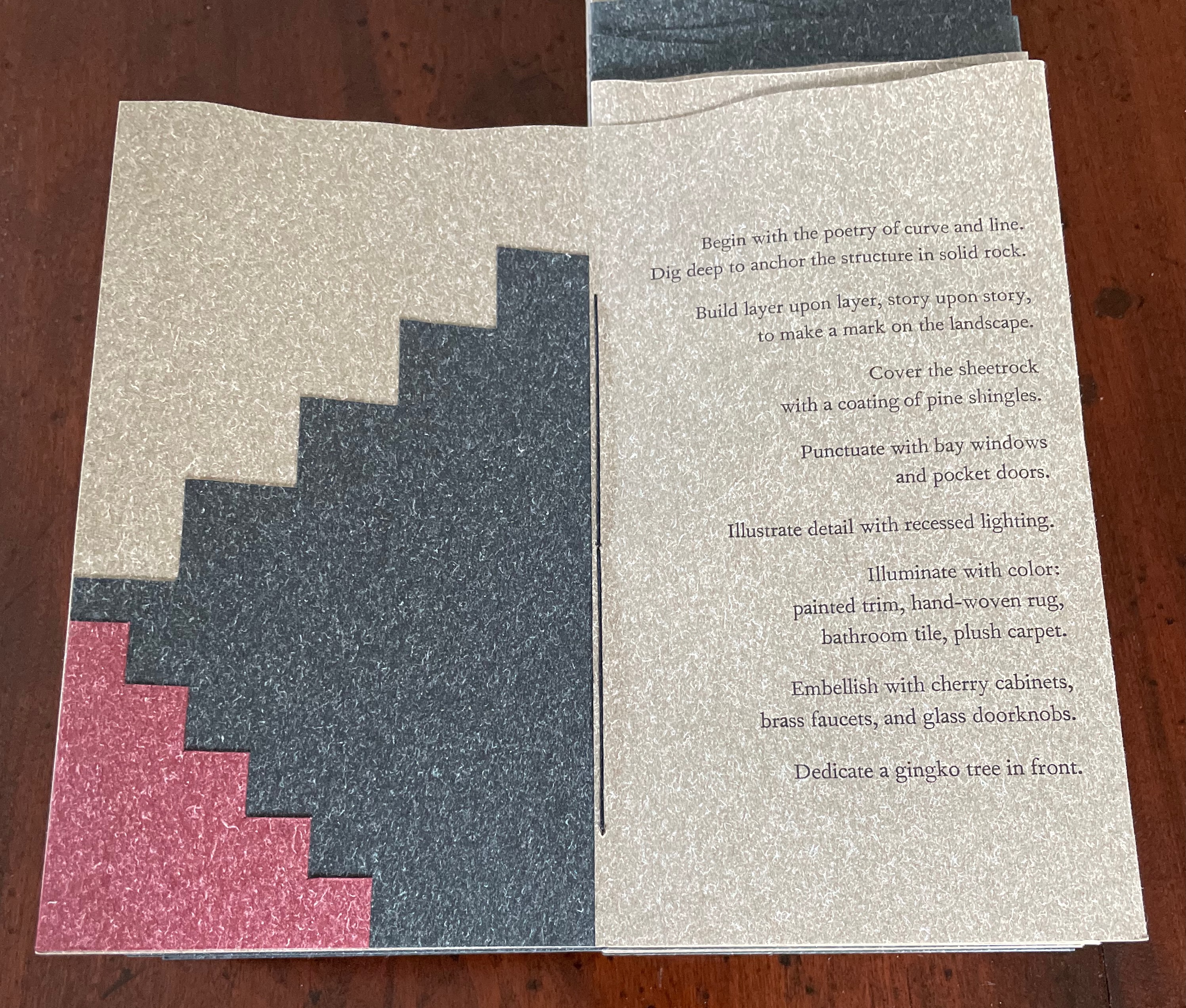 The next booklet lists the sources of architectural inspiration, and as the lattice door on the list’s facing page turns, two sets of stairs, cutouts in contrasting colors, ascend on the verso page to the text that begins at the top of the recto page and ends at the foot of descending stairs on the next double-panel spread. Like Maya Lin, Maryatt’s students built their works by learning to think with their hands. The reader, too, has to think with the hands to experience fully this booklet and those that follow. The whole work conjures up the titles of Juhani Pallasmaa’s books — The Thinking Hand and The Embodied Image. Readers of this online entry will have to expand the images below, enjoy the words and imagine their way through with the title of another of his books — The Eyes of the Skin.