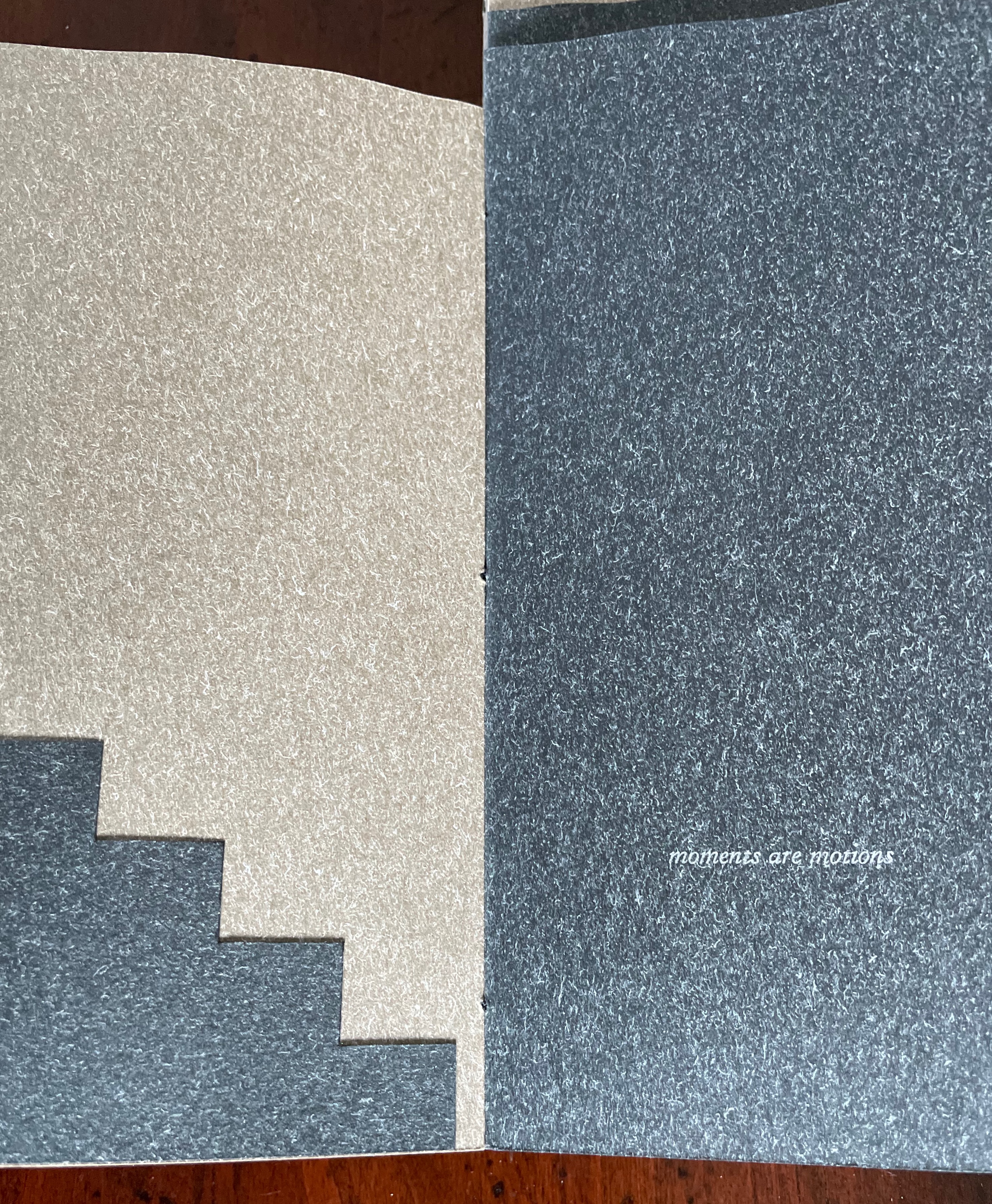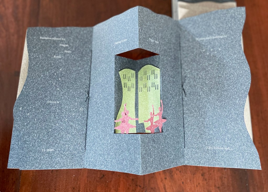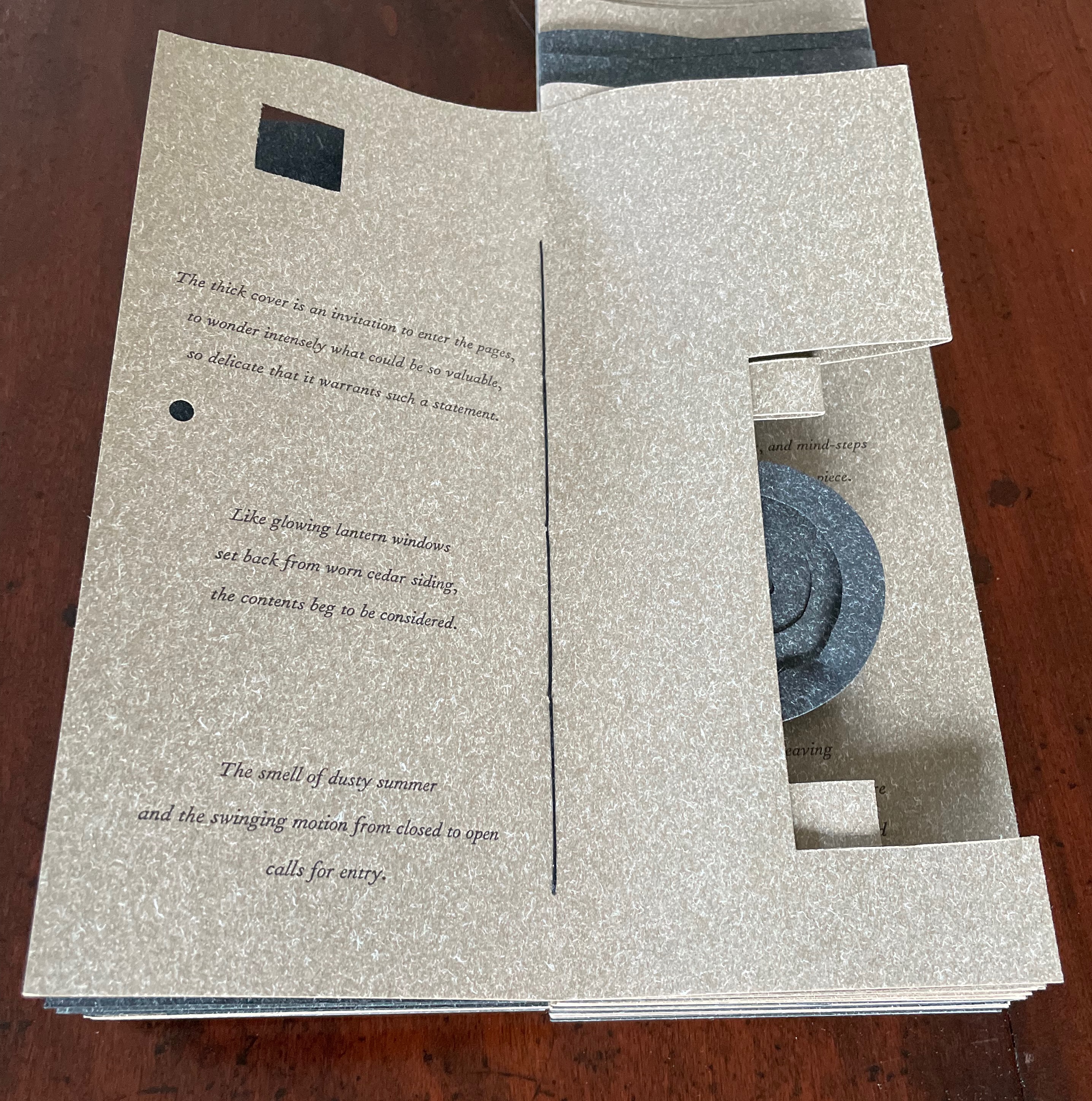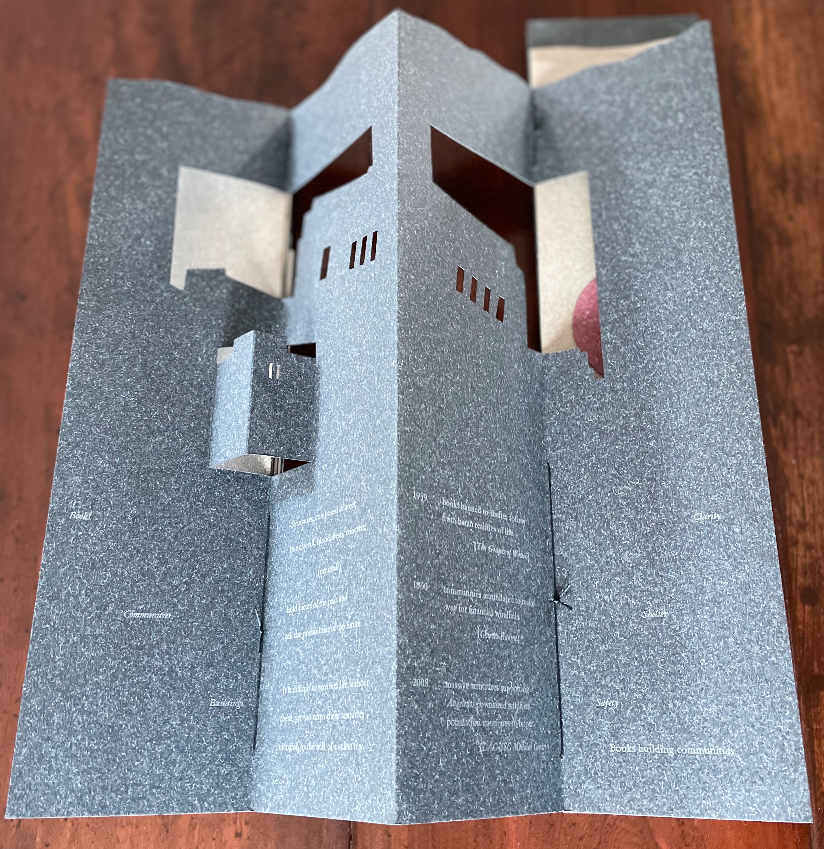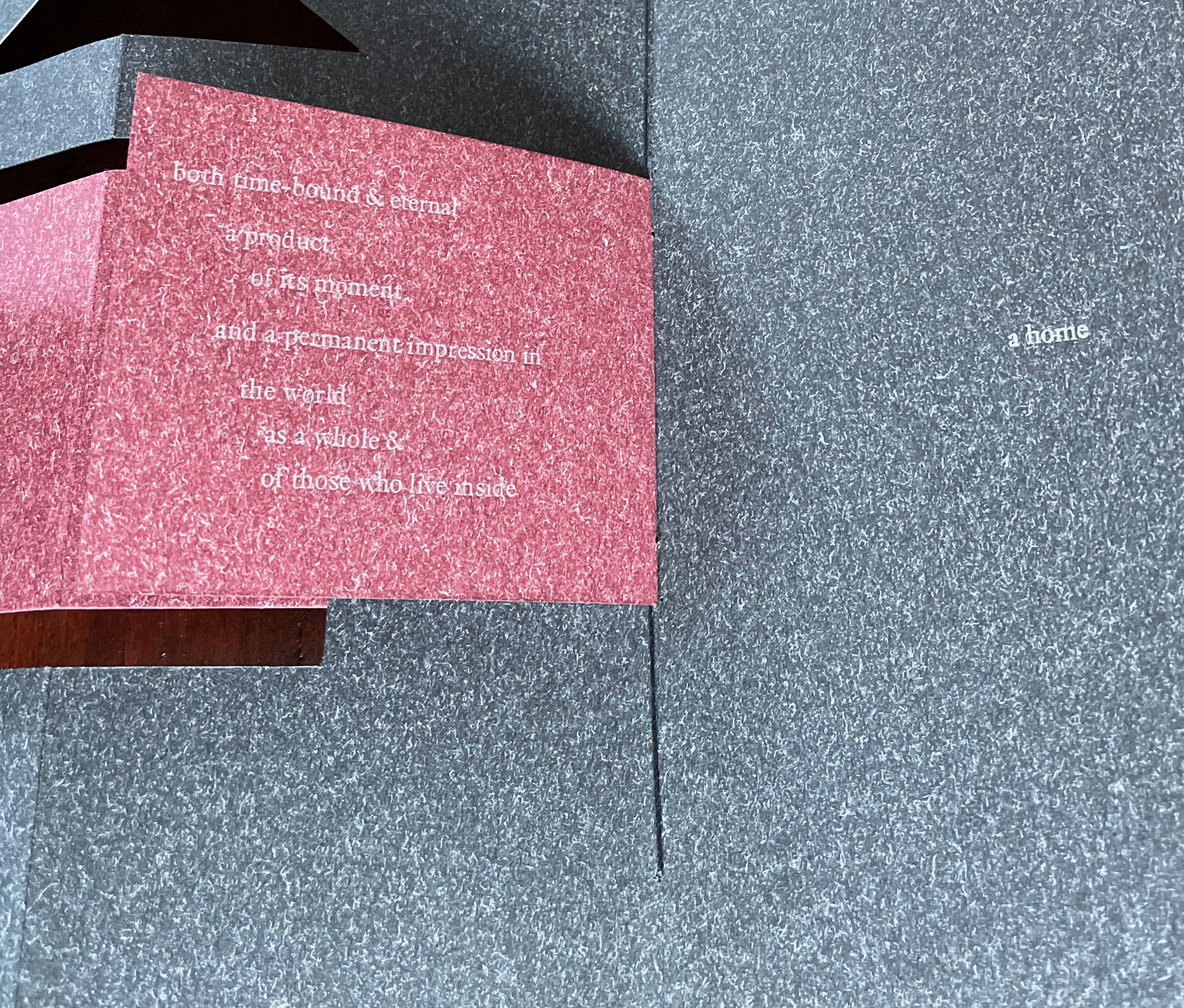 The next booklet lists the sources of architectural inspiration, and as the lattice door on the list’s facing page turns, two sets of stairs, cutouts in contrasting colors, ascend on the verso page to the text that begins at the top of the recto page and ends at the foot of descending stairs on the next double-panel spread. Like Maya Lin, Maryatt’s students built their works by learning to think with their hands. The reader, too, has to think with the hands to experience fully this booklet and those that follow. The whole work conjures up the titles of Juhani Pallasmaa’s books — The Thinking Hand and The Embodied Image. Readers of this online entry will have to expand the images below, enjoy the words and imagine their way through with the title of another of his books — The Eyes of the Skin.