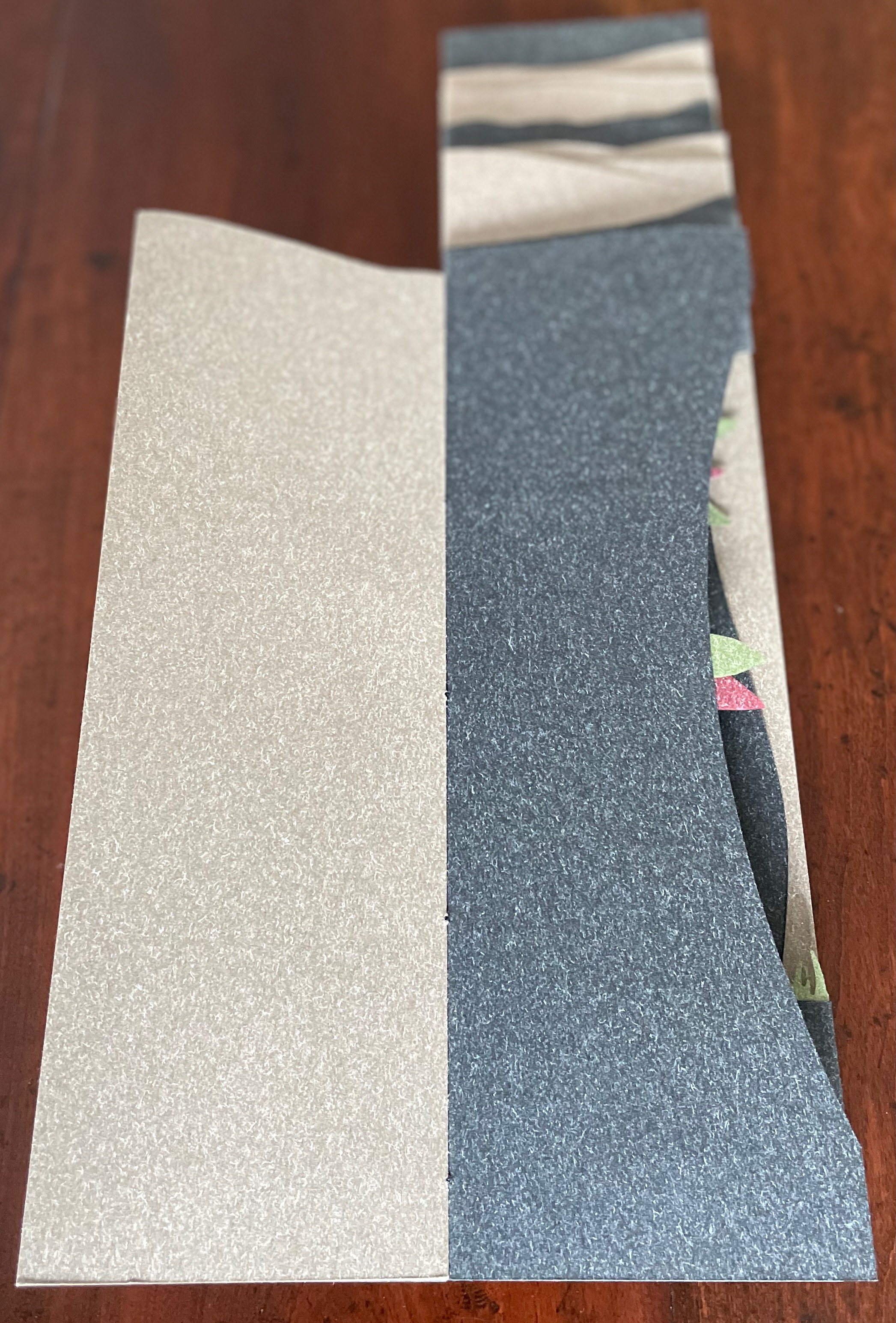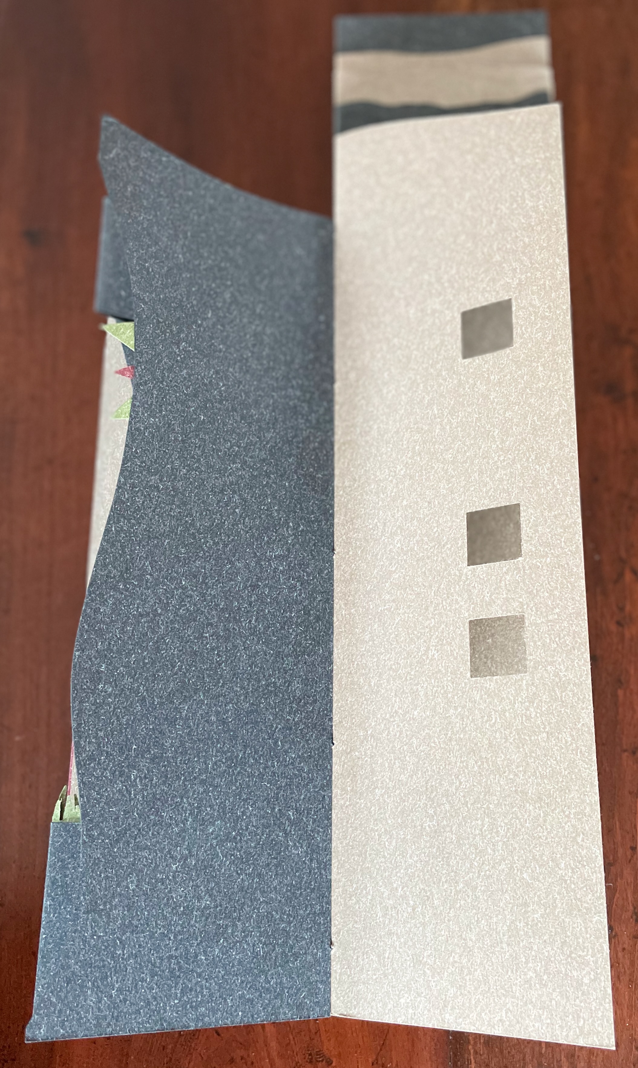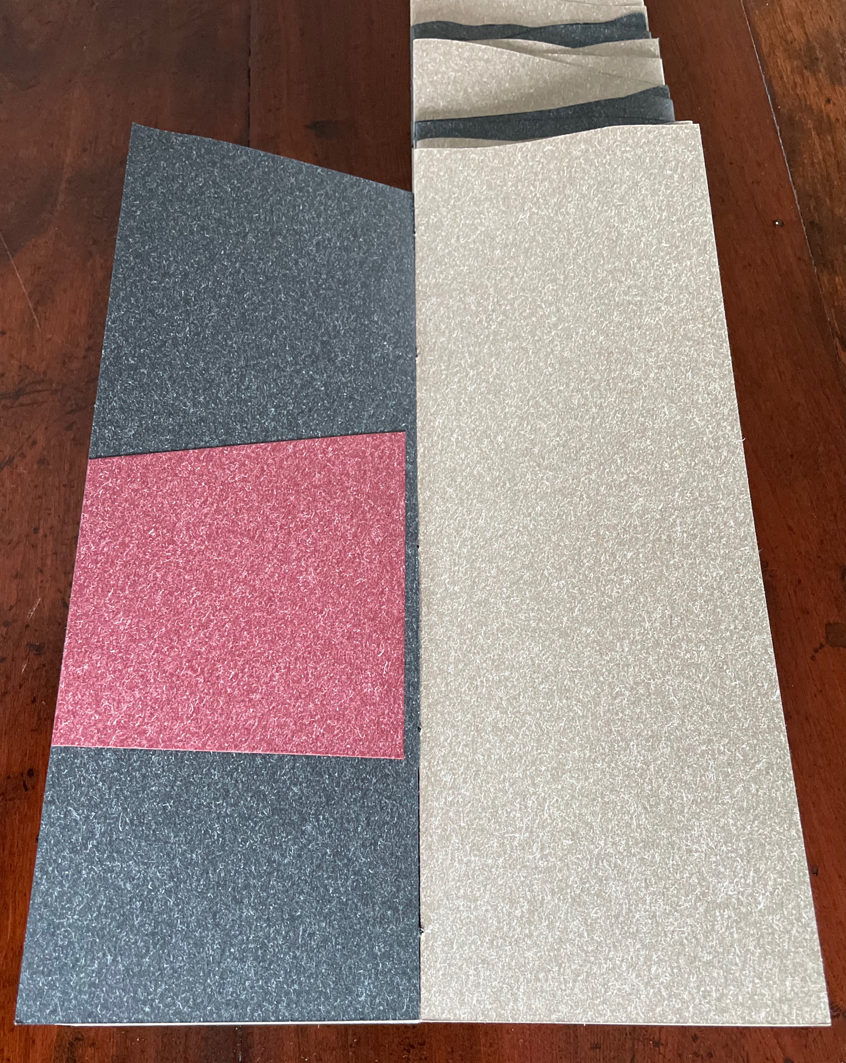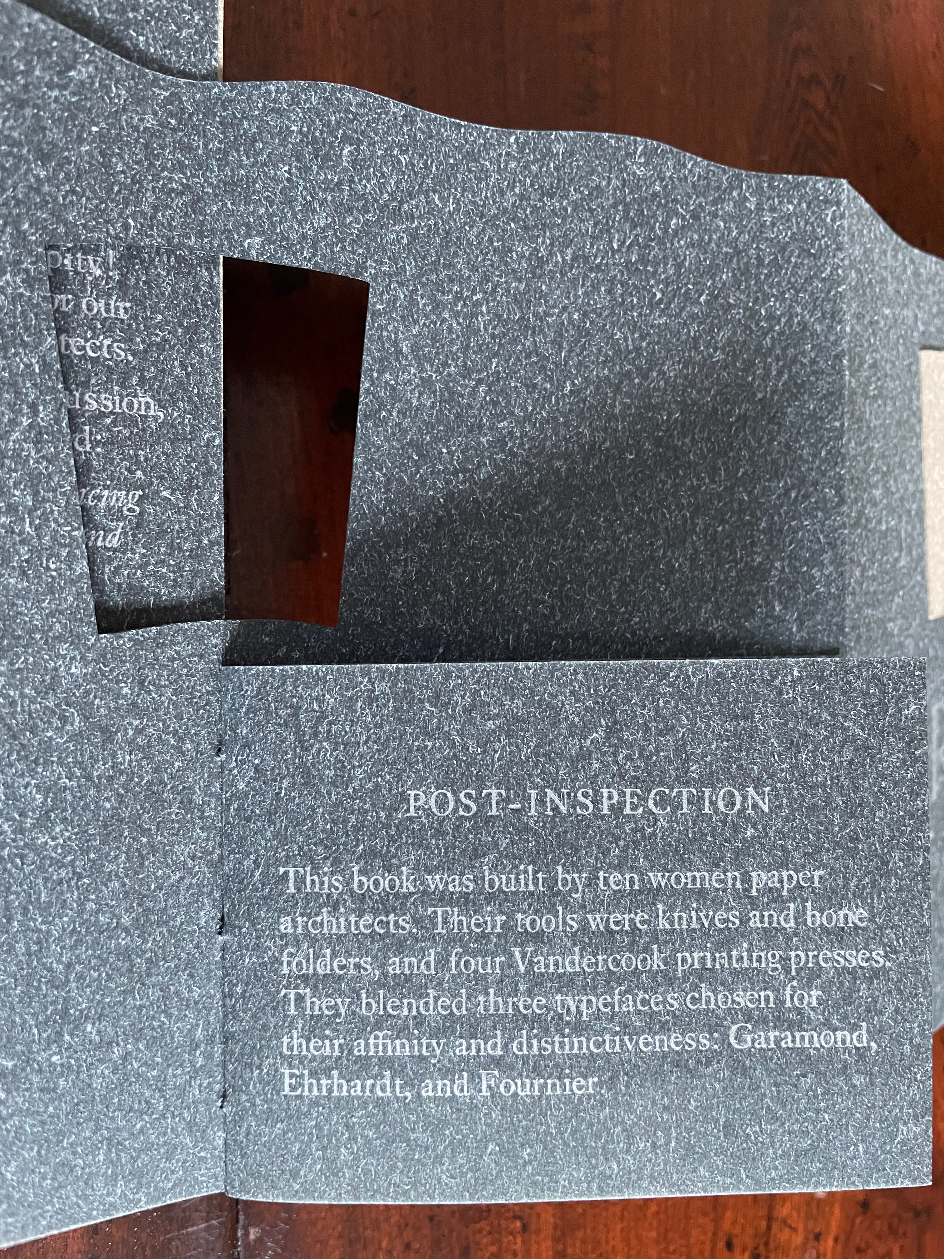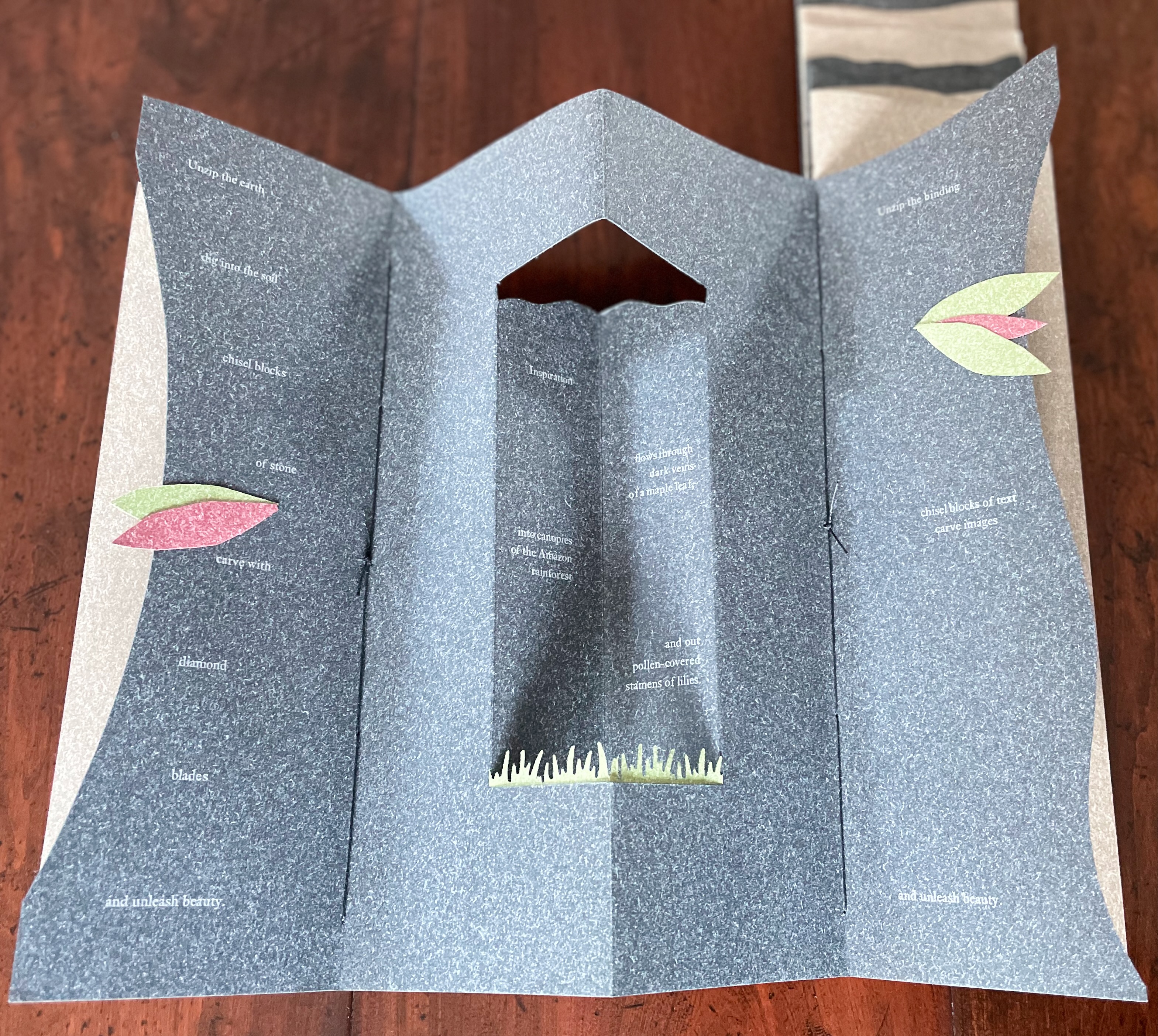 The next booklet lists the sources of architectural inspiration, and as the lattice door on the list’s facing page turns, two sets of stairs, cutouts in contrasting colors, ascend on the verso page to the text that begins at the top of the recto page and ends at the foot of descending stairs on the next double-panel spread. Like Maya Lin, Maryatt’s students built their works by learning to think with their hands. The reader, too, has to think with the hands to experience fully this booklet and those that follow. The whole work conjures up the titles of Juhani Pallasmaa’s books — The Thinking Hand and The Embodied Image. Readers of this online entry will have to expand the images below, enjoy the words and imagine their way through with the title of another of his books — The Eyes of the Skin.