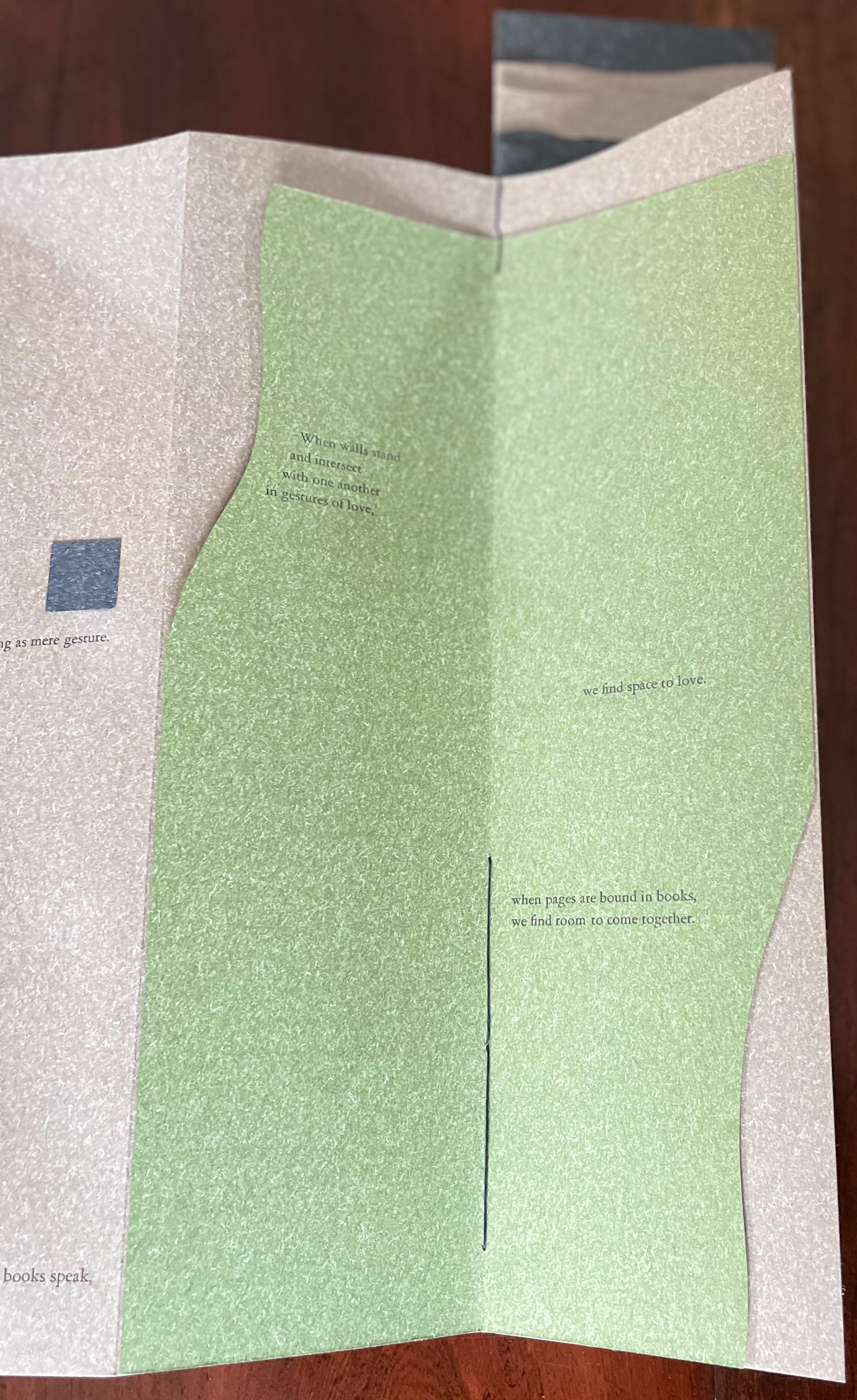 More than the novel inventions and historical associations above, though, the space within and around a letter, a building and the artist’s book suggests the real root of the affinity. As cultural historian Fiona MacCarthy put it: “‘the Italians knew by instinct what we are slowly grasping, that the meaning of the city is not so much a matter of the buildings as the spaces in between.’” To which John Ryder added: “‘This is exactly how typography works.’” (From David Esslemont’s Inside the Book, 2002). And it is exactly how book art works.