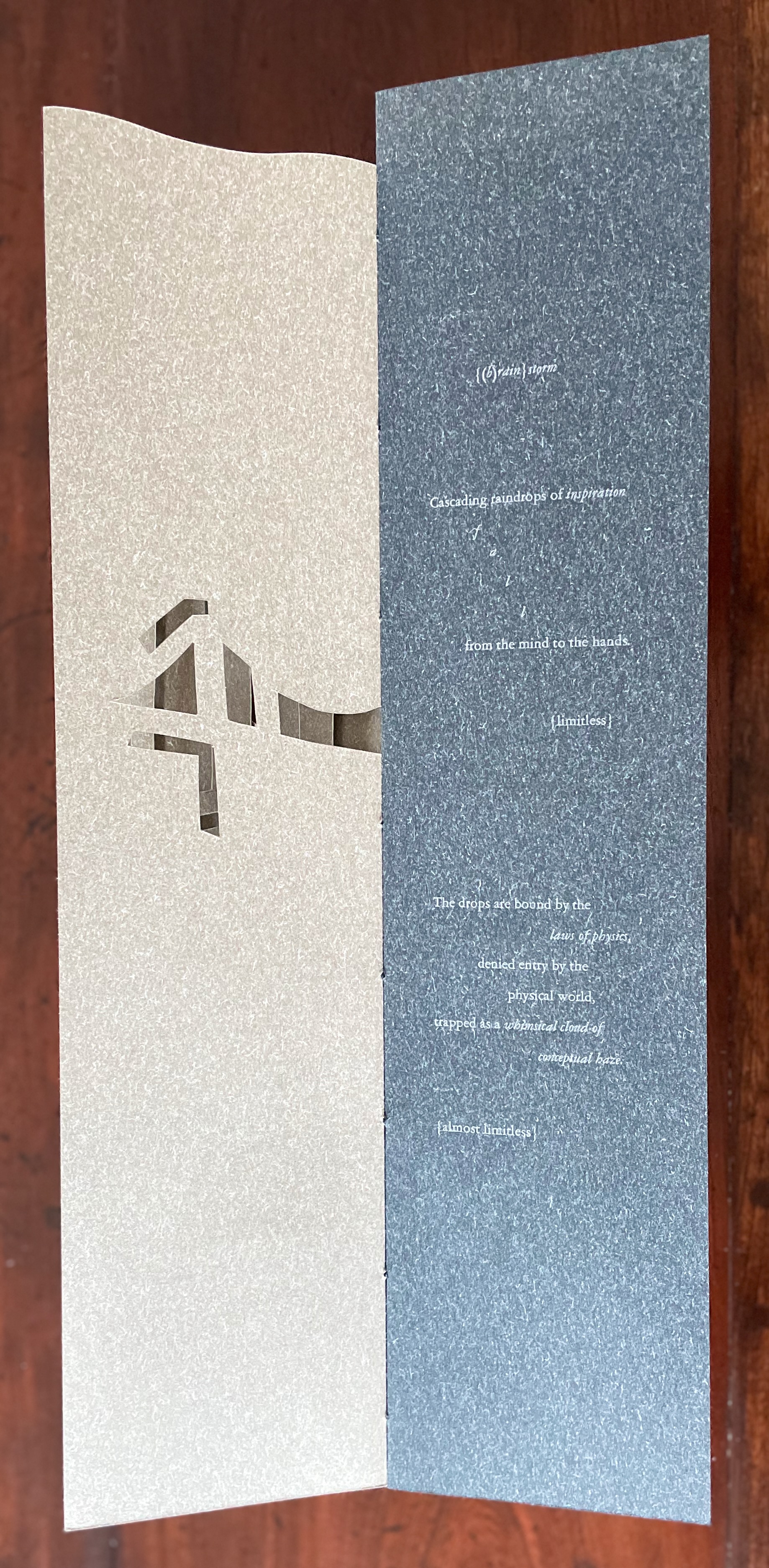 Perhaps the story of the little “i” left over – the colophon – will prod the future historians of book art to examine bookworks and their artists’ websites for those finishing touches and stir artists to bestow that last finishing touch for the sake of the work’s soul if not their own.