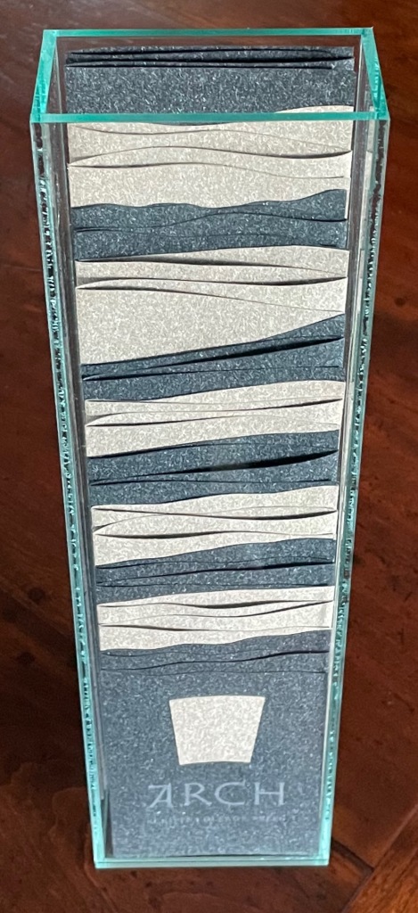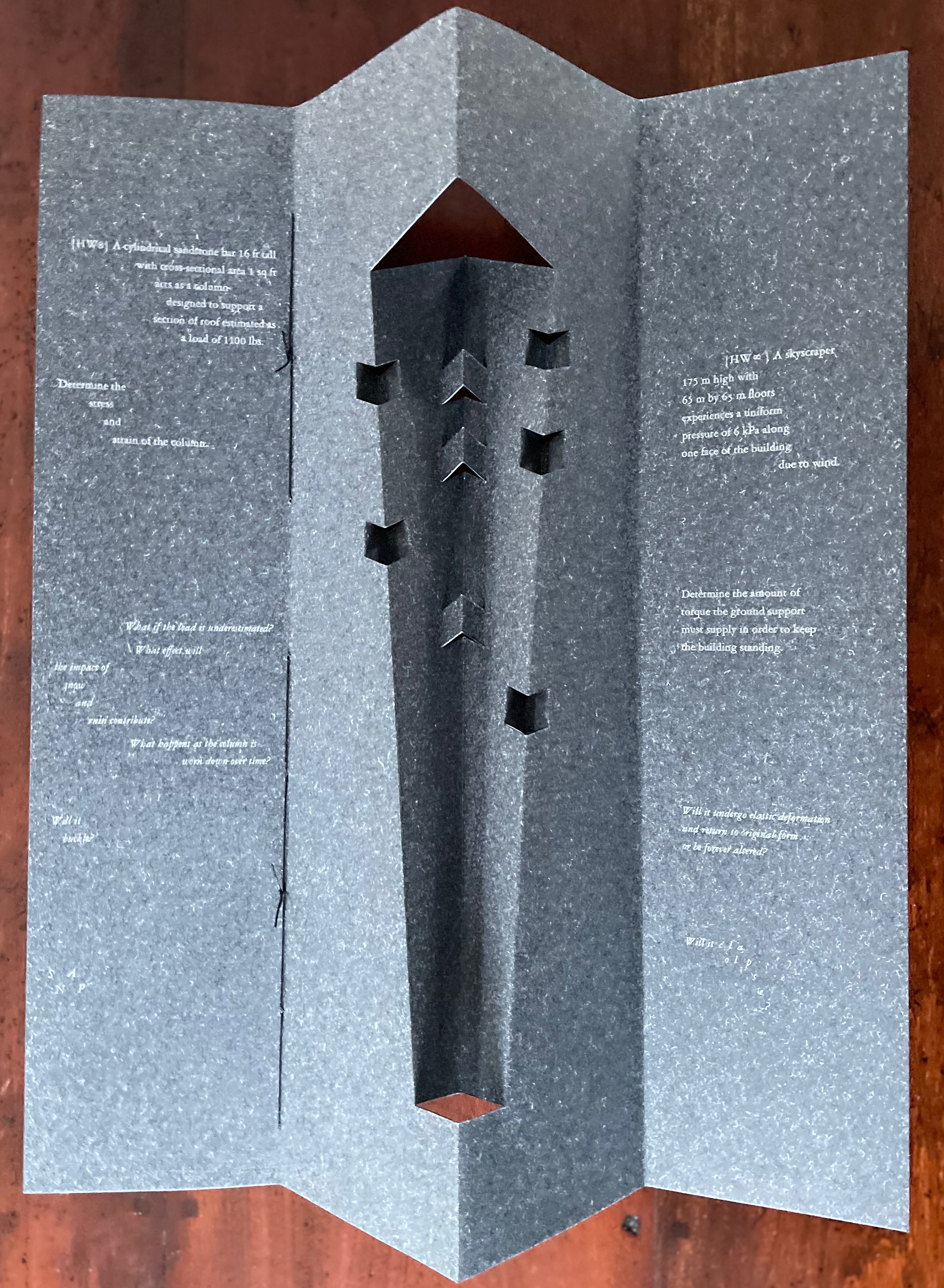 Clever structural use of paper with a stone-like appearance, paired with apt choices of text matched with equally judicious choices in typography, evoke the similarities between books and buildings. Each architect/bookmaker’s contribution is a self-covering booklet in leporello format. Of different heights, the booklets are sewn together to create a tiered tower to be housed in an acrylic slipcase.