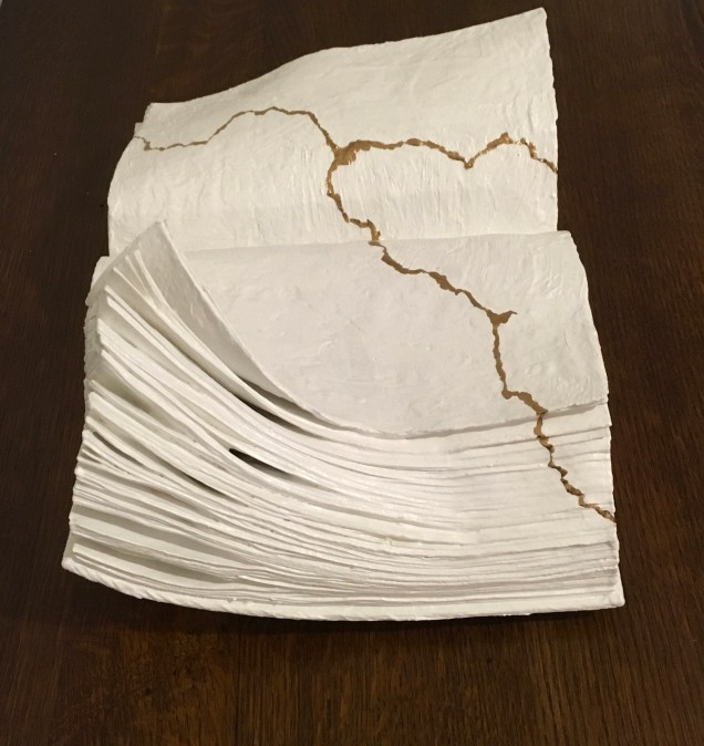After a couple of weeks I decided to glue it back together using construction adhesive and thought I would use gold leaf to highlight the cracks. While I was thinking about how to do it (what kind of glaire to use etc), someone told me about kintsugi. I ended up using gold acrylic (Golden). I went ahead and submitted it and it was accepted.[Correspondence with Books On Books, ]
