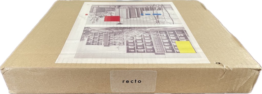 Although Theodore Roethke had a woman in mind when he wrote “The shapes a bright container can contain!”, the phrase readily comes to mind for this issue of Inscription once you’re past the difficult-to-brighten-up cardboard packaging. Not that you should rip through and discard it. The clues to proceed patiently are the label “recto” on one edge of the box and the page cut from a book and pasted on the box’s top. Is “recto” some sort of “this side up” label? If so, it seems topsy-turvy. Recto (or right-hand) pages are usually have odd-numbered, but the pasted-down book page is numbered 20. Wait a second; those random colored rectangles have been printed over the book page as if meant to draw attention to the “gridness” of the apartment blocks. Maybe this box is meant to be preserved and framed (after all, Toulouse-Lautrec drew on cardboard).