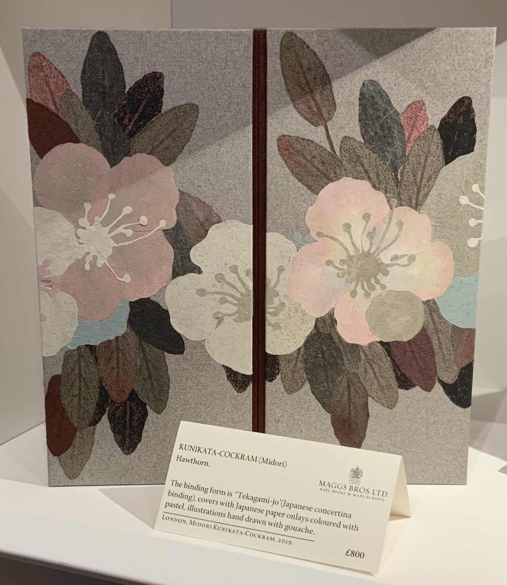 Two works by Midori Kunikata-Cockram were on display: Hawthorn (2019) and African Grey Parrots (2010). You can find other examples of her bindings in the British Library’s Database of Bookbindings. The two examples shown here, however, could be pulled from the shelf, opened, closed and examined. If you zoom in on the left-hand panel above, you might see that one of the stamens of the hawthorn blossom floats above the petal. That kind of attention to detail makes this work of otherwise muted colours a vibrant thing you can feel with your eyes.