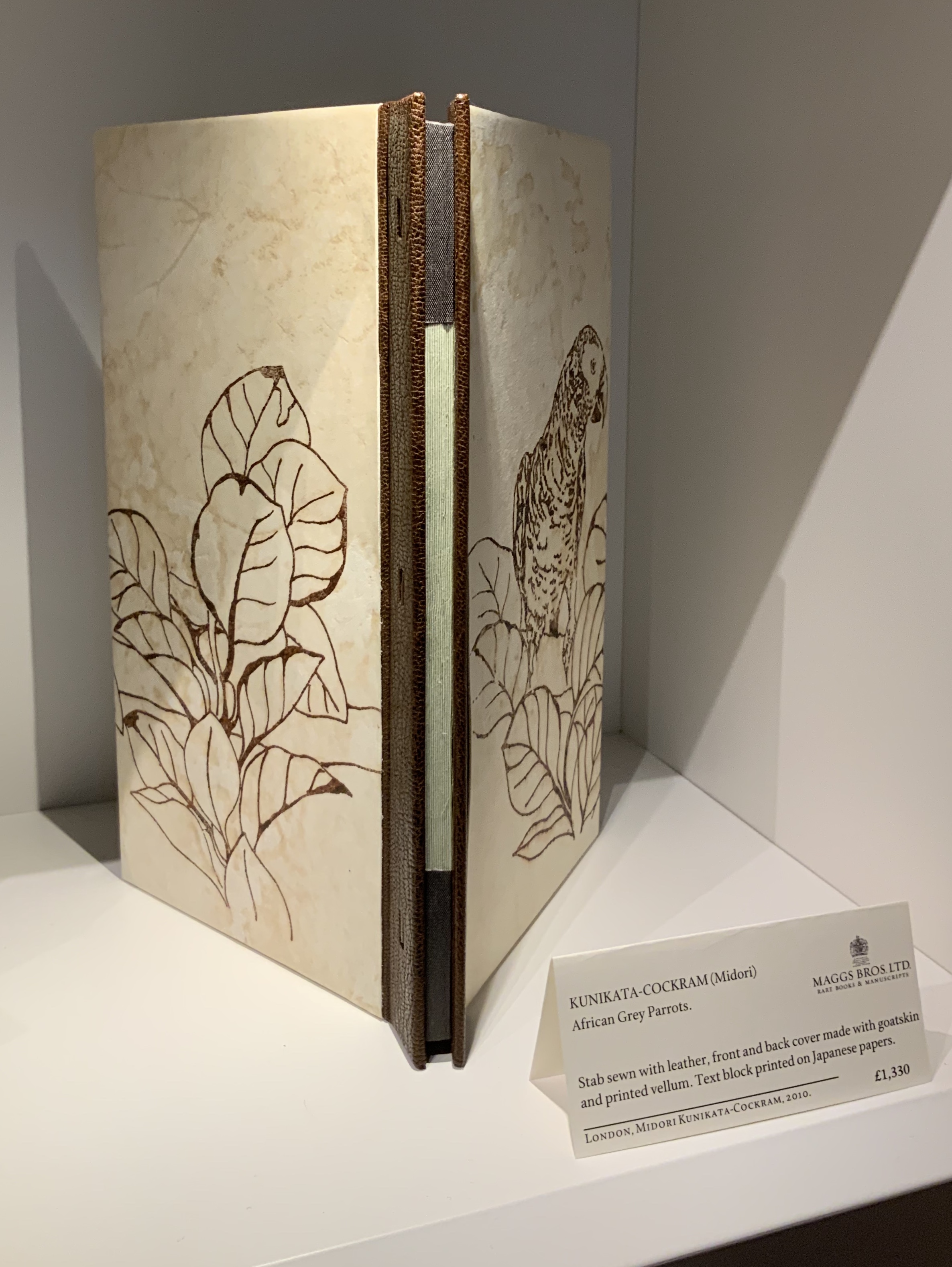 Meeting Mark Cockram at the exhibit was welcome serendipity. Not only did he tell me about African Grey Parrots’ being Kunikata-Cockram’s response to their keeping a parrot during a friend’s vacation, he pointed out the meticulous registration within pages and across the recto to verso pages. The feel and appearance of the cover’s vellum is just as breathcatching.