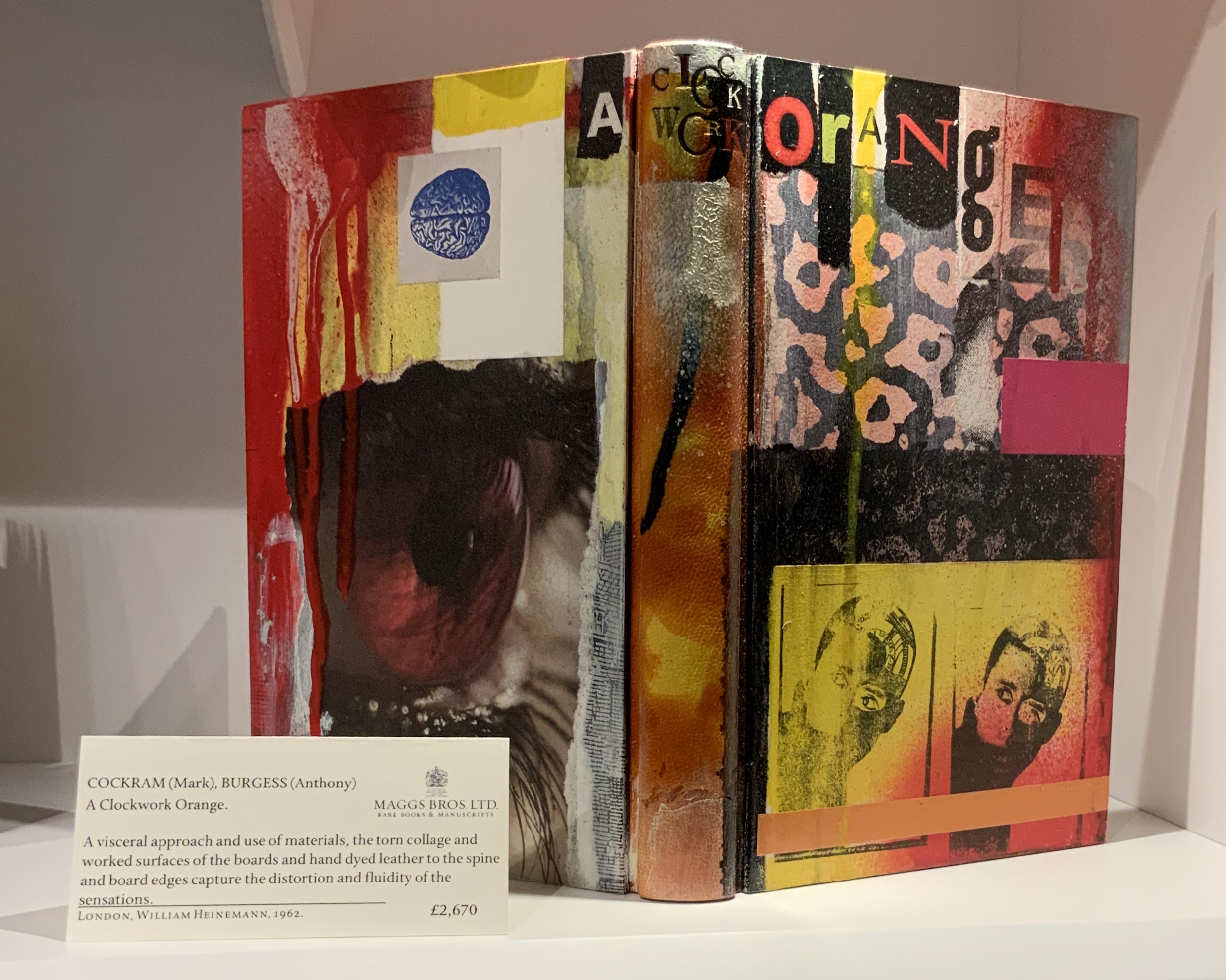 The pages of Cockram’s oversized contribution to “psycho-geography” feels like they had been pulled off hoardings to be bound in the sidewalk-grey leather. At a more textual end of the spectrum is his on-spec binding of this edition of A Clockwork Orange, signed by Anthony Burgess. The way the title spreads across the back cover, spine and front cover almost forces a handling of the book — turning it over from front to back then back to front — and, in the process, feeling the collaged textures of the boards bound to the spine.