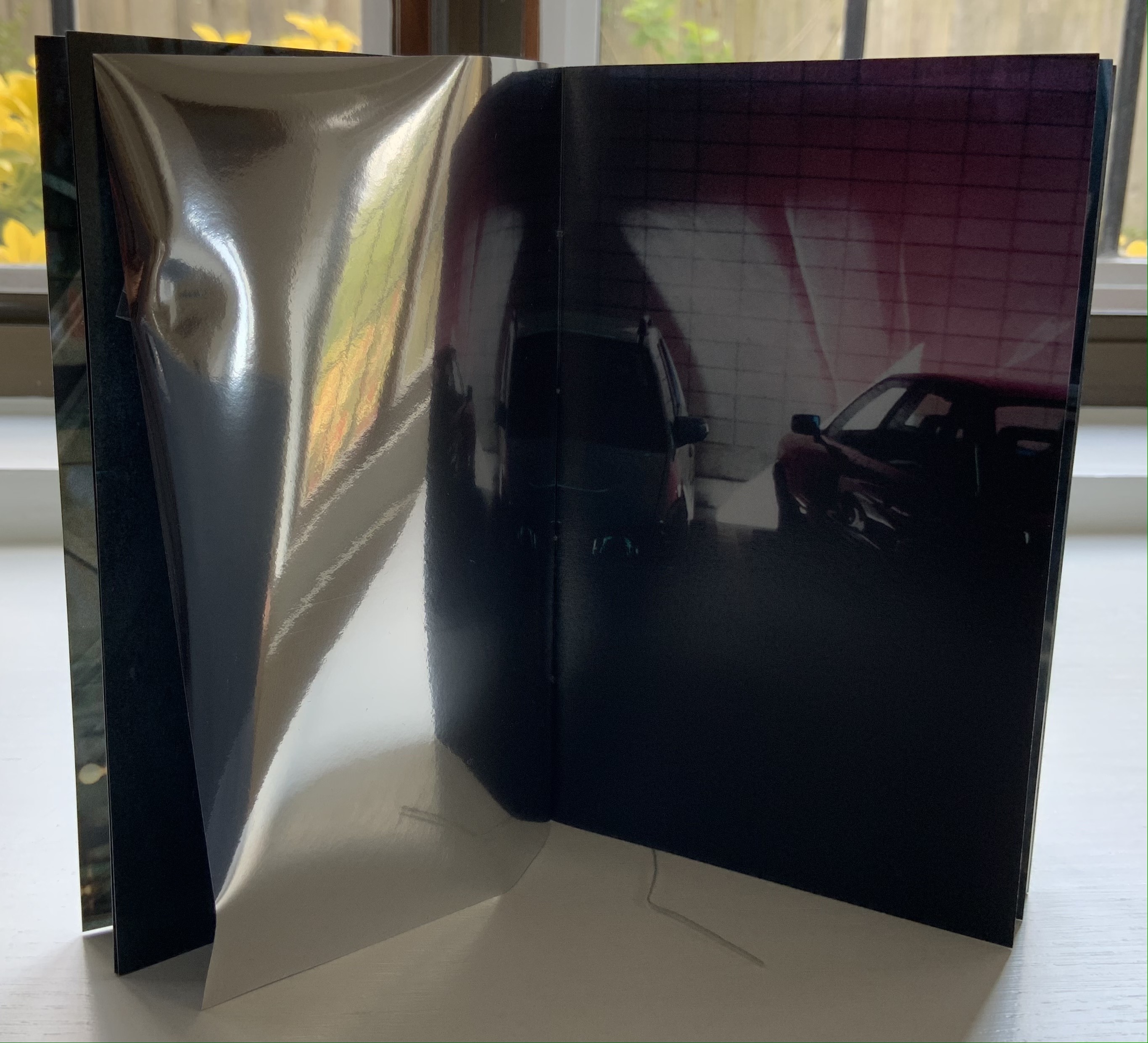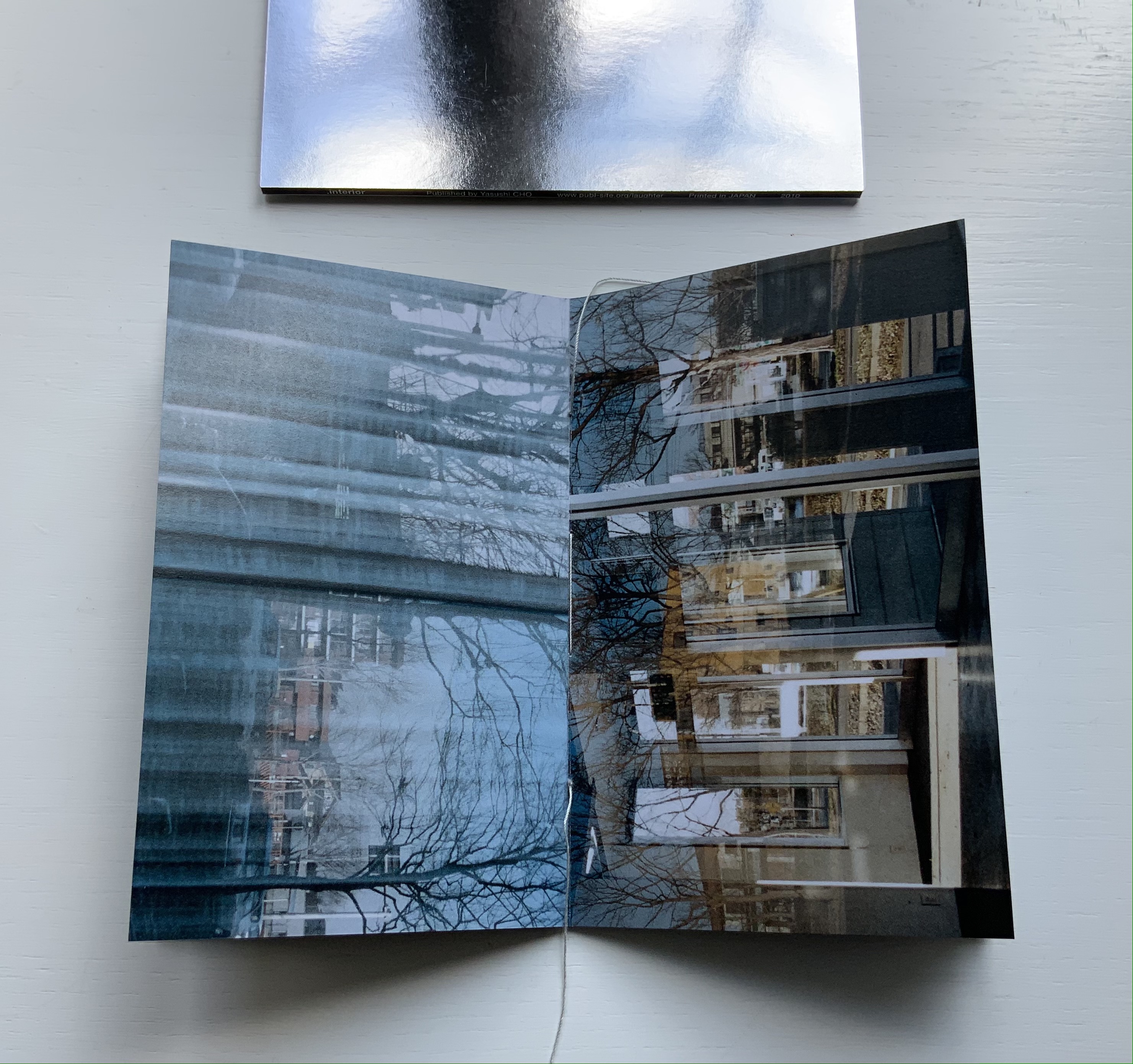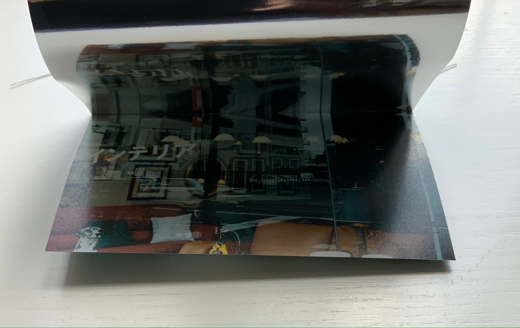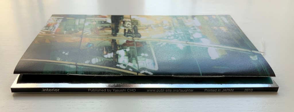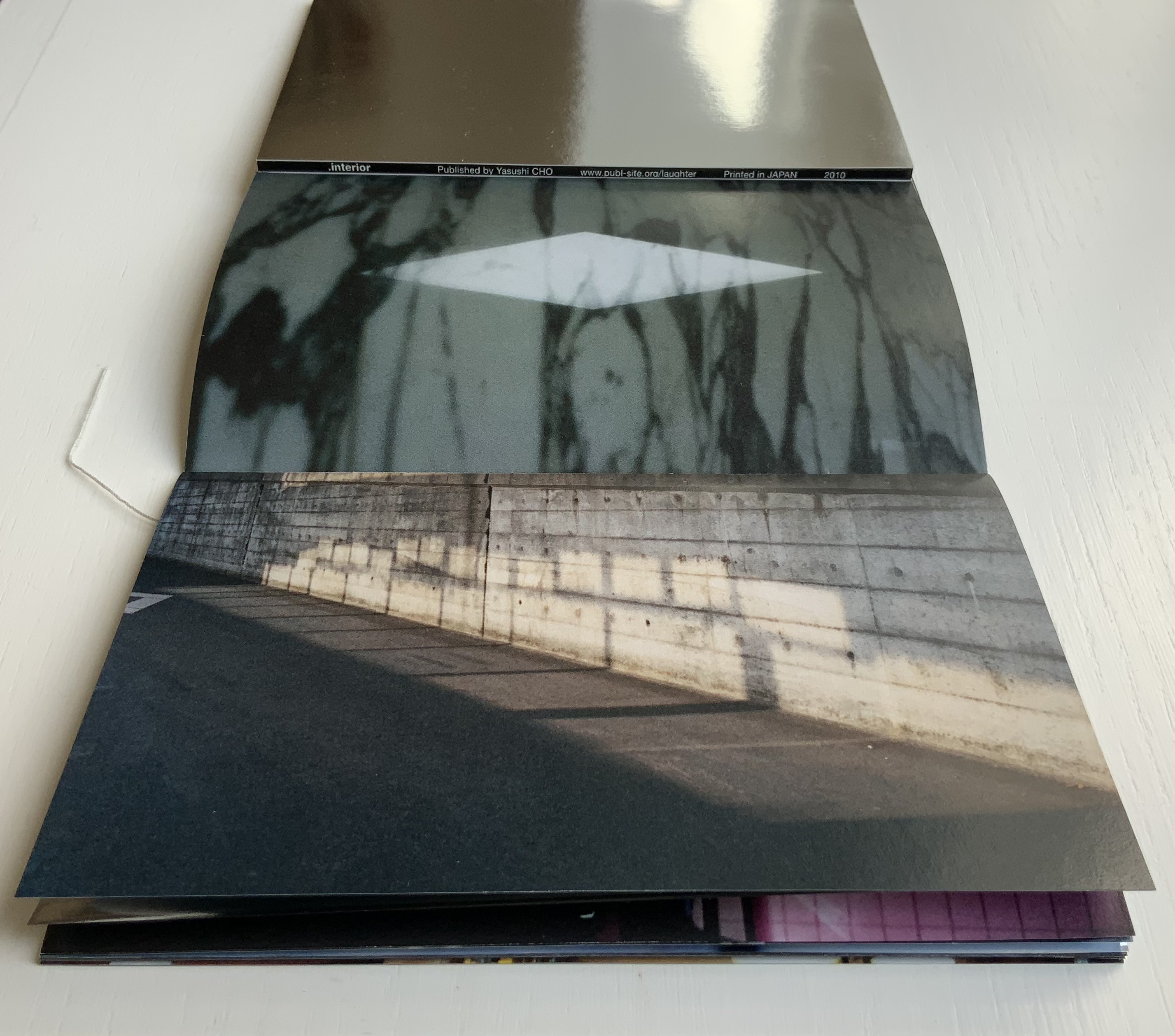 The photos in Cho’s book display views of the outside world, some of which appear to have been taken from inside an apartment whose interior is reflected in its window. Other photos display interiors — a café, an empty store — taken from an exterior vantage, resulting in reflections from the establishments’ window fronts. Some — a carpark, a walkway — seem unmediated. The playful title .interior, taken from the transposition of ・インテリア printed in the window below, and displayed on the spine of the mirrored slipcase above, confirms the artist’s theme of exploring the paradox of interior vs exterior, reflection and the mediation of vantage points.