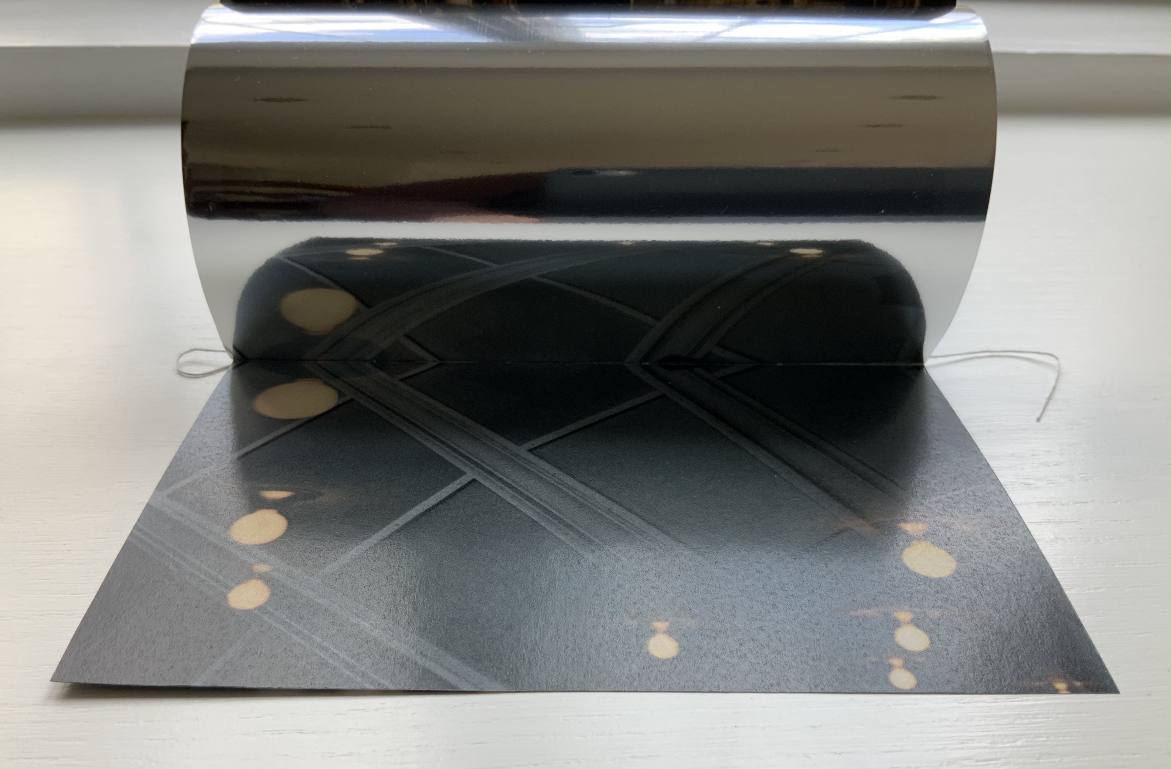 Artists’ statement: Rise is a collaborative artwork by Marlene MacCallum and Deborah Root. This piece grew out of discussions about our shared fascination with the implications and meanings of the fold. The images and poem evolved through a call and response process, sharing them back and forth. The miura fold structure was selected early on for its structural strength and the way it allowed us to take a seemingly small object that expanded quite surprisingly to reveal a large field of imagery and poetry.