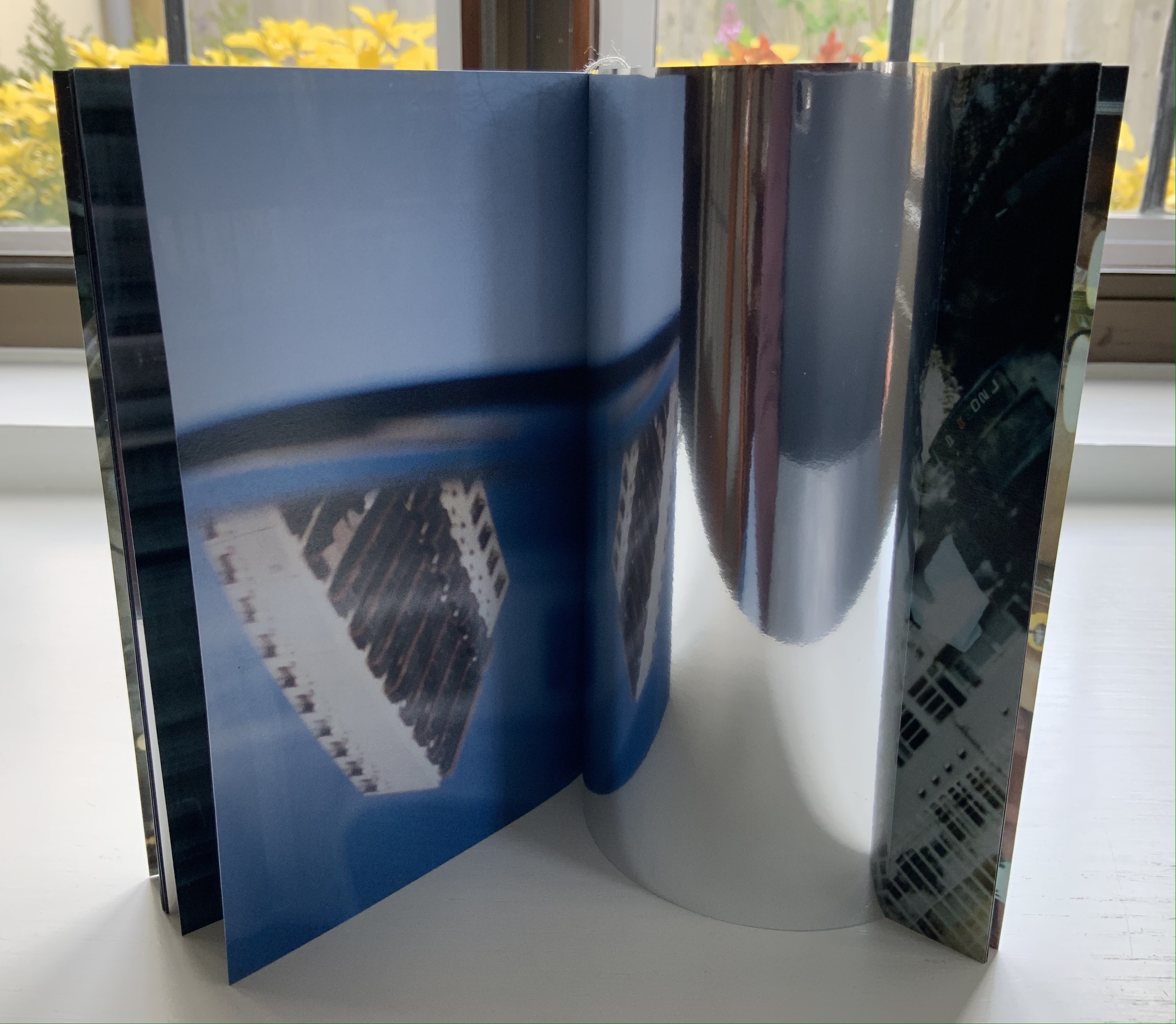 Where the recto and verso are not divided by the mirrored paper, other permutations on the theme of reflection occur. Below, in the center of the book, the window in the recto page seems to reflect the vantage point from which the verso page’s photo was taken. The virtuosity in manipulating vantage points here recalls that of Michael Snow’s Cover to Cover (1975) and Marlene MacCallum’s Theme and Permutations (2012) or Shadow Cantos(2018-19).