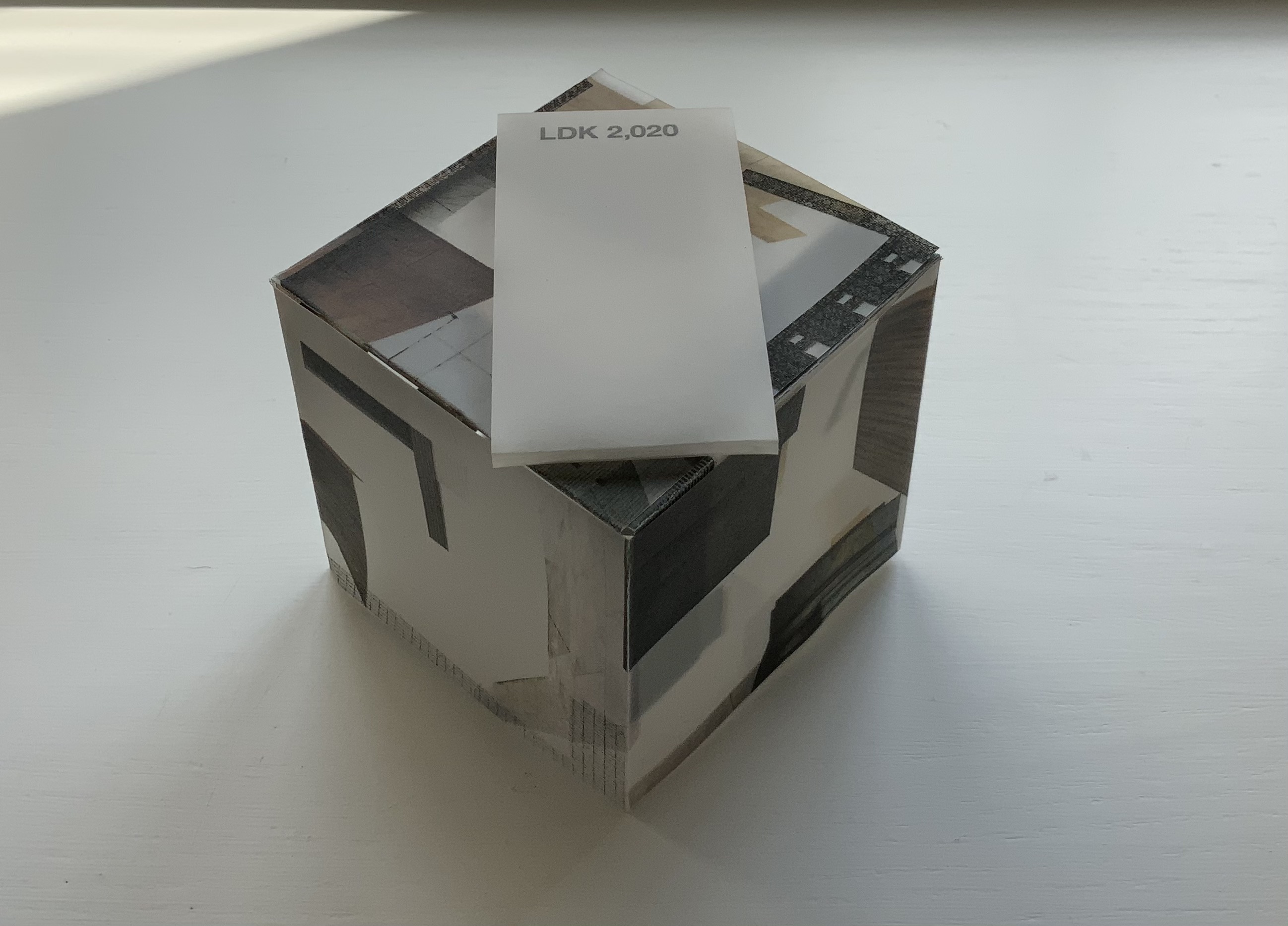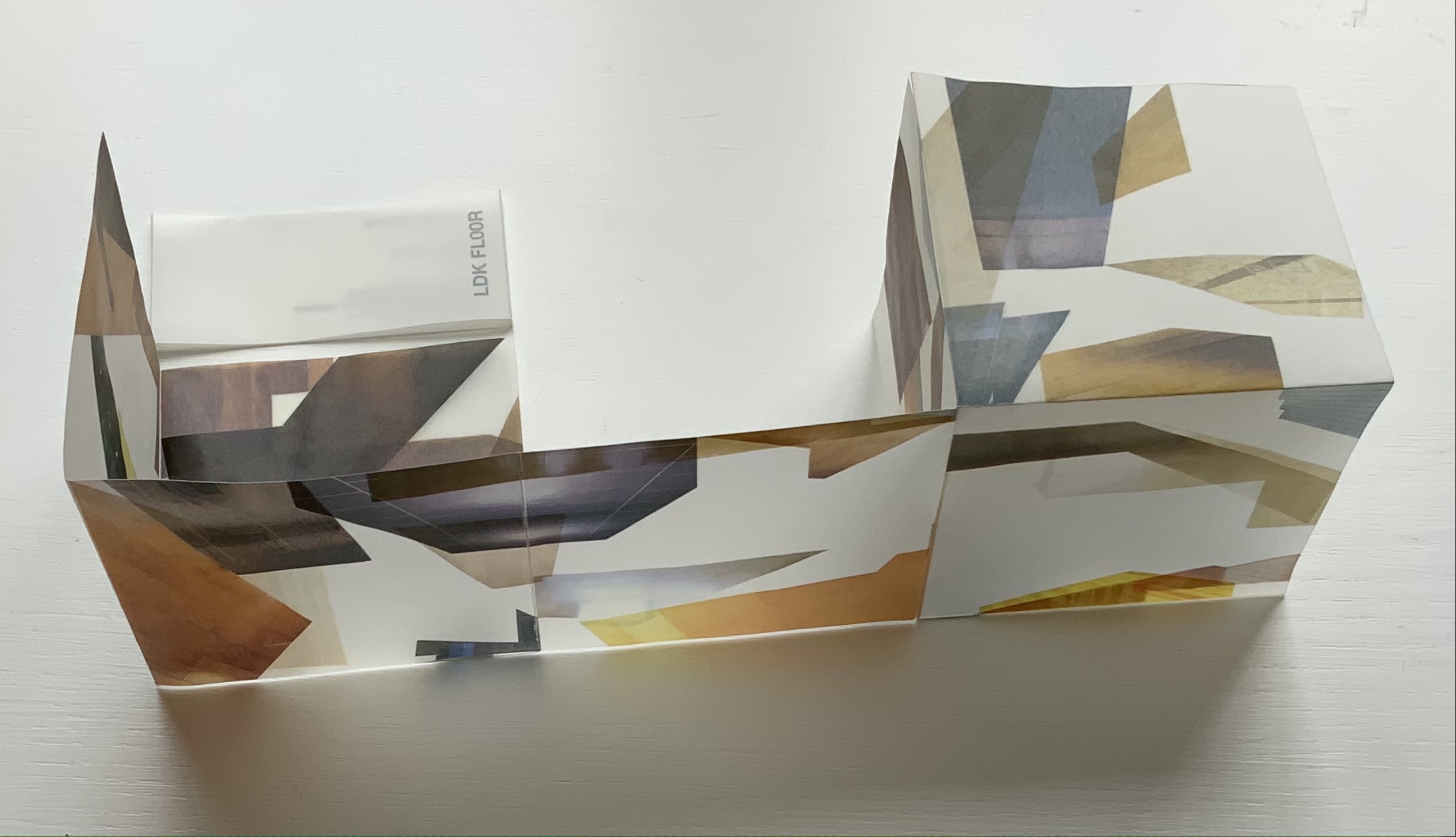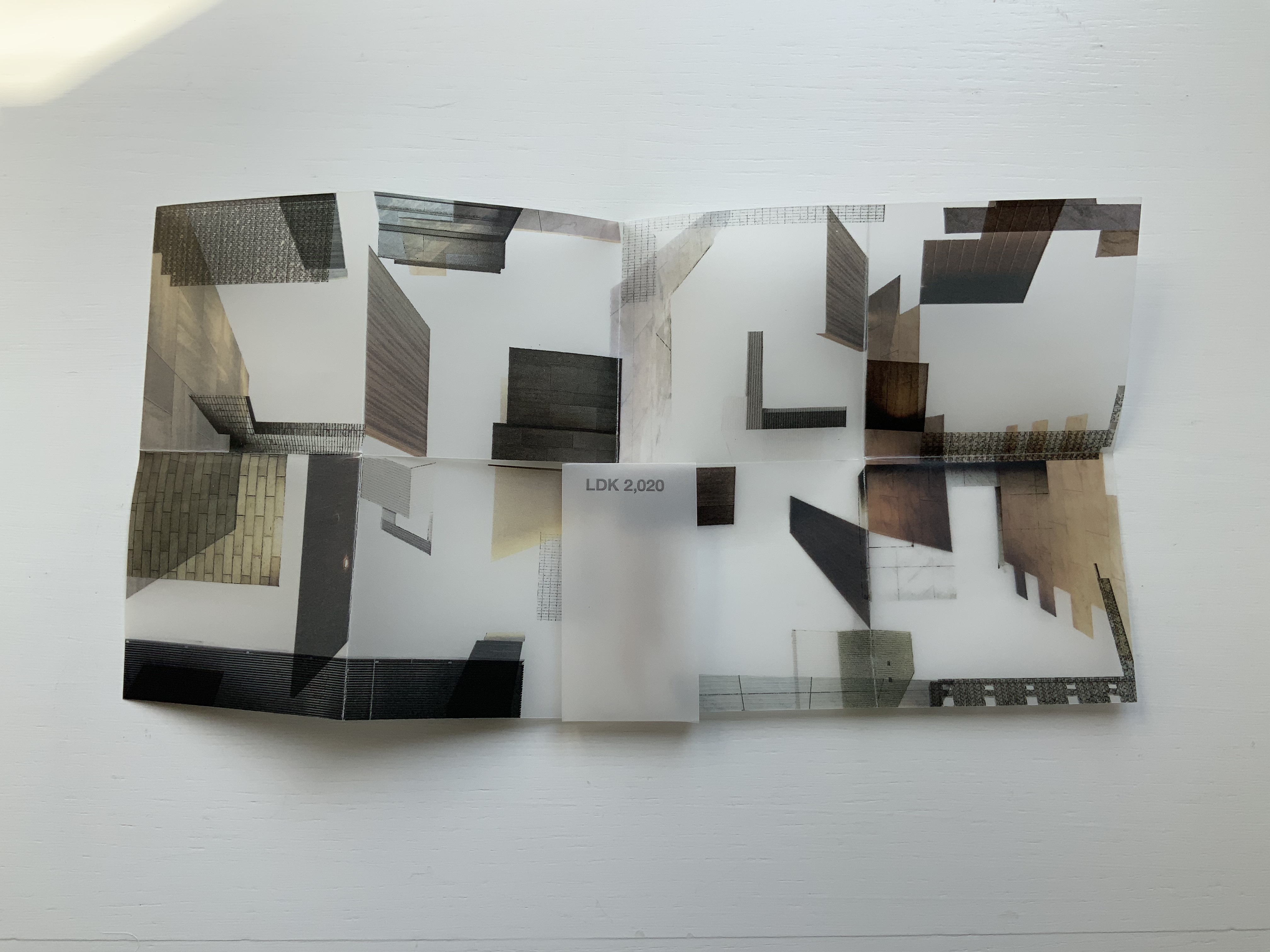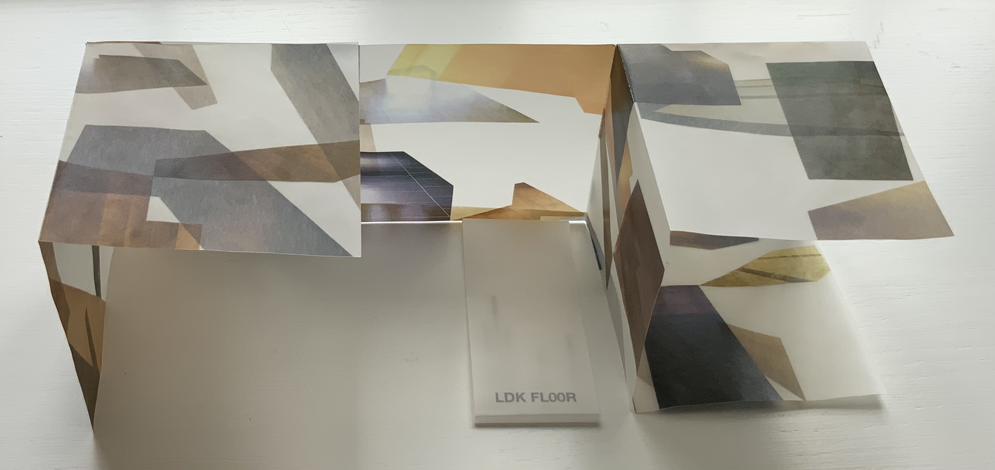 In the process of flattening the booklets into a single sheet, then folding and creasing and re-creasing, the reader wonders how the aspects of LDK may have fit together before their abstraction into the collage. Eventually though, the assembly creates objects whose interiors are their exteriors — and vice versa — and inevitably recall the shoji screens still used in traditional houses and even apartments.