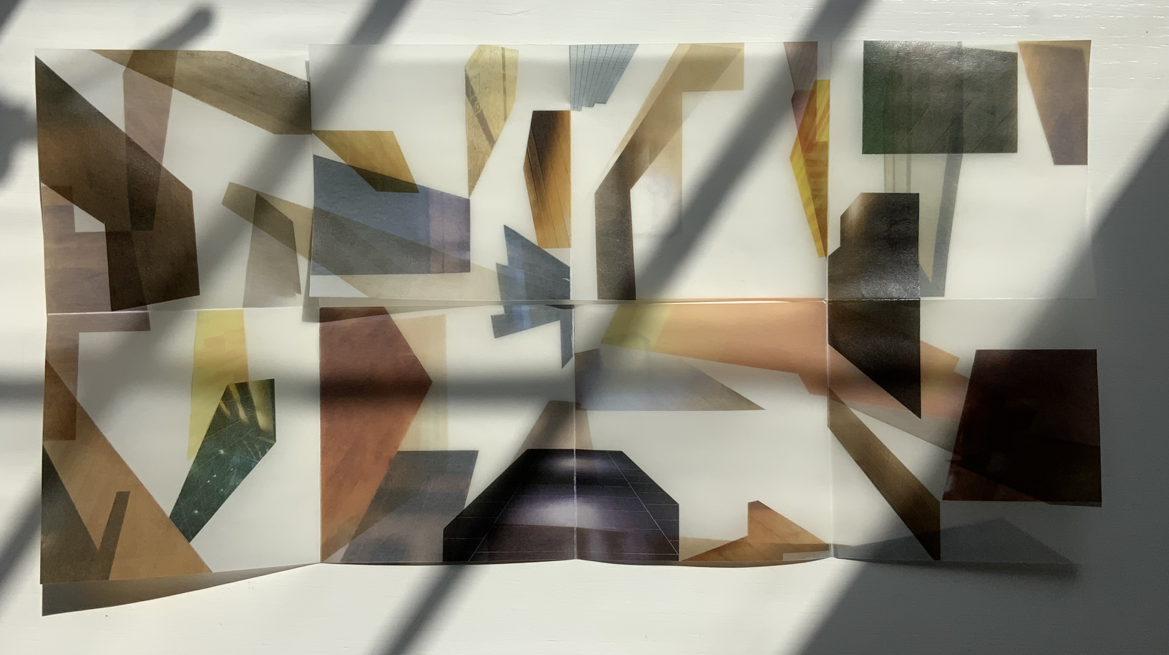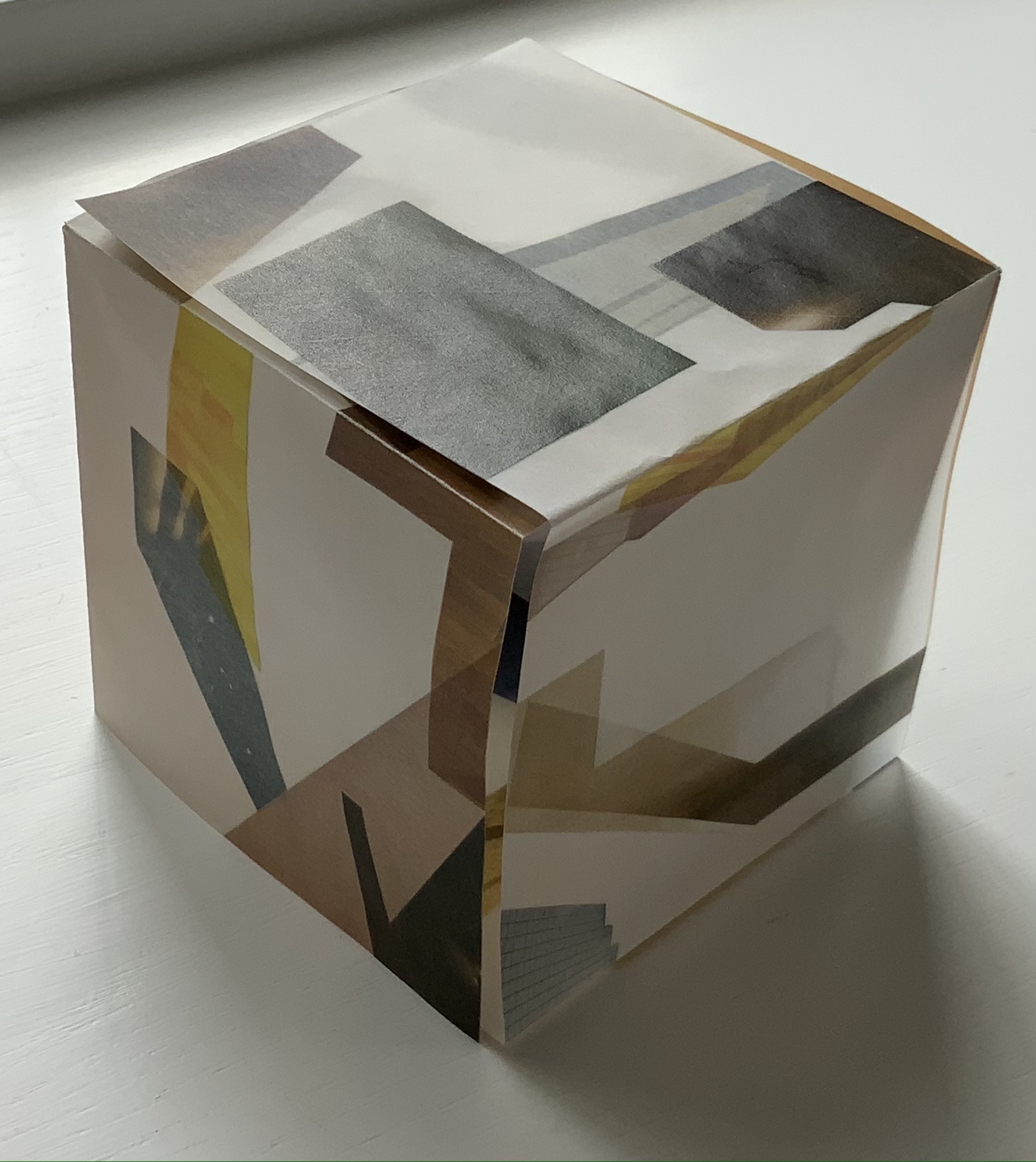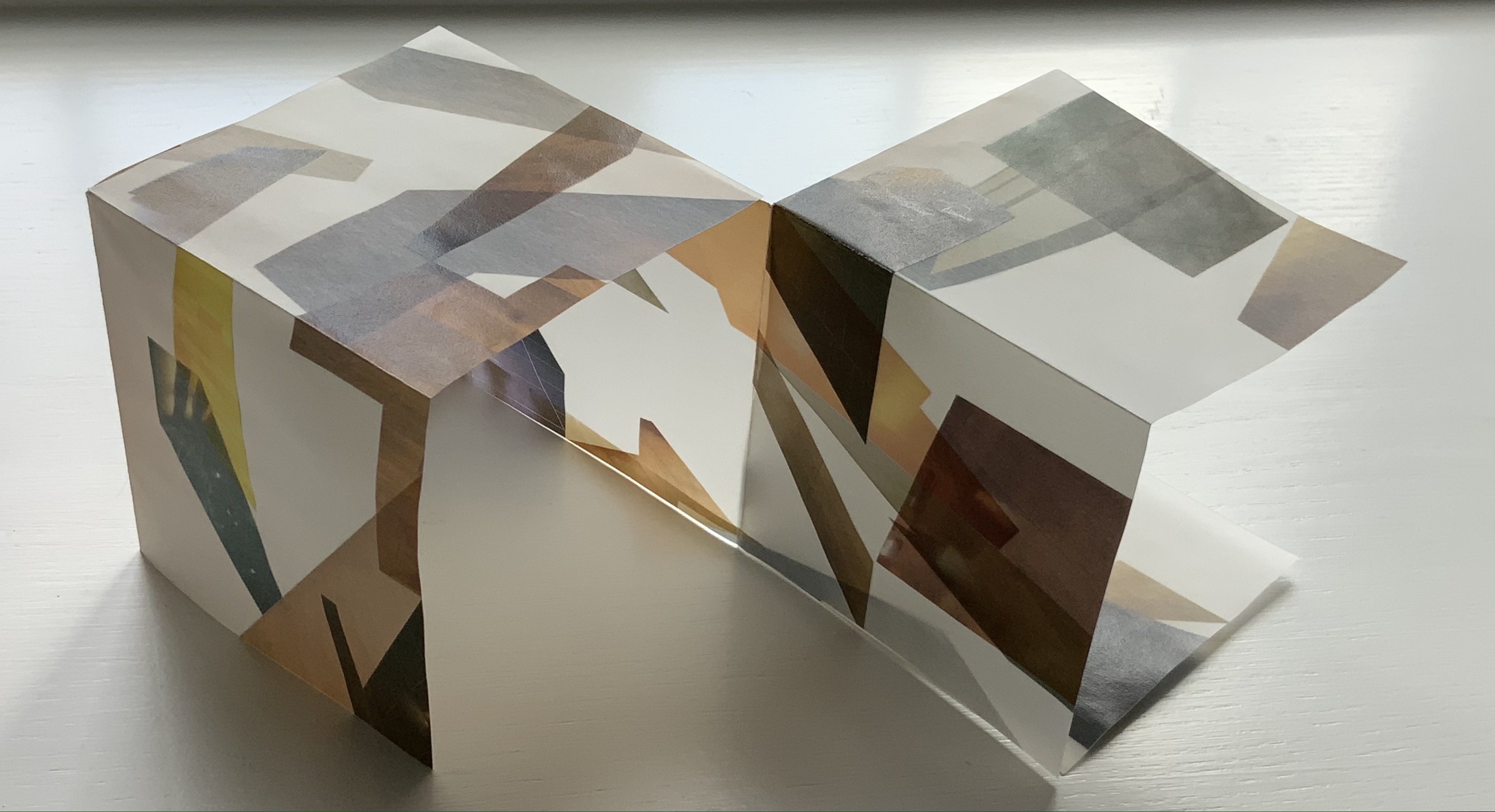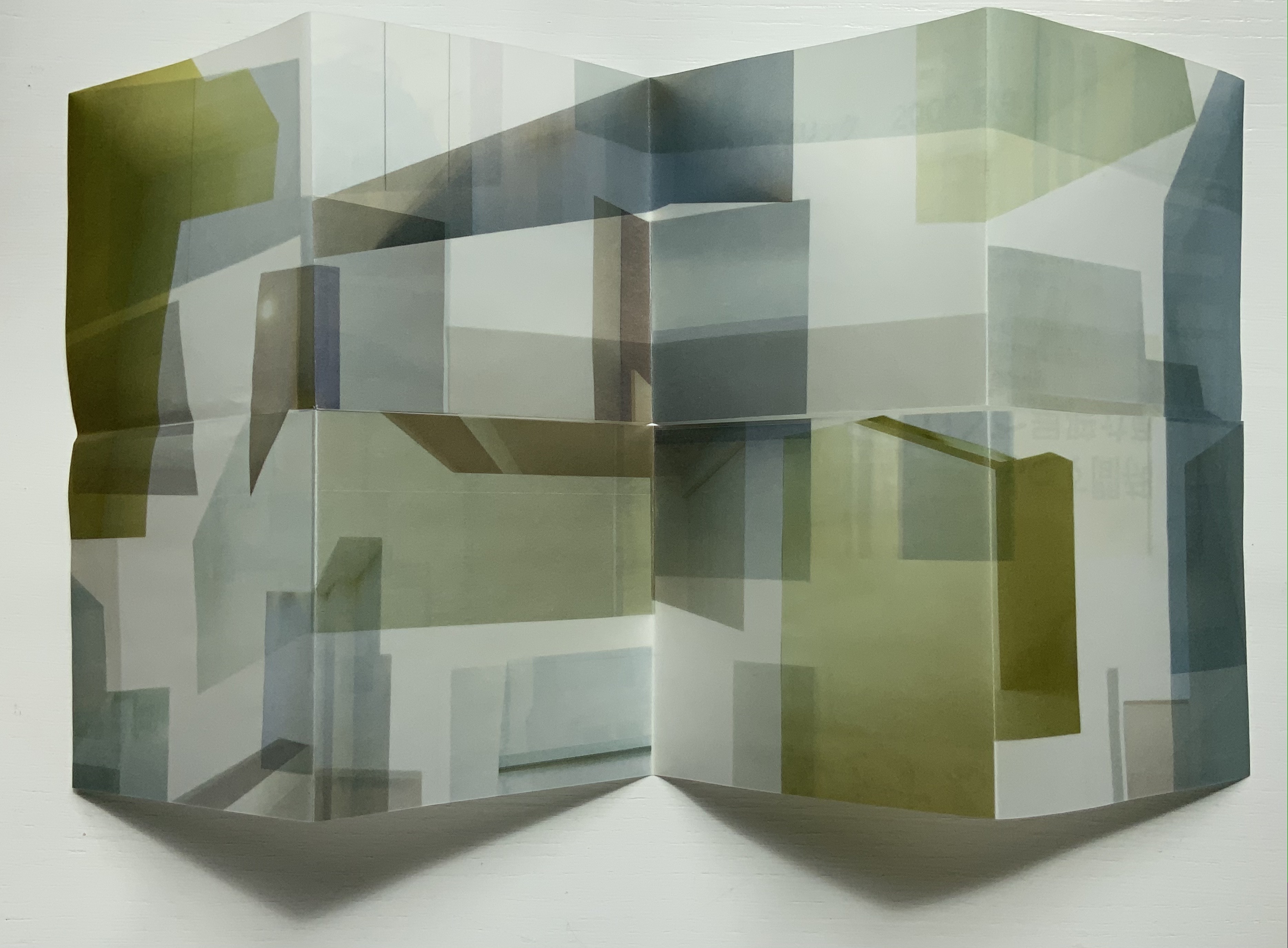 In the process of flattening the booklets into a single sheet, then folding and creasing and re-creasing, the reader wonders how the aspects of LDK may have fit together before their abstraction into the collage. Eventually though, the assembly creates objects whose interiors are their exteriors — and vice versa — and inevitably recall the shoji screens still used in traditional houses and even apartments.