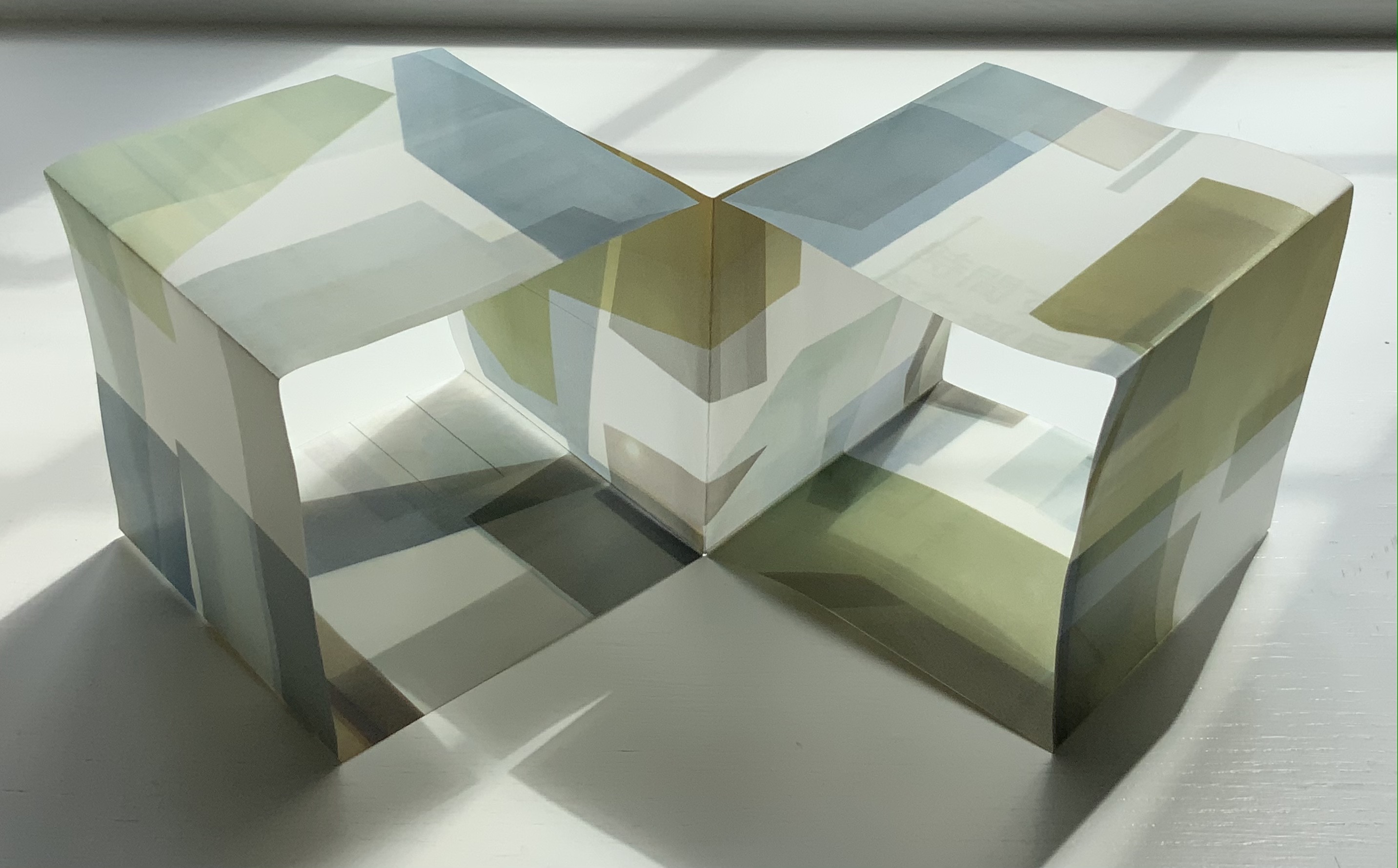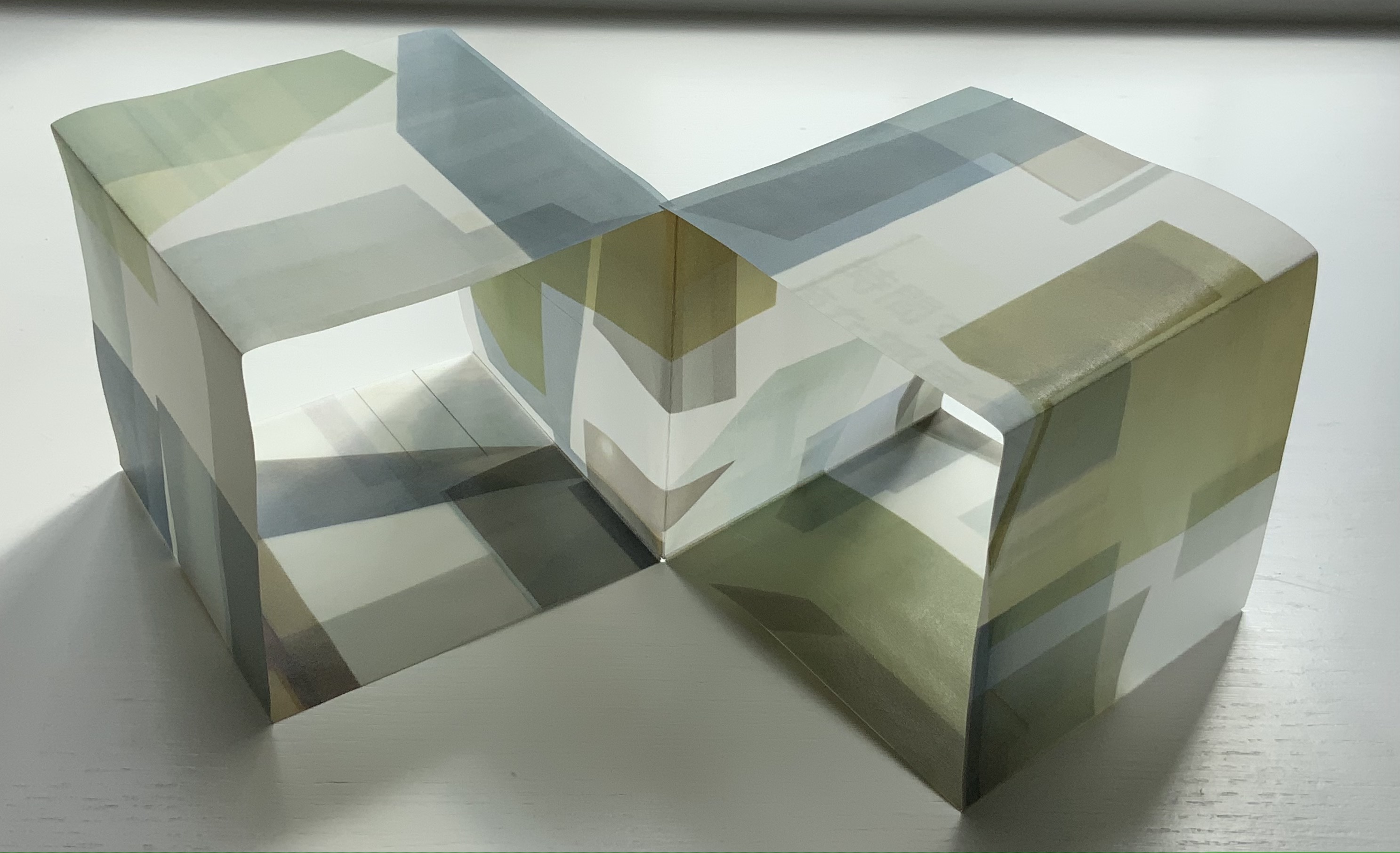 Marlene MacCallum achieves distinctive results by painting with photography and sculpting with book structure in her artist’s books. Her painting with photography has involved not only collage work but pinhole cameras, digital cameras, digital layering and masking as well as a variety of transfer processes — digital and analogue photogravure, lithography, digital pigment printing, and digital inkjet printing. Sculpting with book structure mainly includes varying the binding as in the accordion with fold-out of Obvert (1997), the tunnel book structure of Do Not Enter (1998), the gatefold of Domestic Arcana (1999), the tile format fold-outs of pink story (2004-05), the accordion of Quadrifid (2009), the dos-à-dos of Glaze: Reveal and Veiled (2013), and the Miura fold of Rise (2020). It also includes altering books as in Withdrawn (2010) and varying the substrate as in the lace paper, Moriki, double matte Mylar, Lanaquarelle, and embossed leather of Townsite House (2006) and the etched copperplate and Tyvek of Trompe l’Oreille (2011).