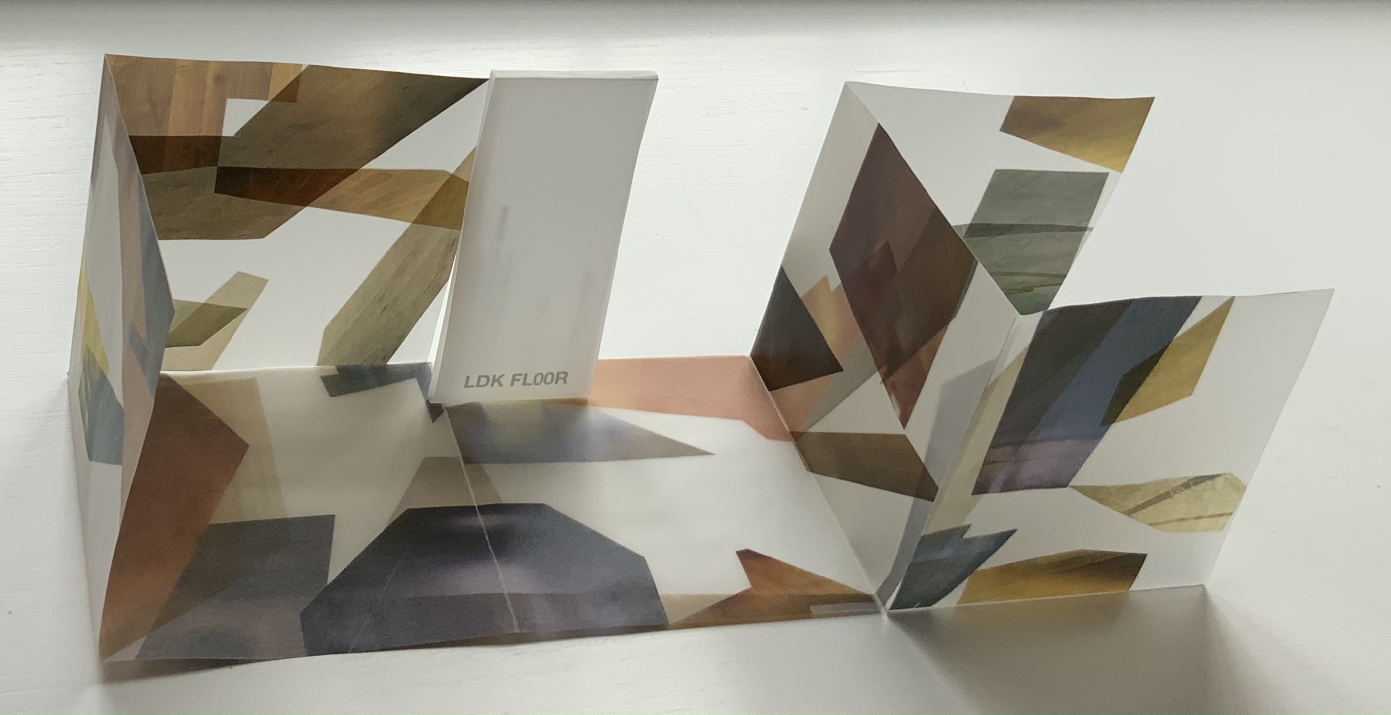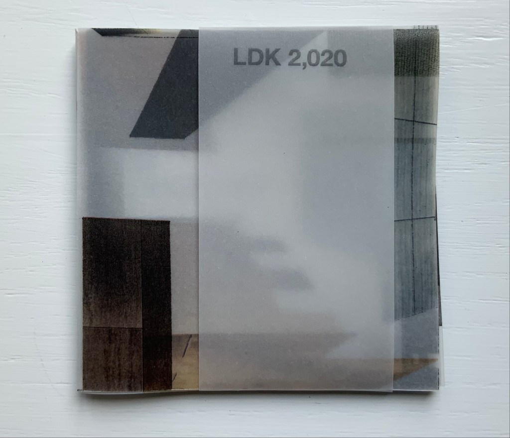 LDK 2,020, LDK FL00R and LDK 2,009 make up part of a series. Their letters L, D and K stand for Living, Dining and Kitchen and are the usual abbreviations in Japanese apartment/flat sales leaflets. Every day they arrive or can be picked up on the street, and Cho creates collages from them, digitally printing them on stiff translucent paper to be cut and creased, then folded into an accordion-style booklet. For the reader, the folds and cuts of the stiff translucent paper make a tricky “assembly and disassembly” — or reading — of the work to make it into a cube or other three-dimensional shape.
